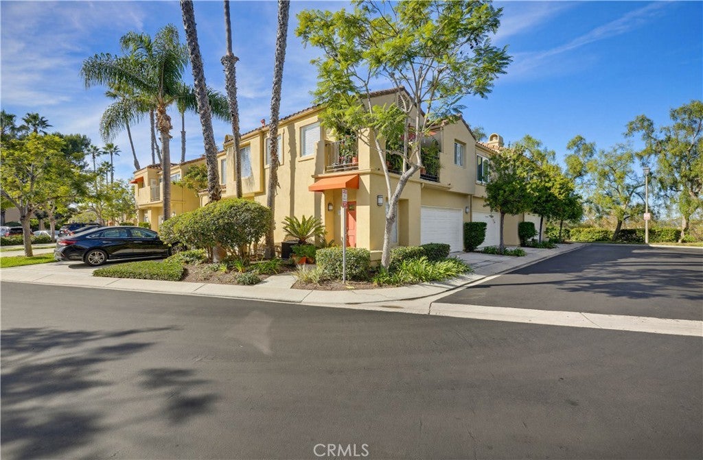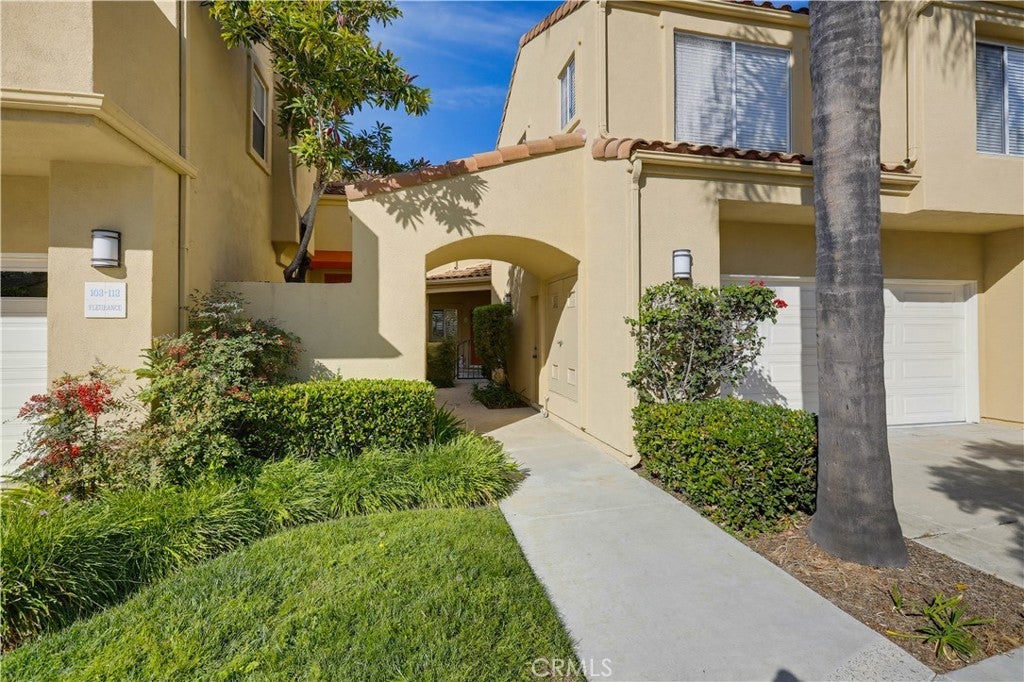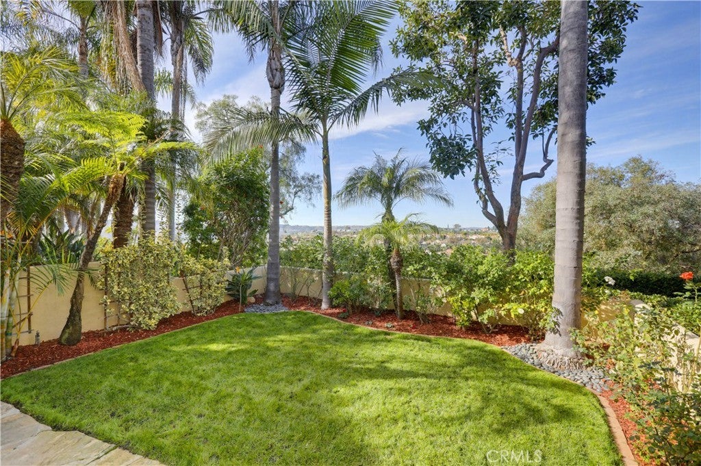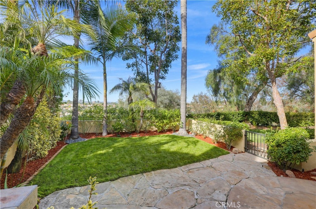 Beautifully updated end-unit home ideally situated on a lush greenbelt with sweeping sunset and rolling hill views. Set on one of the largest and most desirable lots in the Encore at Marina Hills community, this light-filled residence offers privacy, space, and an exceptional backyard oasis. An arched walkway and gated front courtyard welcome you inside to gorgeous hardwood floors throughout and crown molding. The open floor plan features a spacious living area with sit-down views and a stunning three-sided gas fireplace shared with the dining area. Two sets of sliding glass doors create seamless indoor-outdoor living. The kitchen boasts rich hardwood cabinetry, granite countertops, glass tile backsplash, recessed lighting, and stainless-steel appliances, opening perfectly to the dining area for easy entertaining. The main level includes a powder room and a laundry room. Upstairs, the freshly painted primary suite features vaulted ceilings, dual vanities, a shower/tub enclosure with bench, and a large private balcony ideal for enjoying sunsets and ocean breezes. The freshly painted secondary bedroom offers vaulted ceilings, updated dual-pane windows, and beautiful views. The expansive backyard is perched above a peaceful greenbelt and showcases a sandstone patio, built-in BBQ and bar, grassy lawn, vibrant rose bushes, and lush tropical landscaping with mature trees—perfect for relaxing or entertaining. Additional highlights include a direct-access two-car garage with built-in storage, refrigerator, washer, and dryer included, and HOA coverage for water. Encore amenities include a pool and spa, picnic areas, and close proximity to parks, trails, shopping, dining, beaches, and easy freeway and toll road access. Tenants to enjoy resort like Marina Hills Park amenities as well, including pool, clubhouse, tennis courts, playgrounds, sport courts and playing fields.