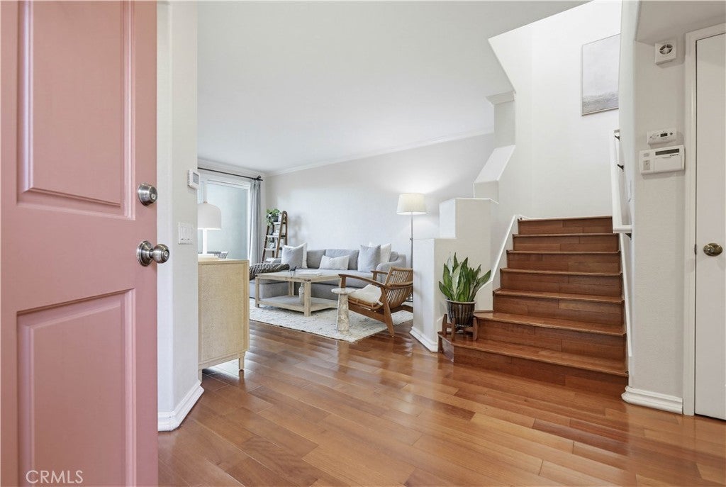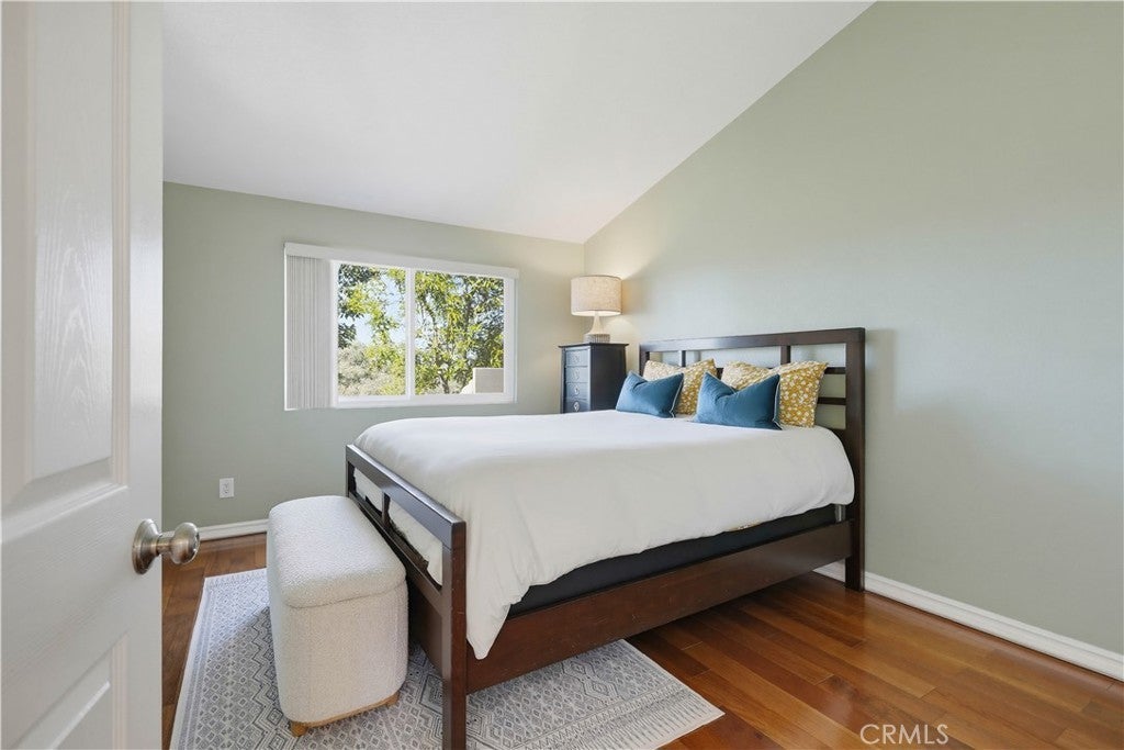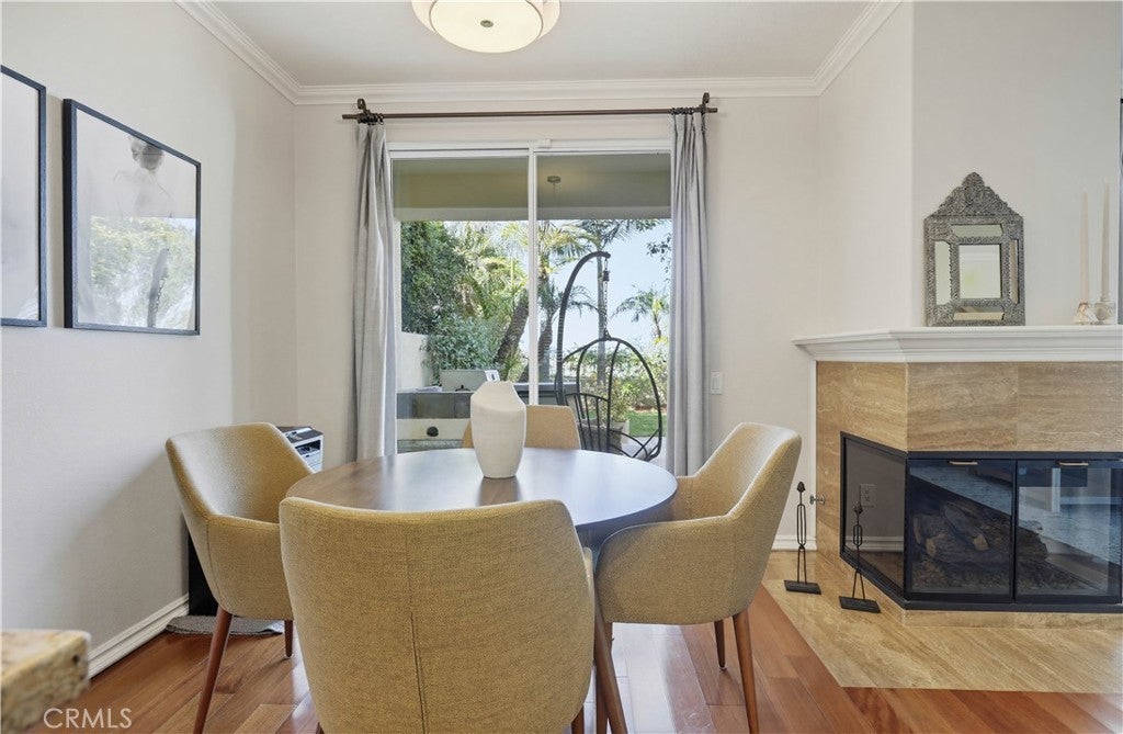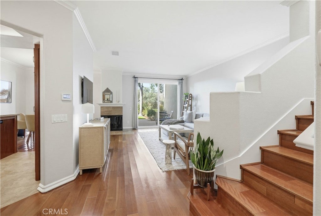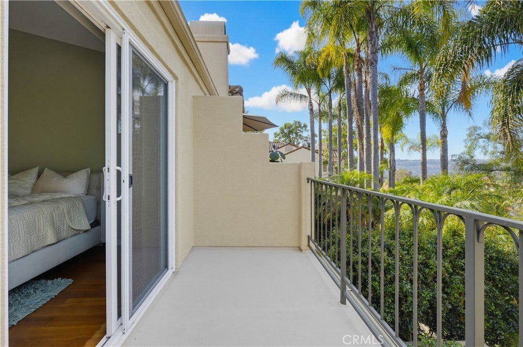 Beautifully updated end-unit home ideally situated on a lush greenbelt with sweeping sunset and rolling hill views. Set on one of the largest and most desirable lots in the Encore at Marina Hills community, this light-filled residence offers privacy, space, and an exceptional backyard oasis. An arched walkway and gated front courtyard welcome you inside to gorgeous hardwood floors throughout and crown molding. The open floor plan features a spacious living area with sit-down views and a stunning three-sided gas fireplace shared with the dining area. Two sets of sliding glass doors create seamless indoor-outdoor living. The kitchen boasts rich hardwood cabinetry, granite countertops, glass tile backsplash, recessed lighting, and stainless-steel appliances, opening perfectly to the dining area for easy entertaining. The main level includes a powder room and a laundry room. Upstairs, the freshly painted primary suite features vaulted ceilings, dual vanities, a shower/tub enclosure with bench, and a large private balcony ideal for enjoying sunsets and ocean breezes. The freshly painted secondary bedroom offers vaulted ceilings, updated dual-pane windows, and beautiful views. The expansive backyard is perched above a peaceful greenbelt and showcases a sandstone patio, built-in BBQ and bar, grassy lawn, vibrant rose bushes, and lush tropical landscaping with mature trees—perfect for relaxing or entertaining. Additional highlights include a direct-access two-car garage with built-in storage, refrigerator, washer, and dryer included, and HOA coverage for water. Encore amenities include a pool and spa, picnic areas, and close proximity to parks, trails, shopping, dining, beaches, and easy freeway and toll road access. Tenants to enjoy resort like Marina Hills Park amenities as well, including pool, clubhouse, tennis courts, playgrounds, sport courts and playing fields.