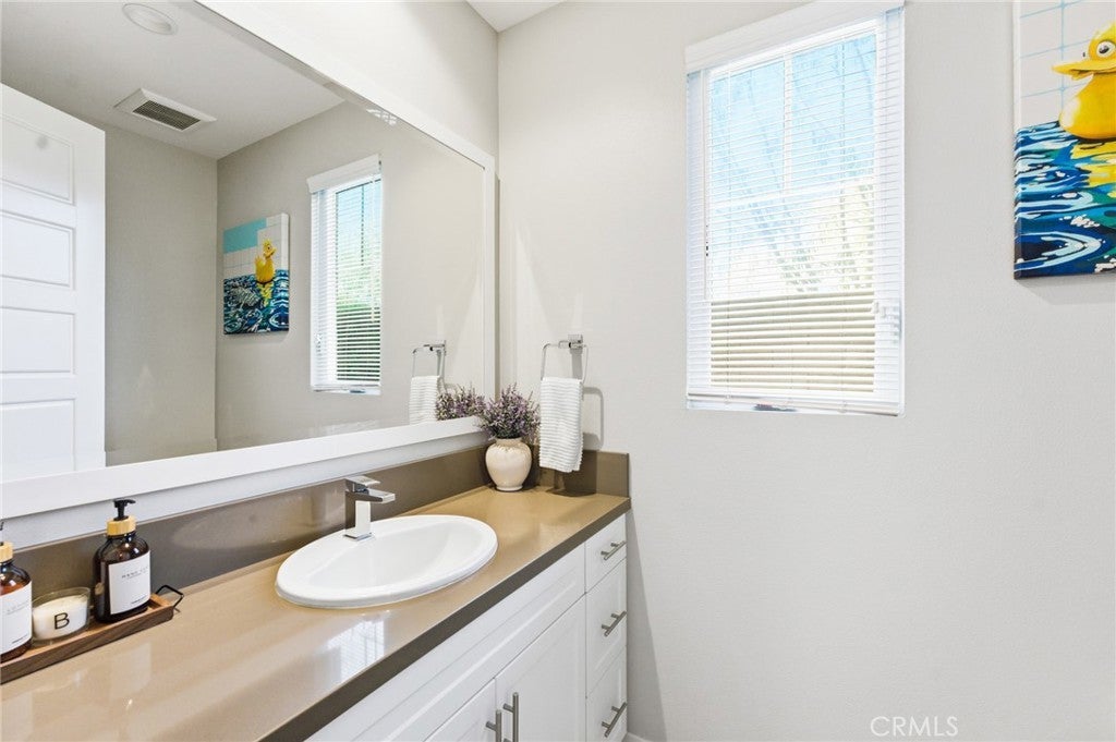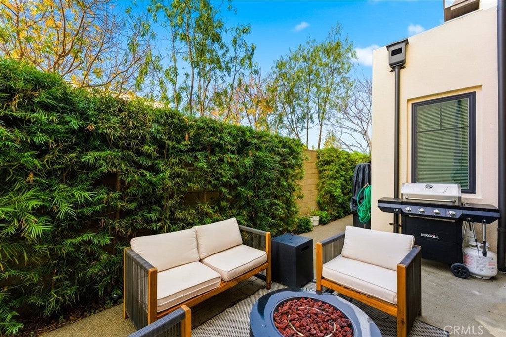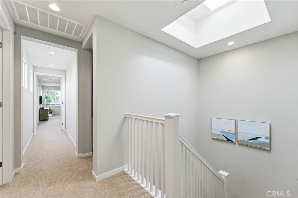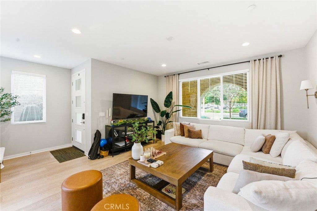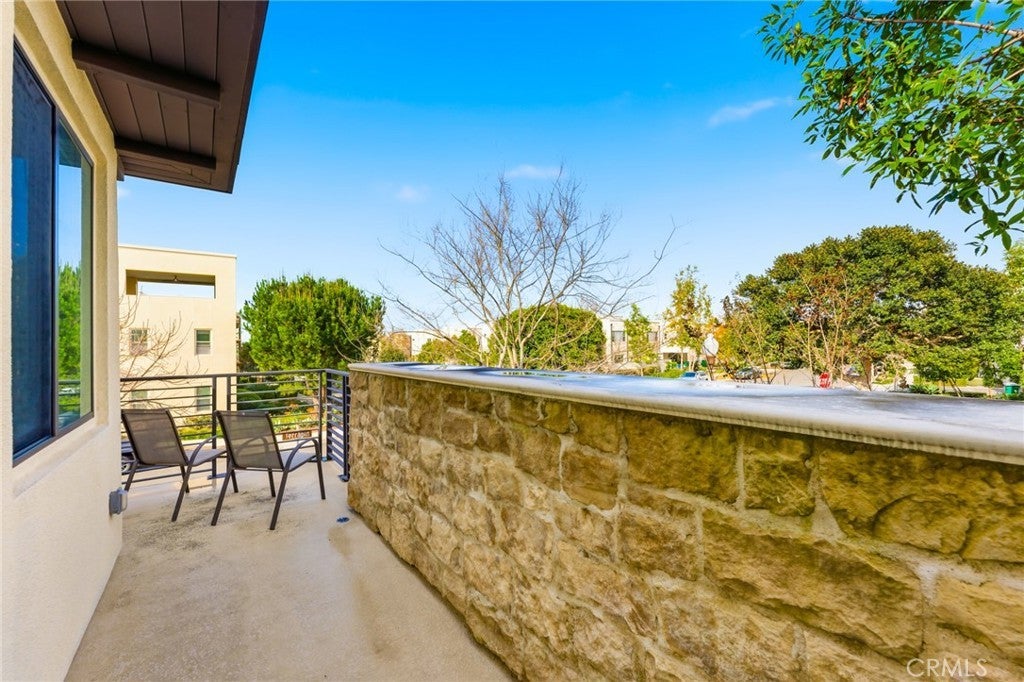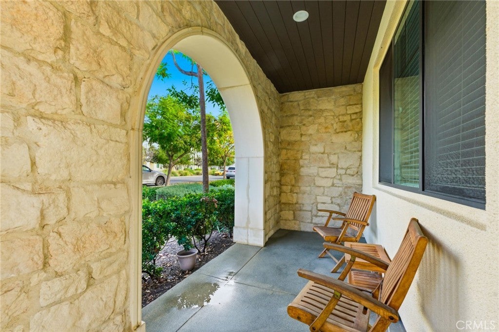 A rare-unit opportunity with true indoor–outdoor living in the heart of Parasol Park. Set on a quiet, tree-lined street, this well-kept home offers privacy, natural light, and a layout that truly works. With only one shared wall situated on a desirable corner lot, the home feels open without sacrificing comfort. The main level features an open floor plan with hardwood floors, recessed lighting throughout, and multiple upgrades. The kitchen is clean and modern with white cabinetry, quartz countertops, stainless steel appliances, and a large island ideal for everyday living or entertaining. A wide dual-panel sliding glass door system, where both doors slide open in an accordion style, creates an expansive opening to the patio and delivers a true indoor–outdoor living experience. Upstairs, the primary suite is bright, spacious, and comfortable, with a well-appointed bath, dual vanities, and a wrap-around balcony with open views, perfect for morning coffee or winding down in the evening. Down the hall you will find two secondary bedrooms that are nicely sized and flexible for guests, an office, or additional living space. Laundry is conveniently located upstairs, along with ample storage. The corner setting adds curb appeal and a sense of privacy, with landscaped walkways and a front porch that acts as a welcoming entry. The home has been thoughtfully maintained and is move-in ready. Enjoy walking or biking access to pools, parks, playgrounds, sports courts, clubhouse amenities, and highly regarded Irvine schools, all within the Great Park community. Welcome home!