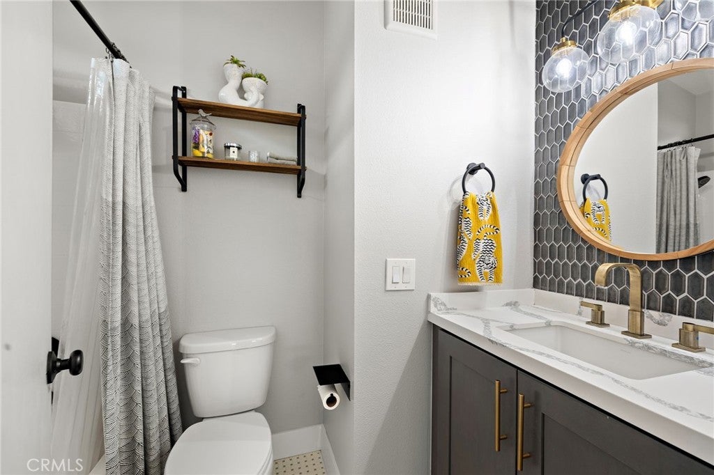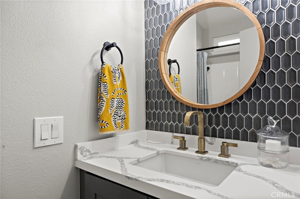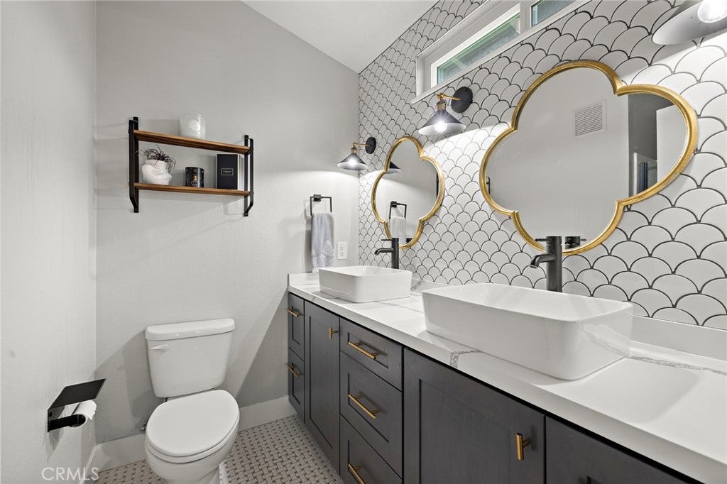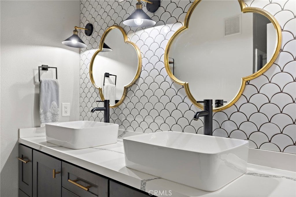 Modern elegance and effortless comfort blend seamlessly in this reimagined corner residence, where every detail has been thoughtfully curated to create a home that's as inviting as it is sophisticated. From the moment you step inside, you're welcomed by a flood of natural light streaming through the upgraded double pane windows and a sleek sliding door, highlighting the gorgeous laminate wood flooring and custom designer paint. Clean lines and timeless finishes set the tone for a bright, polished living space. To top it off, this home offers stunning views of El Niguel Golf Course and the majestic Saddleback Mountains, creating a picturesque backdrop. The main living level is ideal for entertaining, offering an open, light-filled layout complemented by elevated finishes and a stylish powder room. Upstairs, two spacious primary-style suites each feature their own fully upgraded bathrooms, creating a private and serene retreat for residents or guests alike. The primary suite is nothing short of a retreat. Vaulted ceilings and serene views create a tranquil ambiance, while the spa-like en suite bathroom delivers pure luxury with custom double sinks, elegant mirrors, and intricate tile flooring. At the heart of the home, the highly upgraded kitchen is a chef’s dream. Stainless steel appliances, quartz countertops, and soft-close cabinetry maximize both style and functionality, while a designer sink, faucet, and a decorative tile backsplash add an extra layer of sophistication. Convenience is key, with an upstairs laundry area, a one-car garage located close to the unit, and an additional permitted open parking space. La Vista residents also enjoy access to resort-style amenities, including a community pool, spa, and gym along with the unbeatable proximity to some of Southern California’s most picturesque beaches, Salt Creek, Dana Point, and Laguna Beach are all just minutes away. Whether it's the modern finishes, the prime location, or the seamless blend of comfort and sophistication, this home is a rare gem. Come see it in person and experience its charm firsthand!