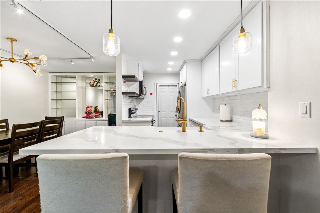 Step into comfort and serenity with this highly sought-after 3-bedroom, 2-bathroom condo located in the peaceful, gated community of El Dorado Lakes. Tucked away in a tranquil enclave surrounded by lush landscaping and scenic lake views, this beautifully maintained home offers the perfect blend of modern updates and resort-style living. Inside, you’ll find a spacious and light-filled layout featuring new luxury vinyl plank flooring throughout. The inviting living room boasts a cozy tiled fireplace, plantation shutters, and sliding glass doors that lead to a large private patio—ideal for relaxing or entertaining with views of the manicured grounds. The remodeled kitchen is a chef’s delight, showcasing sleek quartz countertops, crisp white cabinetry, stylish gold hardware, eye-catching pendant lighting over the breakfast bar, and stainless-steel appliances including a full-size dishwasher and built-in microwave. The adjacent dining area is perfect for gatherings, complete with elegant built-in mirrored china cabinets offering both style and storage. Retreat to the primary suite featuring a walk-in closet, additional linen storage, and a private en-suite bath. The second bedroom includes a mirrored closet, while the third bedroom is flooded with natural light and enjoys private patio access with peaceful greenbelt views. A built-in A/C wall unit ensures year-round comfort. Enjoy the convenience of a 2-car attached garage with direct access plus an additional assigned parking spot nearby. Resort-style amenities include 2 swimming pools and 2 spas, 2 tennis courts, Gated entry with controlled access, clubhouse with exercise room, sauna, library, billiards and ping pong tables, and outdoor deck with pretty lake views. Unbeatable location! Walk to El Dorado Park, nature center, dog park, and golf course, or hop on the nearby bike trail to the beach. Conveniently close to shopping, dining and easy access to 605 & 405 freeways.