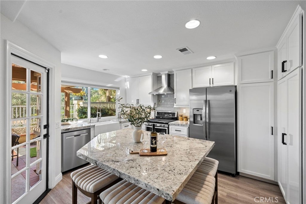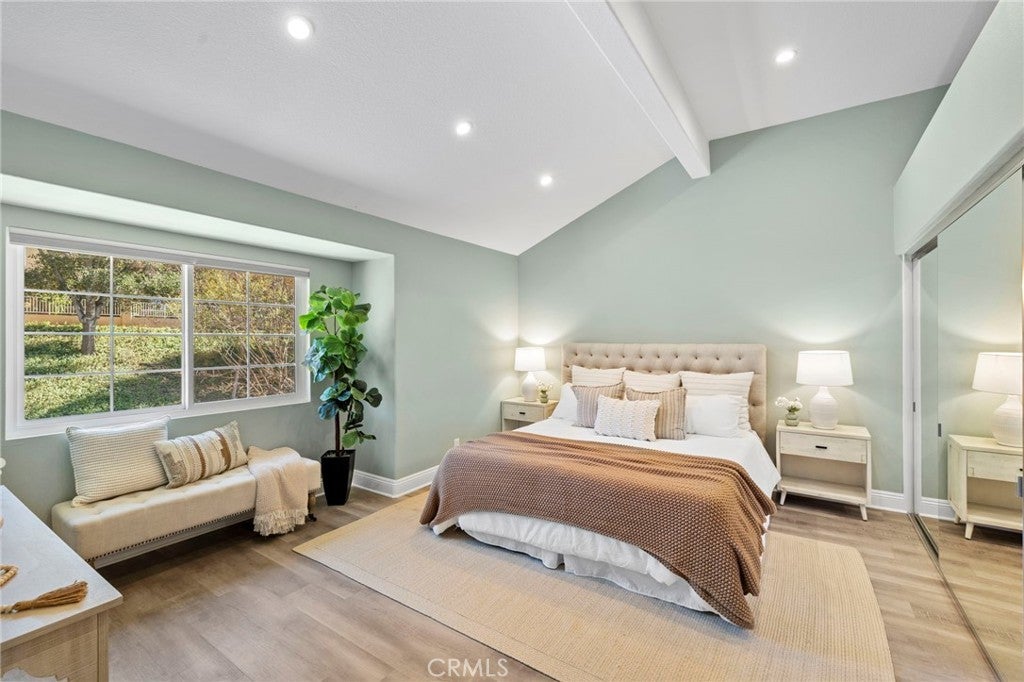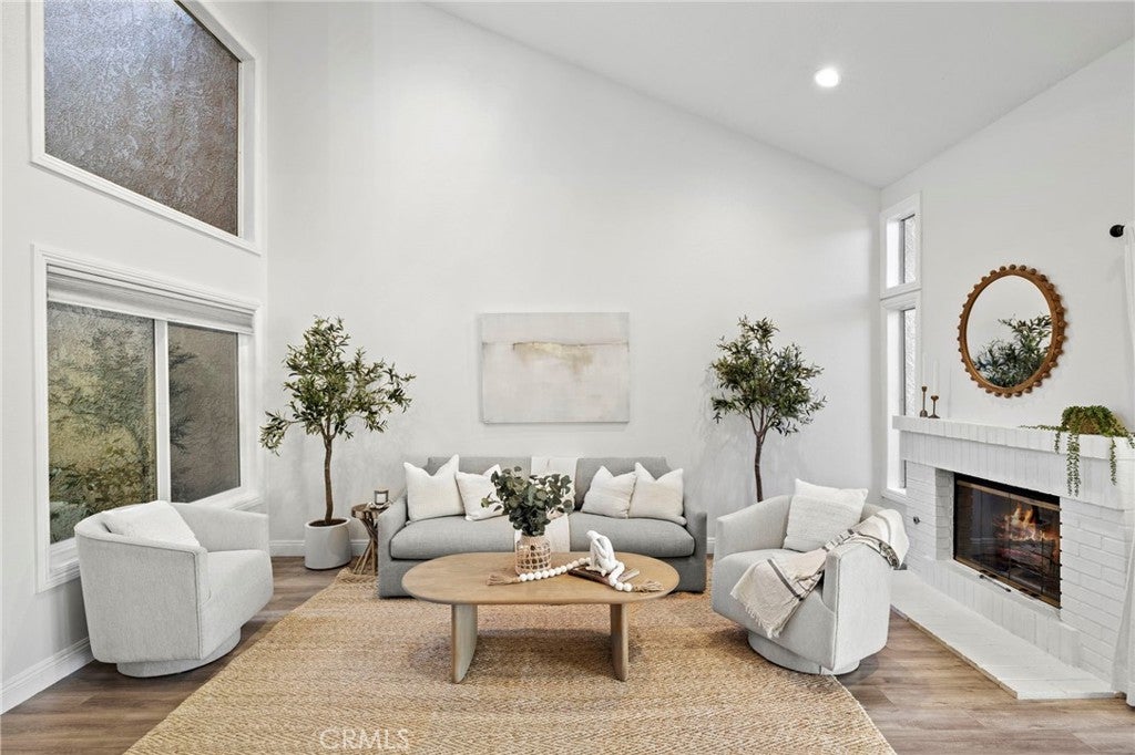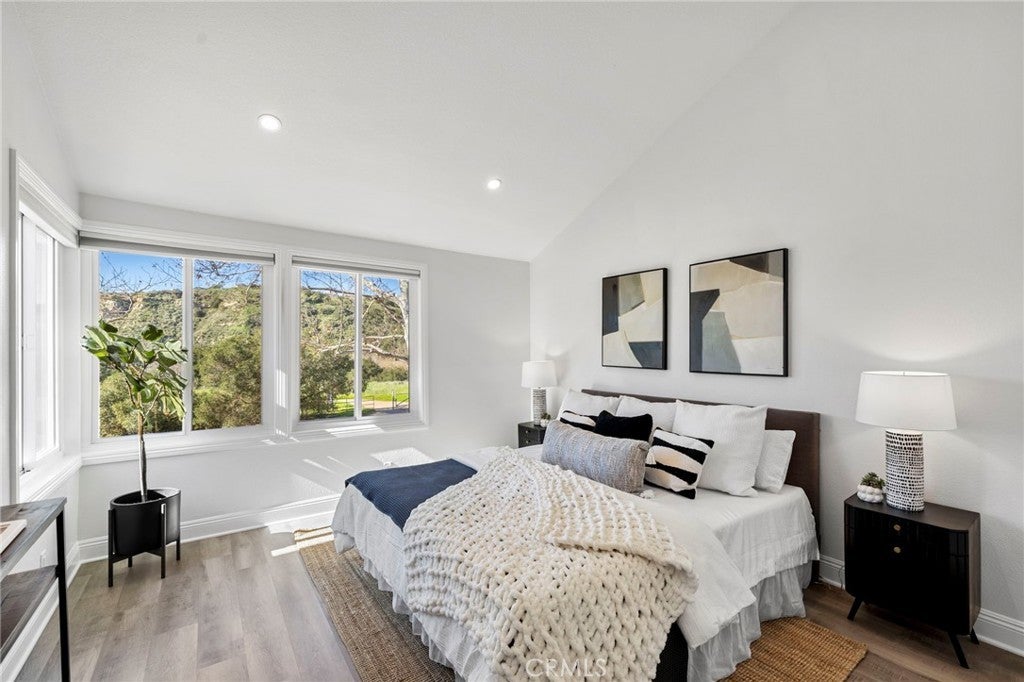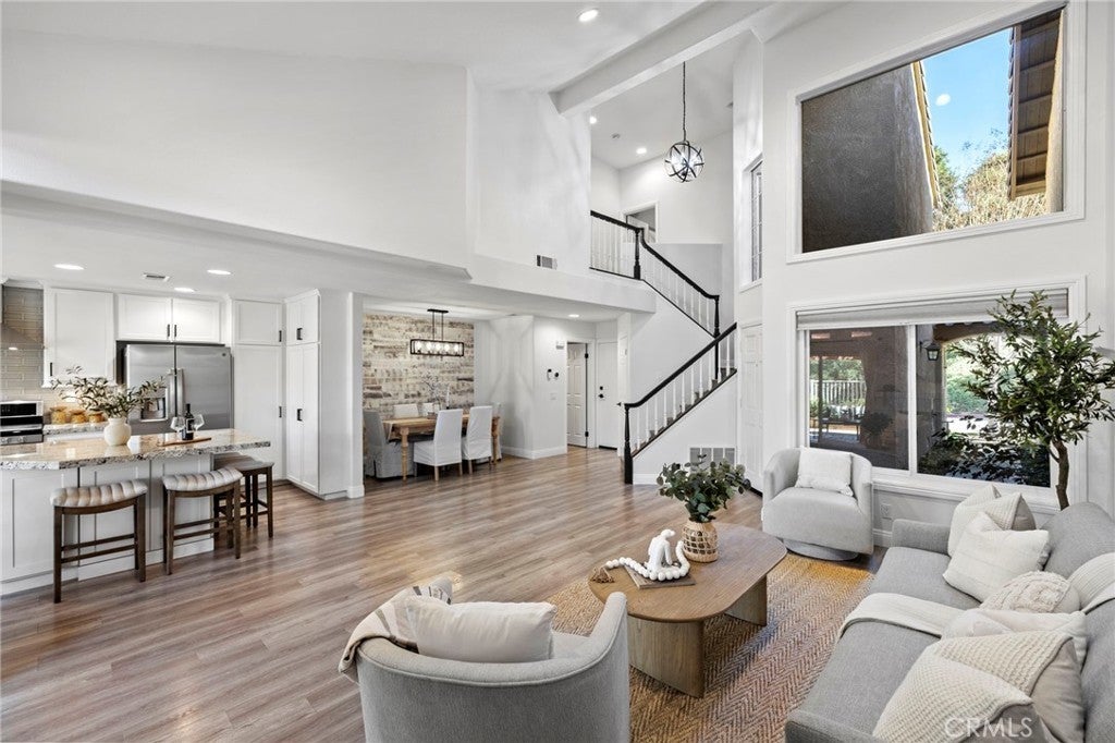 Ideally located just steps from Tijeras Creek Golf Club, this beautifully upgraded Tierra Linda townhome is an exceptional opportunity to enjoy comfortable, low-maintenance living in a highly desirable Rancho Santa Margarita community. The moment you step inside, you’re greeted with soaring vaulted ceilings, large windows and sliders allowing natural light to pour right in. The spacious living room features a cozy gas fireplace and opens effortlessly to the dining area and kitchen, providing a functional and inviting layout. The kitchen is highlighted by stainless steel appliances, white shaker cabinetry, farm sink, subway tile, granite countertops, and a generous island that provides additional storage, bar seating for four and prep space. This unit features a rare and fully open-concept great room - a huge upgrade from the original model. The living space, kitchen, and dining share one room with no interfering beams or walls creating one impressive living area with 2-story ceilings. A convenient powder room on the main level services the great room with direct garage access. The private outdoor area has been thoughtfully updated with fresh landscaping, a newly-constructed pergola, and a new patio door while providing picturesque views of the surrounding hills. Upstairs, you’ll find two generously-sized primary bedrooms that have been updated with luxury vinyl plank flooring. The rear suite offers vaulted ceilings and major views out to open, undeveloped land with a major trail system. The front bedroom is also very spacious with vaulted ceilings and mirrored closet doors. Each bedroom offers a private en-suite bathroom and ample closet space (the rear features a large walk-in). Both bathrooms are well-appointed with ample counter space and storage. The rear has a walk-in shower and the front offers a shower and tub. Other upgrades include a new HVAC system, fully re-piped, luxury vinyl plank flooring on the stairs and entire second level, and select windows have been replaced. Enjoy a community in top condition, with the exterior being recently painted and the HOA currently in the process of completing a re-roofing project across the neighborhood. All residents also have access to premium amenities including a pool, spa, BBQ area, sport courts, and full SAMLARC privileges. Ideally located near award-winning schools, scenic parks, dining, shopping, and major commuting routes, this turnkey property is move-in ready!