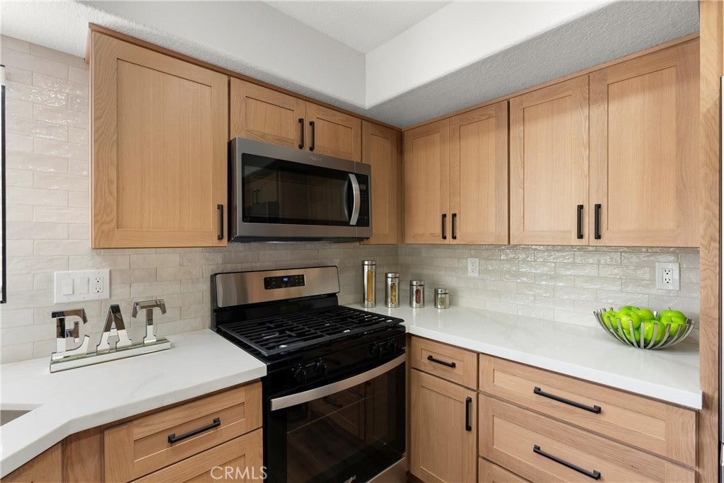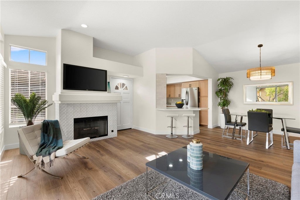 Welcome home to this stunningly reimagined 2-bedroom, 1.75-bath townhome in the highly sought-after Laurelwood Complex of Anaheim Hills. Perched as a desirable upper-level unit, this residence truly feels brand new, blending modern elegance with everyday comfort in a way that’s both welcoming and refined. From the moment you step inside, you’ll notice the seamless luxury vinyl flooring, crisp new baseboards, and beautifully updated lighting throughout, creating a bright and cohesive space. The living area invites you to relax and unwind, centered around a custom tile gas fireplace that adds warmth, character, and a touch of sophistication. The fully remodeled kitchen and bathrooms are showstoppers, featuring custom natural oak cabinetry, gleaming quartz countertops, all-new stainless steel appliances, and designer tile work—perfect for both daily living and entertaining. Thoughtfully designed for convenience, the home includes indoor laundry with both gas and electric dryer hookups, all-new blinds, and a private balcony—an ideal spot to enjoy your morning coffee or evening breeze. Comfort is assured year-round with a newer HVAC system and newer water heater, offering peace of mind for years to come. The detached 2-car garage, located directly across the walkway from the stairs to the unit, provides ample storage, upgraded lighting, and a brand-new garage door with opener and keypad—a rare and valuable feature. Just steps from the community pool, this home delivers a resort-like feel in a quiet, beautifully maintained setting. Perfectly situated in one of Anaheim Hills’ most desirable communities, this turnkey townhome offers the ideal blend of style, comfort, and location. A rare opportunity to own a completely remodeled, move-in-ready home that truly has it all.