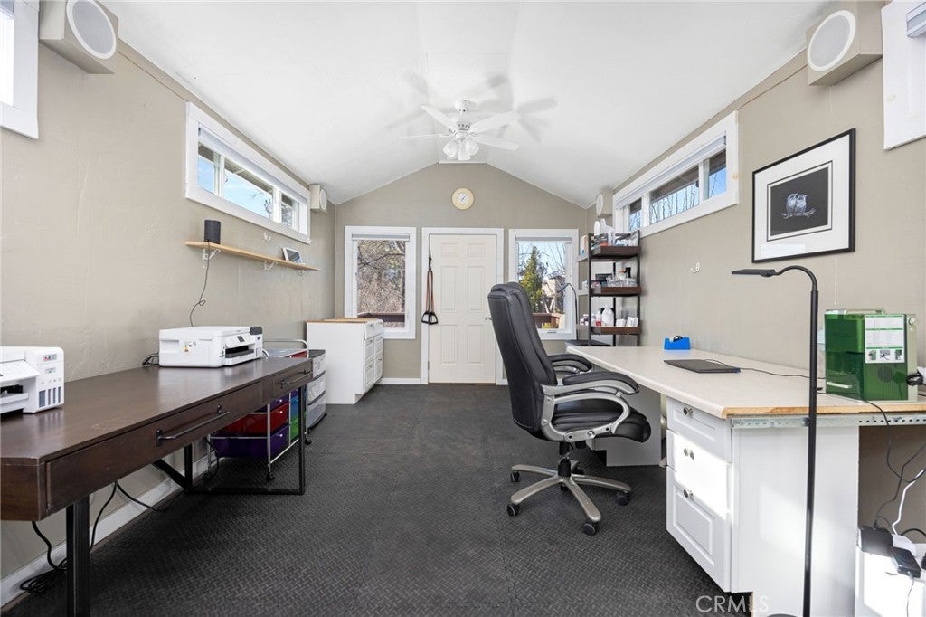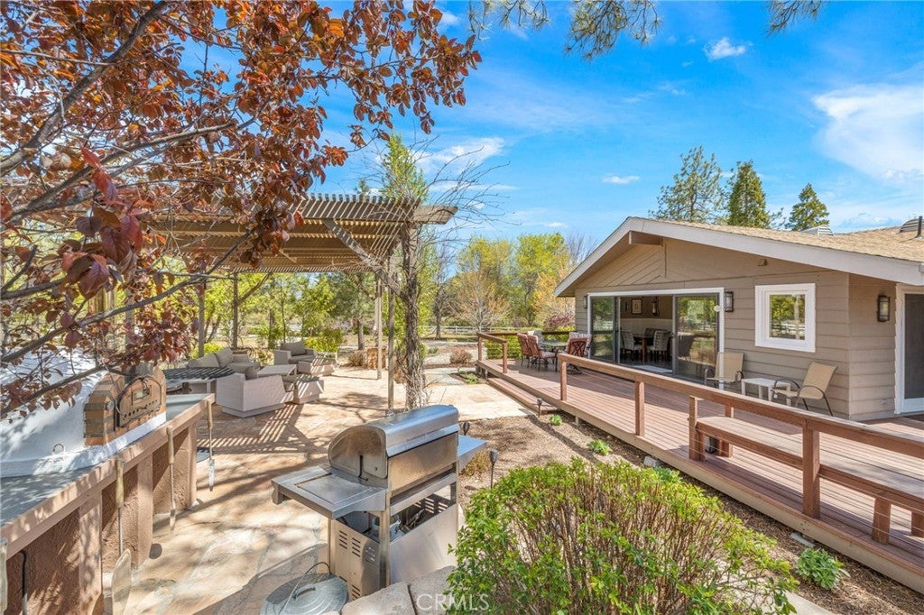 A rare and versatile mountain estate set in the scenic setting of Mountain Center in Garner Valley. This meticulously maintained property sits on a flat, fully fenced parcel offering exceptional privacy, usability, and flexibility. Comprised of five separate structures thoughtfully positioned and connected by winding walkways through manicured landscaping, the estate creates a peaceful, park-like environment ideal for a wide range of lifestyles. The main residence is filled with natural light and features two bedrooms, two bathrooms, a living room, kitchen, and laundry area. Expansive windows and sliding glass doors open to a spacious covered porch with a built-in pizza oven, designed for seamless indoor-outdoor living and entertaining. A separate one-bedroom guest house includes one bathroom, a living room, full kitchen, laundry, and private entrance, providing comfortable accommodations for extended stays or other permitted uses. Nearby, a climate-controlled art and craft room with heating and air conditioning offers a flexible space suitable for year-round fitness, creative use, or additional hobbies. A substantial approximately 3,400 square foot former workshop has been thoughtfully converted into a versatile living space. This structure includes two full bathrooms, a loft-style bedroom, and two additional downstairs rooms, allowing for a variety of configurations. An additional room may be used as a workshop, craft space, or storage. Equestrian amenities include a six-stall barn and a fully fenced turnout. A separate fully fenced yard offers space suitable for small farm animals or a dog run, along with a dedicated dog wash for added convenience. The usable acreage provides ample opportunity for customization to suit a range of lifestyles. Additional features include a backup generator and a whole-home water filtration system for added peace of mind. Garner Valley offers 26 miles of private horse riding trails, a community arena, and a community building, making this an exceptional opportunity to enjoy true mountain and equestrian living.