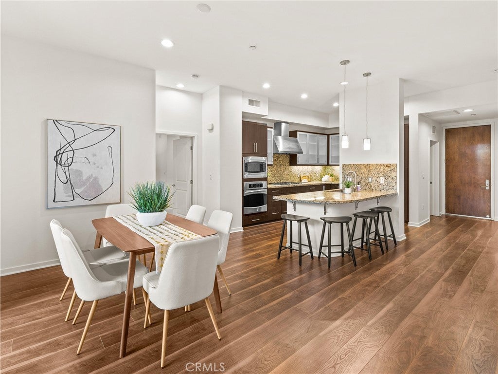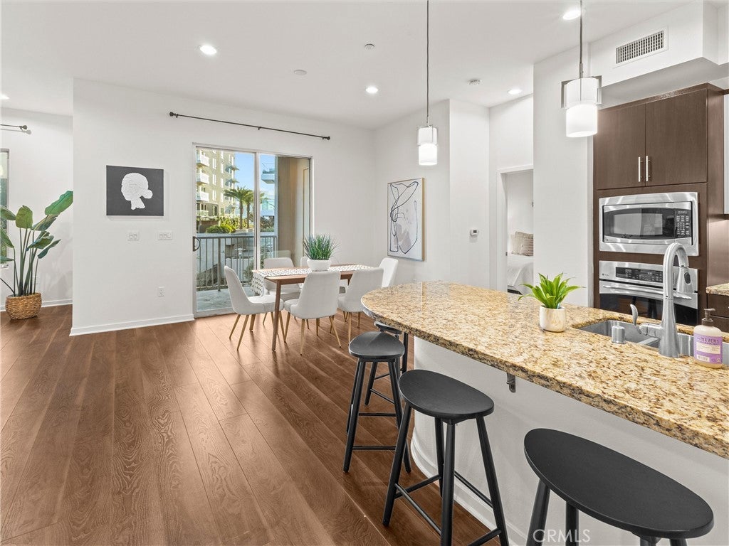 Central Park West • The Belvedere at 21 Gramercy • Single-Level 2 Bedroom 2 Bath Condo • Private Balcony • In-Unit Laundry Residence 208 is a Single-Level Condo Located in Irvine’s Central Park West Community at The Belvedere, Offering a Well-Balanced Layout with Open Living and Dining Spaces that Feel Connected without Feeling Crowded. Wide-Plank Wood Flooring, Recessed Lighting, and Large Windows Bring in Natural Light Throughout the Main Living Area. A Sliding Glass Door Opens to a Private Balcony with Space for Seating and Everyday Outdoor Use. The Kitchen is Designed to Stay Part of the Conversation, Featuring a Granite Peninsula with Bar Seating, Stainless Steel Appliances, Built-In Microwave and Oven, and a Vented Hood over the Gas Cooktop. Pendant Lighting Adds Focused Illumination while Keeping Sightlines Open to the Living and Dining Areas. Bedrooms are Positioned on Opposite Sides of the Home, Creating Separation Between the Primary Suite and Secondary Bedroom. The Primary Bedroom Includes Multiple Closets and an En-Suite Bathroom with Dual Sinks, a Soaking Tub, and a Glass-Enclosed Shower. The Second Full Bathroom is Located Near the Secondary Bedroom and Includes a Tiled Vanity and Tub/Shower Combination. Additional Features include a Dedicated In-Unit Laundry Room, Foyer Entry, and Multiple Storage Closets. The Belvedere Offers Garage Parking and Access to Central Park West Amenities Including Pool, Spa, Fitness Center, Yoga Room, Clubroom, Catering Kitchen, and Outdoor Lounge and BBQ Areas. Convenient Irvine Location Near Jamboree Road and the 405 Freeway, Close to John Wayne Airport, Diamond Jamboree, UC Irvine, and South Coast Plaza.