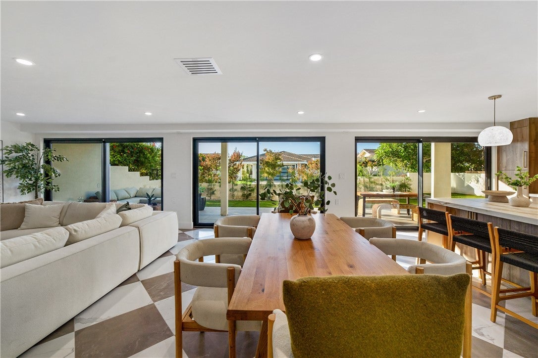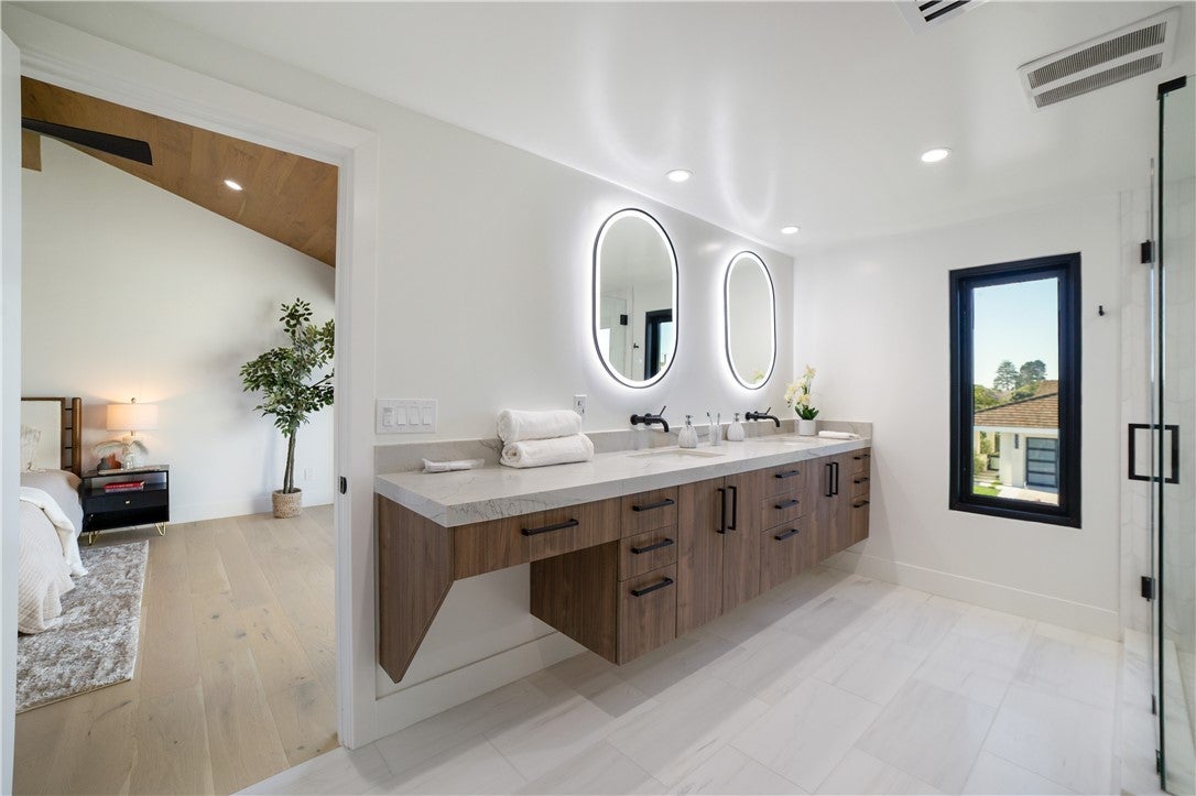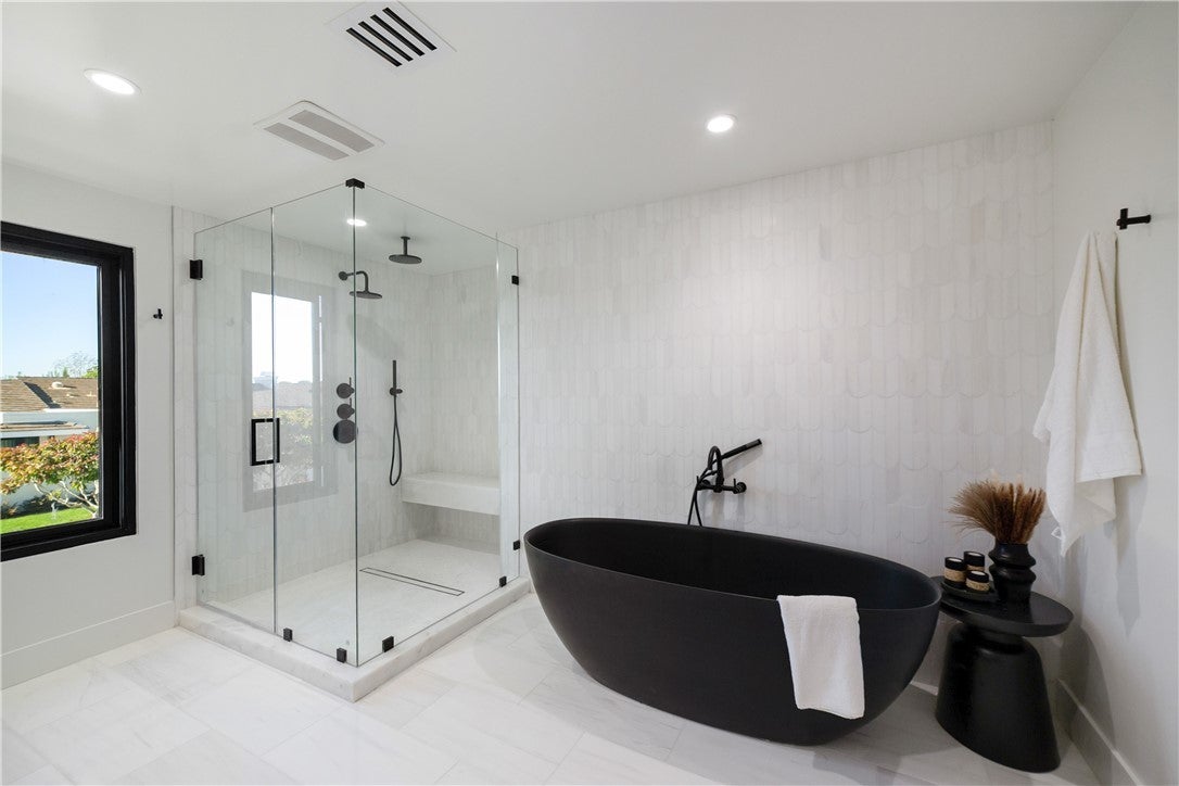 Reimagined 3-bedroom, 2.5-bathroom residence in Jasmine Creek. Wood-clad ceilings, skylights, and quality finishes. Open floor plan with wood flooring. Kitchen with stainless appliances and cabinetry. Bathrooms with dual-sink vanities and tile. Wood ceilings, black-framed windows, and neutral colors. Built-in storage. Near beaches, Corona Del Mar Village, Fashion Island, and schools, Back Bay trails close by.