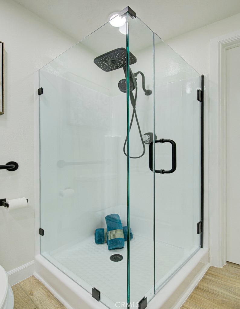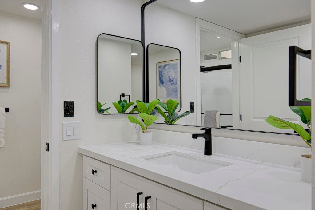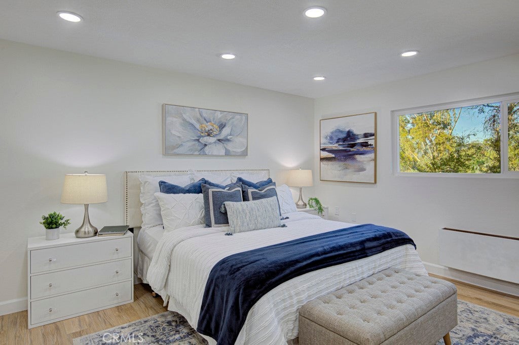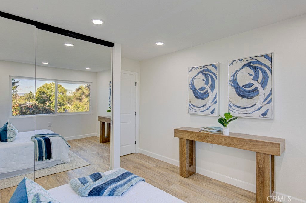Welcome to 5499-2D Paseo Del Lago West – a newly remodeled two-bedroom, two-bath, end-unit EL MIRADOR residence in the Laguna Woods senior community. Beyond a wrought-iron gate, double front doors open to a small entry foyer and the common rooms beyond. The enormous living room easily accommodates multiple configurations of large furnishings. The kitchen has brand new cabinetry (with lazy susan, spice drawer, built-in trash/recycling drawer and soft-close doors and drawers) and quartz countertops. The stainless-steel appliances are also brand new. The primary bedroom has a full wall of closet space with sliding glass doors. The primary bathroom has a tub/shower combo. The versatile guest bedroom could also serve as a home office, workout/yoga room or arts and crafts studio. The guest bedroom’s window has a lovely view of endless trees and the Saddleback Mountains in the distance. The guest bathroom has a stall shower. The primary and guest bedrooms are at opposite ends of the residence affording increased privacy between the rooms. This home has been beautifully upgraded throughout. Features include smooth ceilings, recessed lighting throughout (all on dimmers), dual-pane windows and sliders and attractive vinyl plank flooring. The open covered balcony (accessible via a glass slider in the dining area) is ideal for year-round outdoor entertaining, dining and relaxing with friends and family. Convenient elevator access from the assigned parking space (with additional cabinet storage) in the subterranean garage to your front door. Common laundry facilities are available nearby. There is also a large recreation room with kitchen available at the subterranean level for exclusive use by the building’s occupants. Do not miss this beautiful property!