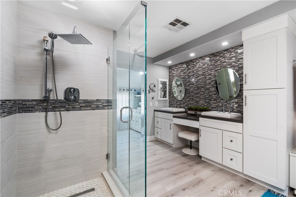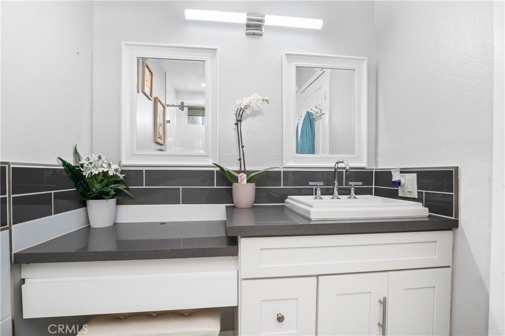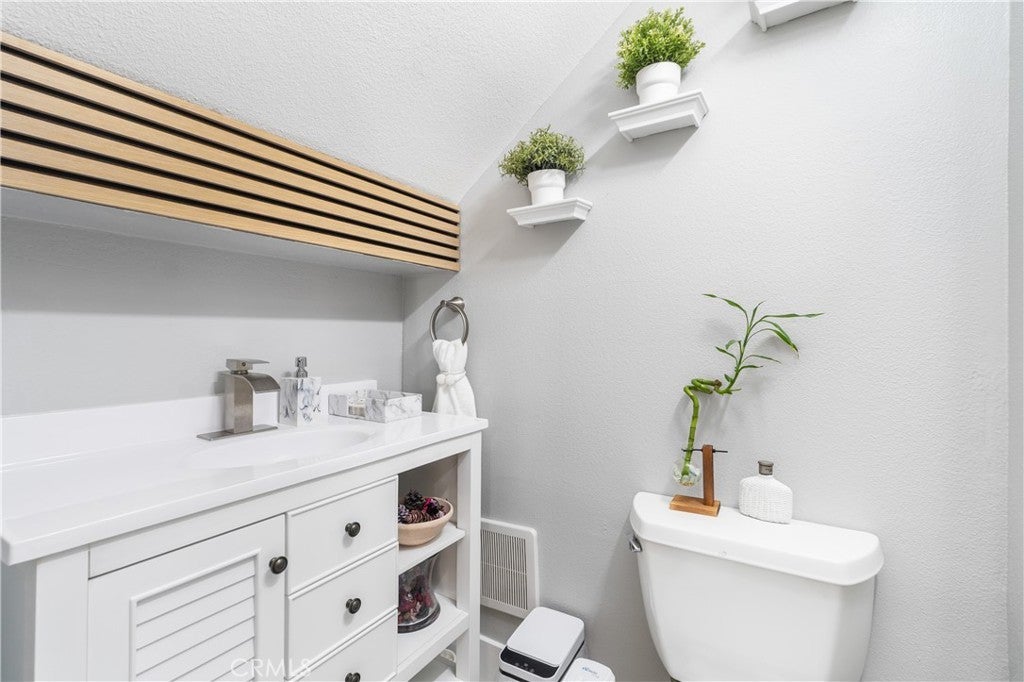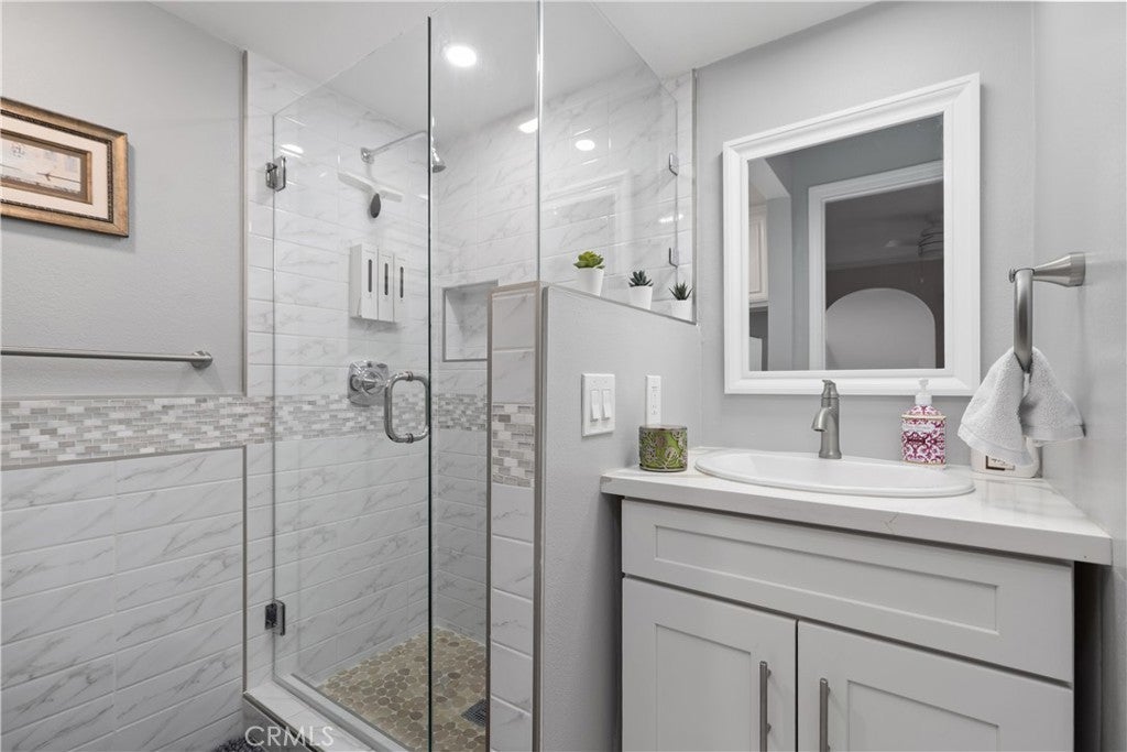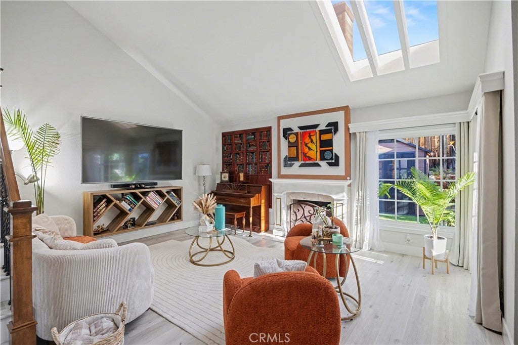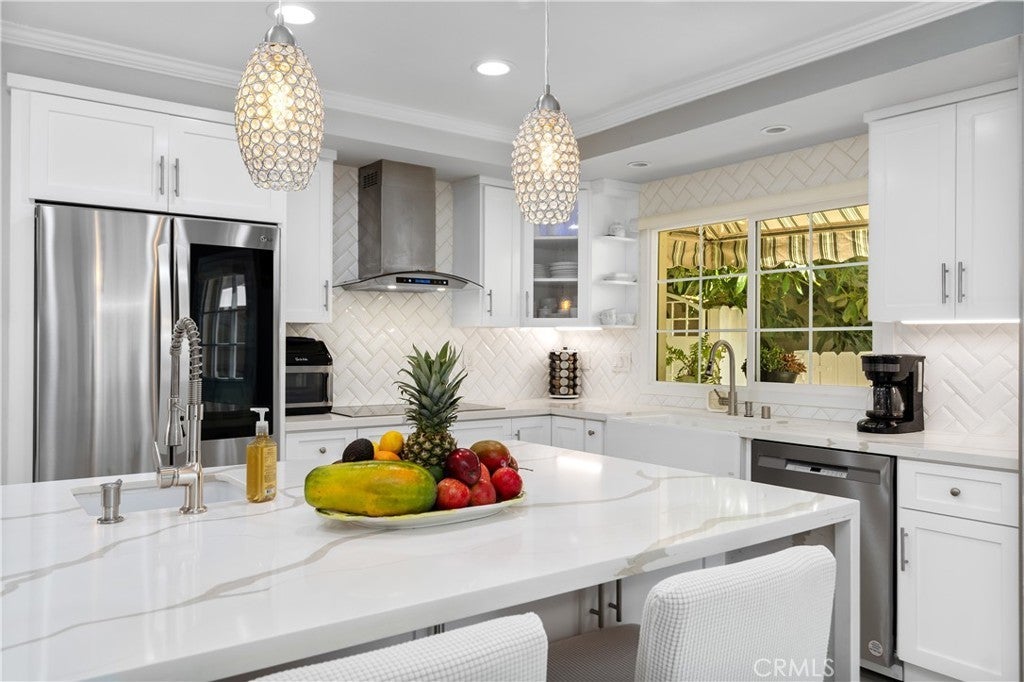 This stunning, fully remodeled residence masterfully blends modern luxury with functional design. Spanning 2,120 square feet on a generous 4,900-square-foot lot, this exquisite home offers ample space for both indoor and outdoor living. The property boasts 3 bedrooms and 3 full bathrooms, plus an elegant powder room, ensuring comfort and privacy for all residents. Each bedroom features an en-suite bathroom and a ceiling fan, creating a private retreat. The spacious master suite is a haven, complete with a double-sink en-suite bathroom, a sleek standing shower, and a freestanding soaking tub. A STANDOUT FEATURE IS THE VERSATILE DOWNSTAIRS SUITE, EQUIPPED WITH A UPGRADED MINI KITCHEN, REFRIGERATOR, COOKTOP, AND PRIVATE ENTRANCE—PERFECT FOR RENTAL INCOME OR AS AN IN-LAW SUITE FOR MULTI-GENERATIONAL LIVING. The living area impresses with a vaulted ceiling, skylights that flood the space with natural light, and a cozy fireplace with a chic marble mantel. This open-concept design flows seamlessly into a dining area framed by large windows, inviting abundant natural light. The chef’s dream kitchen features a expansive quartz island with a sink, matching countertops, modern pendant lighting, crisp white cabinetry, and professional-grade stainless-steel appliances. Light wood flooring and thoughtful decor elevate the space, while a door provides convenient access to the side yard. Recent upgrades include a state-of-the-art, energy-efficient air conditioning system and a tankless water heater, ensuring modern comfort and sustainability. The outdoor spaces are equally captivating. The front exterior features a meticulously maintained driveway lined with palm trees and manicured shrubs, creating striking curb appeal. The backyard patio is a serene retreat, boasting a brick-paved walkway, low-maintenance artificial turf, and a shaded seating area—ideal for entertaining or relaxing amidst mature trees and lush landscaping. Inside, the home continues to shine with thoughtful upgrades. The two-car garage features epoxy flooring, a laundry area with a utility sink, a work desk, and ample, well-designed storage. Located in the heart of Irvine, 8 Monticello offers a perfect balance of tranquil residential living and proximity to vibrant community amenities, including top-rated schools, shopping, dining, and recreational opportunities. This exceptional property is a rare gem, combining contemporary upgrades, versatile living spaces, and a serene, enviable location.