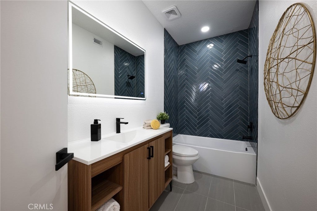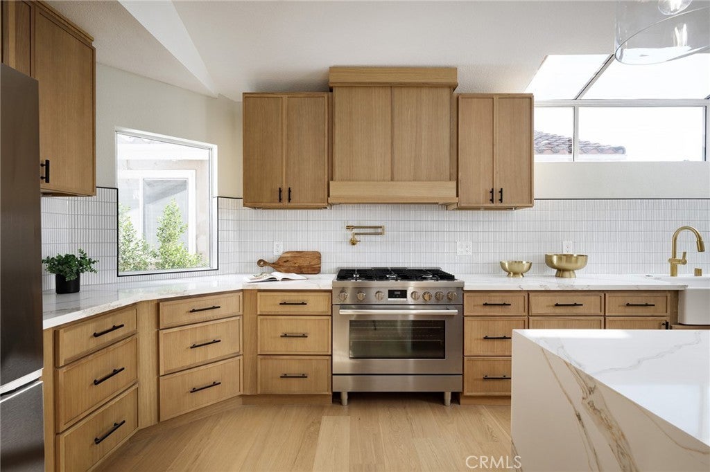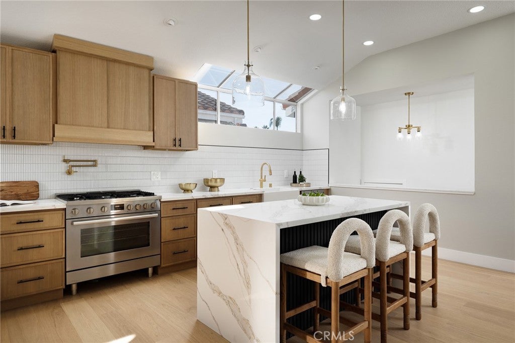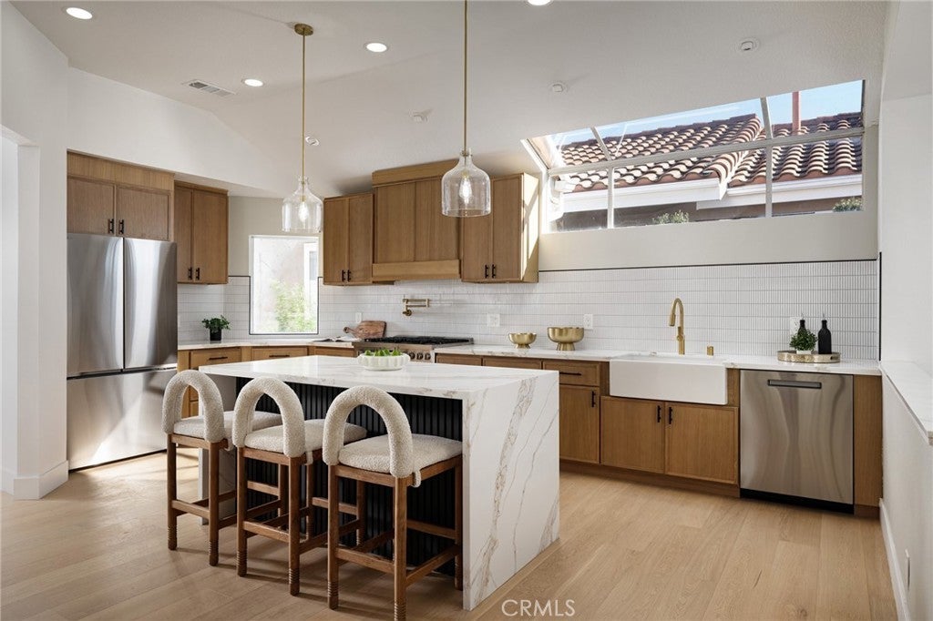 STUNNING, MOVE-IN-READY residence in the gated community of Waterford Point in Dana Point. This renovated 2-bedroom, 2.5-bath home has been thoughtfully updated inside and out with designer finishes and modern functionality. Hardwood flooring flows seamlessly throughout the home, complemented by new windows and expansive bi-fold doors that open the living space to scenic hillside views from the family room balcony. The beautifully redesigned kitchen features a freestanding gas range with pot filler, statement island with waterfall quartz counter top, custom slim white oak cabinetry and high-end finishes. The primary suite offers a spa-like retreat with a double-head shower and a spacious, newly landscaped private patio with bi-fold doors just off the bedroom. Additional upgrades include an epoxy-finished garage, new exterior stucco and paint, new heating system, slim line AC unit and meticulous attention to detail at every turn. Ideally located near top schools, shopping, and Dana Point Harbor, this exceptional home offers luxury, comfort, and convenience in a secure, gated setting.