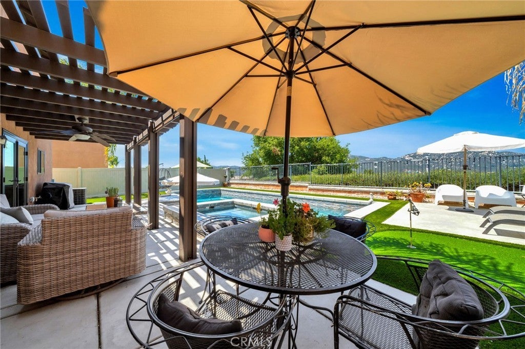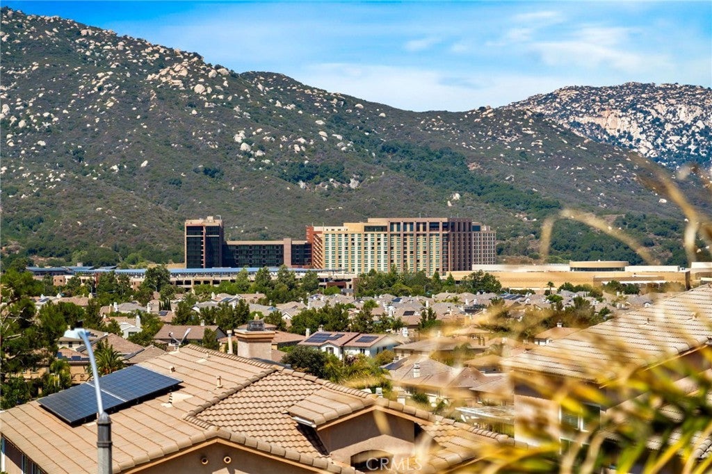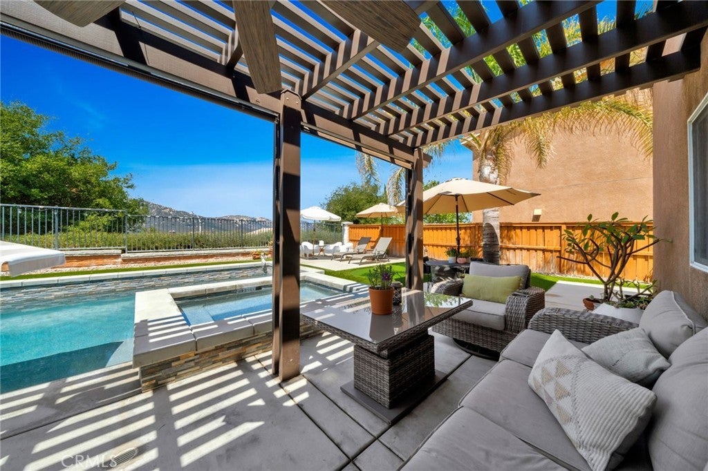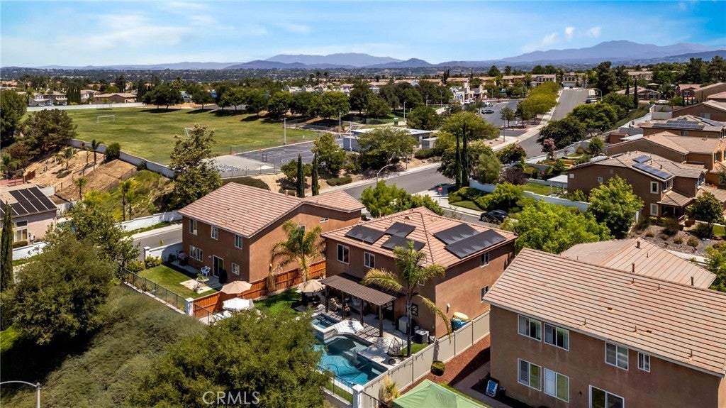 Welcome to 46109 via La Tranquila. This chic Temecula Retreat is located in the highly sought after Redhawk community and just a short distance from some of the most delicious local wineries. Featuring a stunning, remodeled backyard with a sparkling pool and beautiful views, making it an ideal space for dining alfresco or fun pool parties! The interior of this home has been thoughtfully and tastefully refreshed with beautiful new flooring, neutral paint and charming updated bathrooms. Upon entry you will be greeted with a broad front living room that blends to the dining area, perfect for hosting family and friends and as you step around the corner, you’re graced with a remodeled kitchen, featuring a large center island, pantry and tasteful modern finishes. The great room kitchen/family room features a cozy brick fireplace and attractive French doors that open to the outdoor retreat. As you make your way up the white riser stairs case You’ll be met with four bedrooms, including the primary retreat with its peaceful Mountain View’s and walk in closet off the en-suite bath. The upstairs large bonus room offers a great space for recreation, lounging and movie nights. Other modern amenities include a solar power system and battery wall to assist with your home’s energy bill. Ideally located in close proximity to great schools, beautiful golf courses and Temecula‘s charming old town, with its boutique shopping and dining.