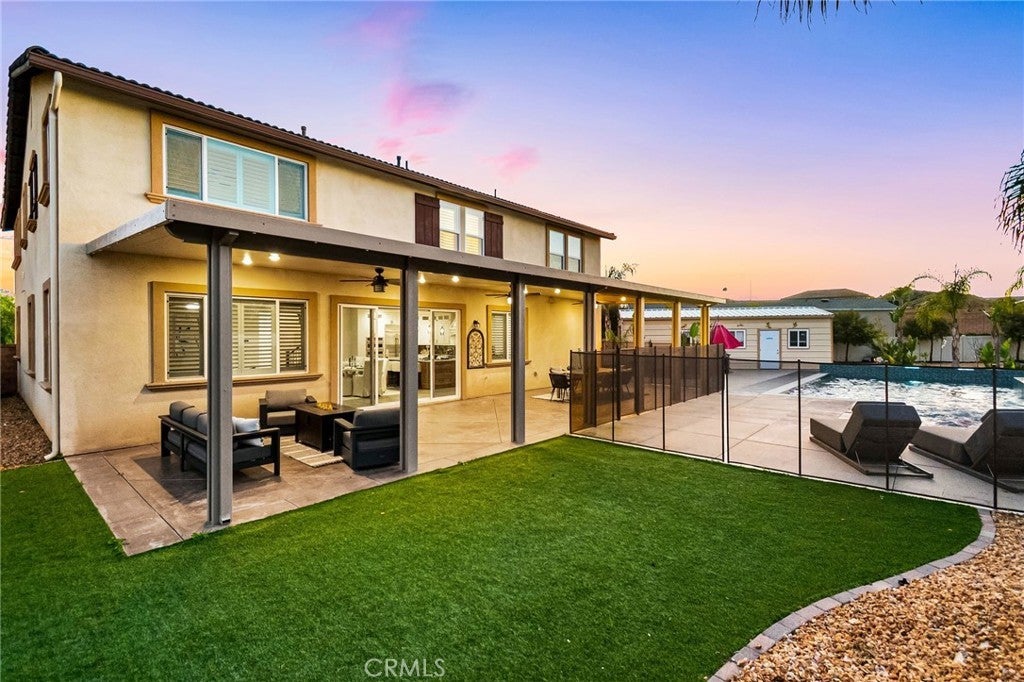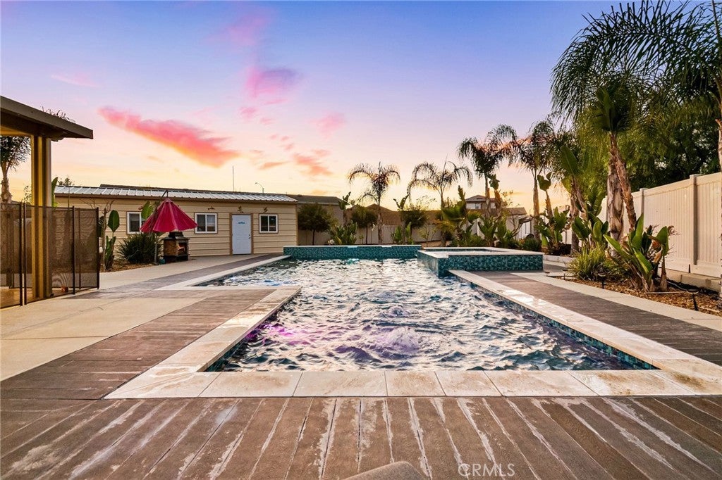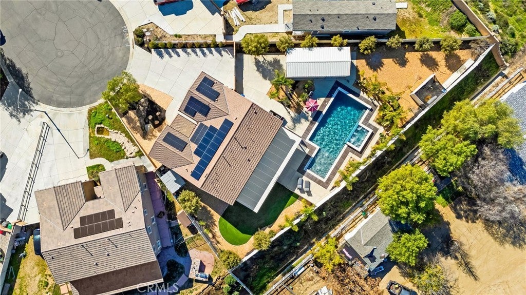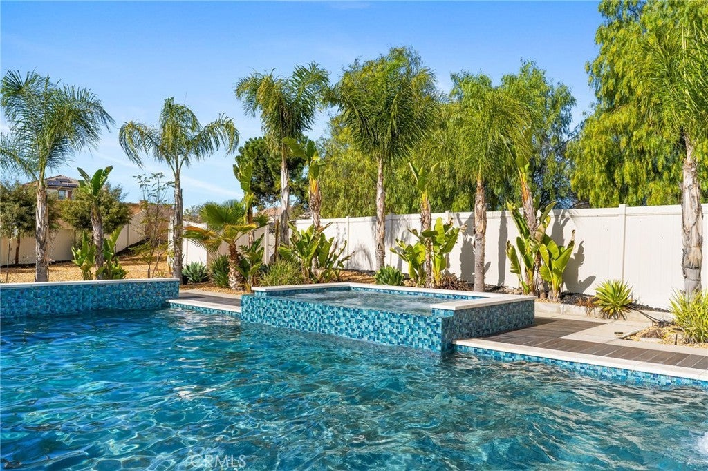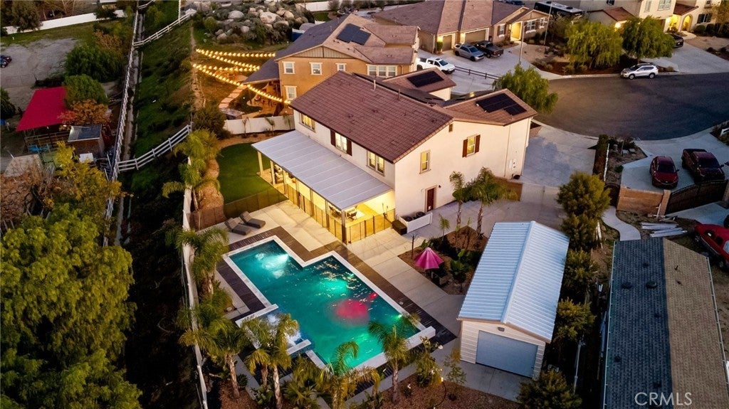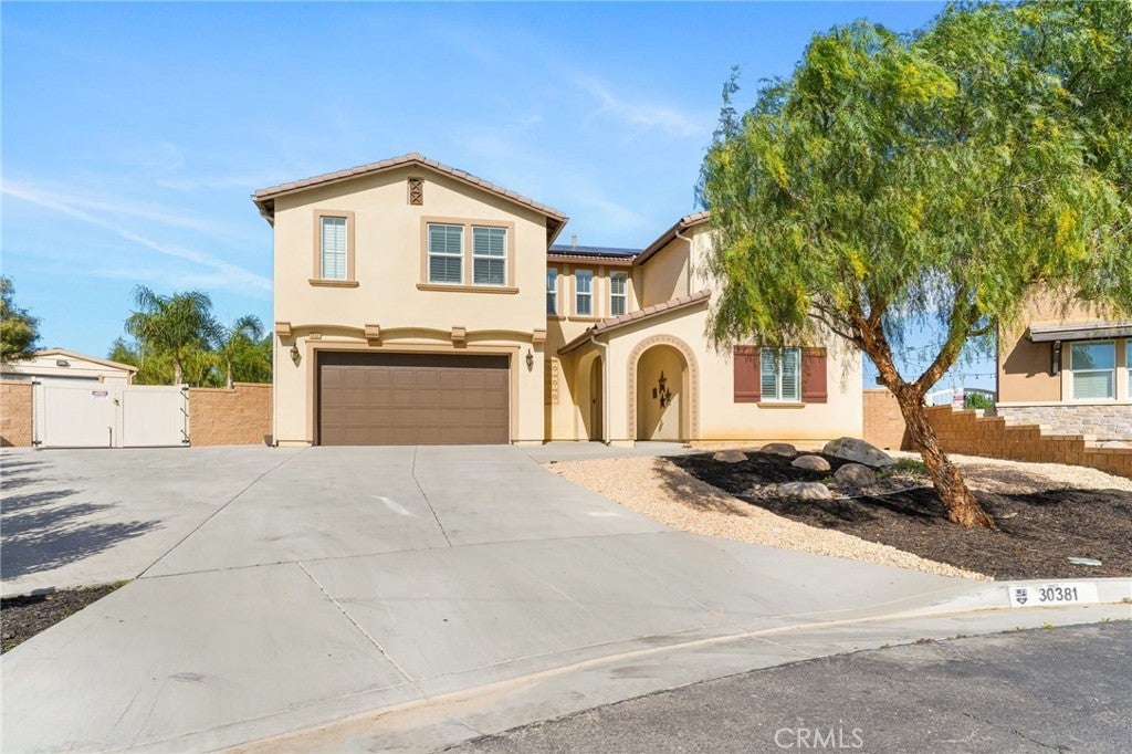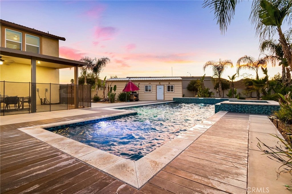 Welcome to 30381 Canyon Point Circle, a beautifully updated residence located in the prestigious Boulder Estates community of Menifee, offering no HOA, generous lot features, and a true indoor-outdoor lifestyle. This 5-bedroom, 4.5-bath, 3,653 sq ft home impresses from the moment you enter with soaring ceilings, an open balcony overlook, and a tastefully designed staircase that sets the tone for the rest of the home. The interior has been freshly repainted, elevating the already bright, move-in-ready feel throughout. The main level features a full downstairs bedroom suite with a walk-in closet and private en-suite bathroom, ideal for guests or multigenerational living, along with a convenient powder room. The heart of the home is the expansive open-concept great room, seamlessly integrating the living room, dining area, and kitchen. Built-ins anchor the living space, while dual sliding glass doors open to the backyard and create effortless flow for entertaining. The chef’s kitchen is thoughtfully designed with a large center island and bar seating, stainless steel built-in appliances including a cabinet-flush refrigerator, six-burner gas range, abundant cabinetry, recessed and pendant lighting, and a large walk-in pantry that provides exceptional storage. Upstairs, a spacious flex space functions perfectly as a family room, lounge, or media area. The primary suite is a true retreat, filled with natural light and featuring dual vanities, a Roman soaking tub, a separate walk-in shower, water closet, and an expansive walk-in closet with remarkable storage capacity. Three additional bedrooms complete the upper level, each with direct bathroom access, including two secondary bedrooms connected by a Jack-and-Jill bath. A full upstairs laundry room with sink, storage cabinetry, and open shelving adds everyday convenience. The backyard is a true private oasis, highlighted by a resort-style pool and spa with Pebble Tech finish, lighting, water, and wave features. An additional detached shed currently used as a workspace offers flexibility as a home gym, studio, or man cave. Additional highlights include solar, extensive built-in storage throughout, a three-car tandem garage, and RV parking. Located in a quiet, well-established enclave with easy access to shopping, dining, parks, and commuter routes, this home offers space, flexibility, and the idyllic Southern California lifestyle without compromise.