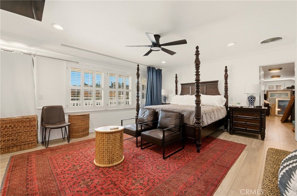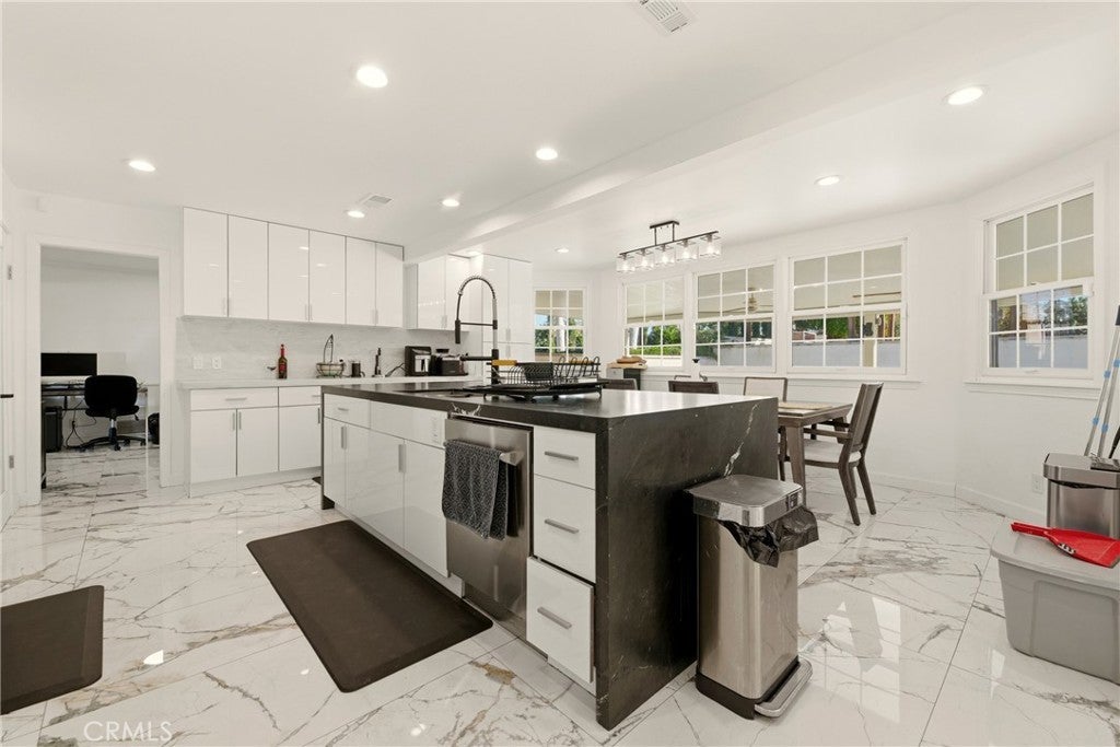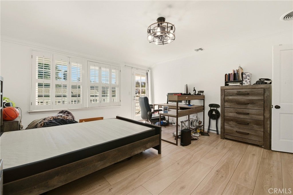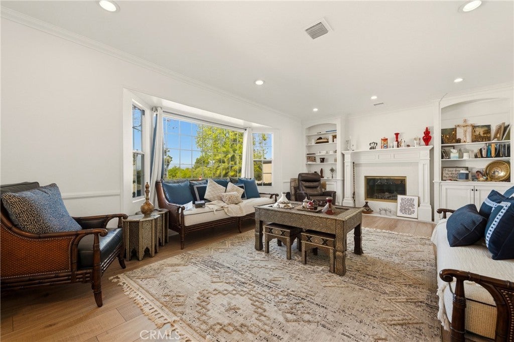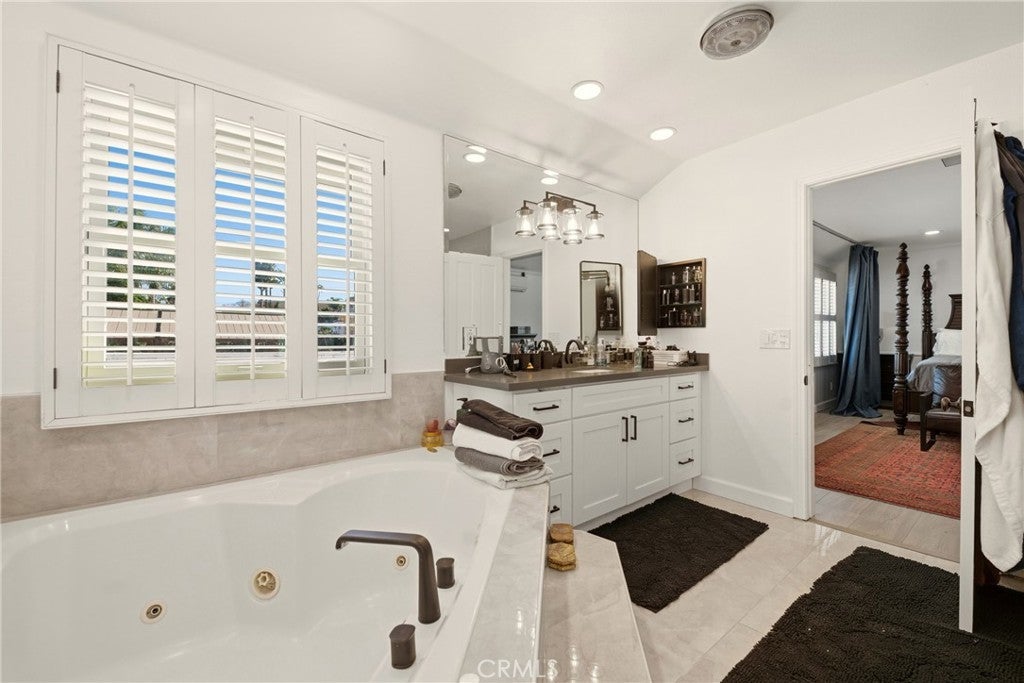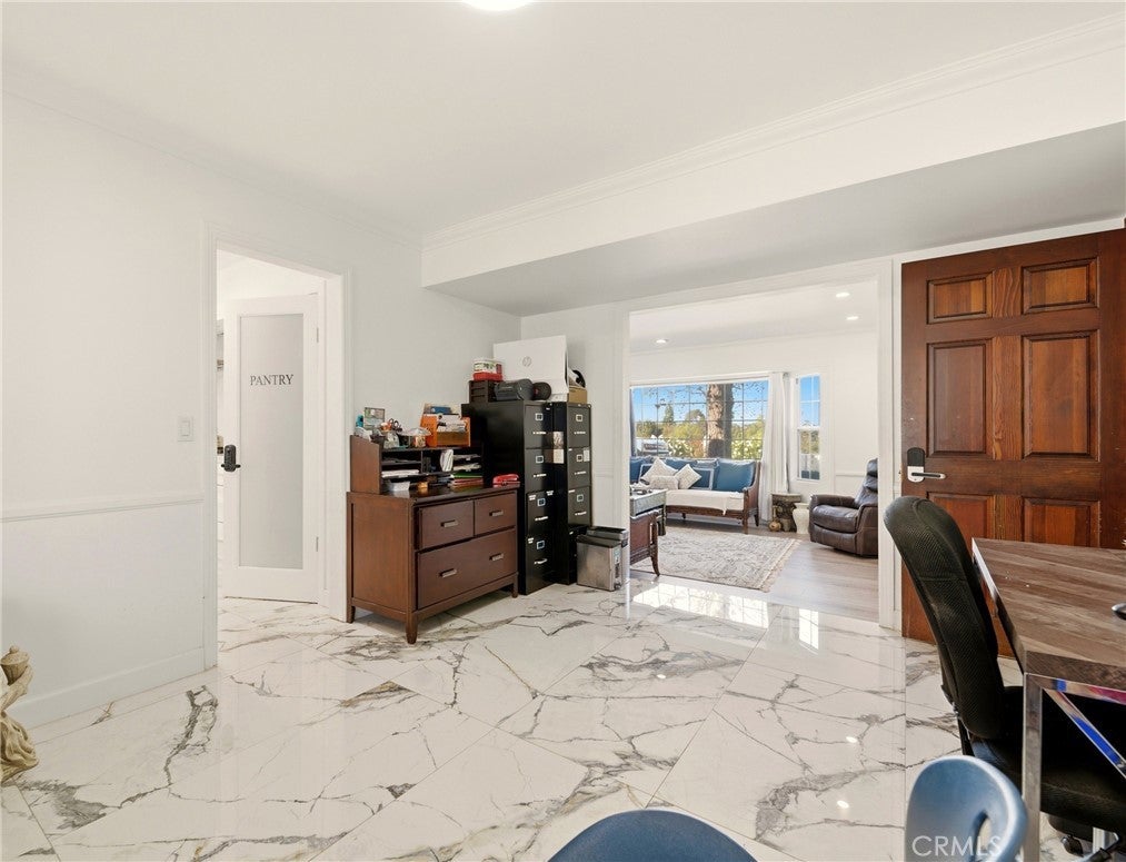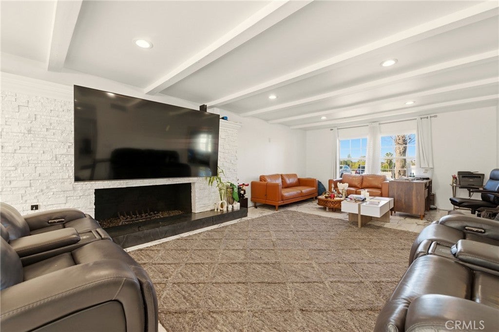 Welcome to 1301 Paseo Grande in Corona, a well-appointed home designed for everyday comfort and easy entertaining. The property offers multiple spacious living areas with abundant natural light, including a formal living room with fireplace and coffered ceilings, and a separate family room with exposed beams, a second fireplace, and sliding doors that open to the backyard. A dedicated office or den with custom built-ins provides flexibility and may be used as a fifth bedroom, complete with a private full bathroom and separate exterior access. Upstairs features four bedrooms, including two primary-style suites for flexible living arrangements. The main primary suite offers plantation shutters, space for a sitting area, a walk-in closet with built-ins, and an ensuite bath with soaking tub and glass-enclosed shower. A separate laundry and utility room with extensive cabinetry adds convenience. The updated kitchen includes white cabinetry, stone countertops, a waterfall-edge island, and a professional-style range with hood and full-height backsplash, opening to the dining area for everyday living and gatherings. The low-maintenance backyard is designed for water-efficient living with extensive concrete hardscape, a covered patio with ceiling fans, an in-ground pool, and an elevated gazebo or pavilion area suitable for gatherings. Additional features include mature landscaping and solar panels.