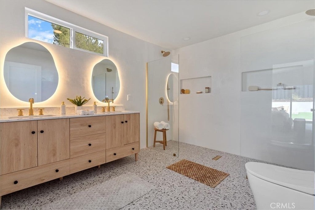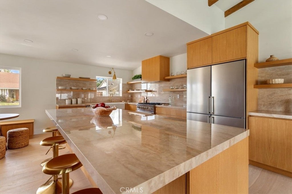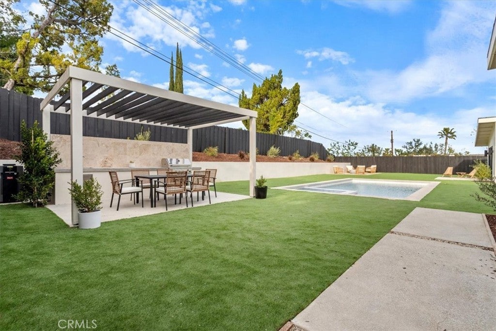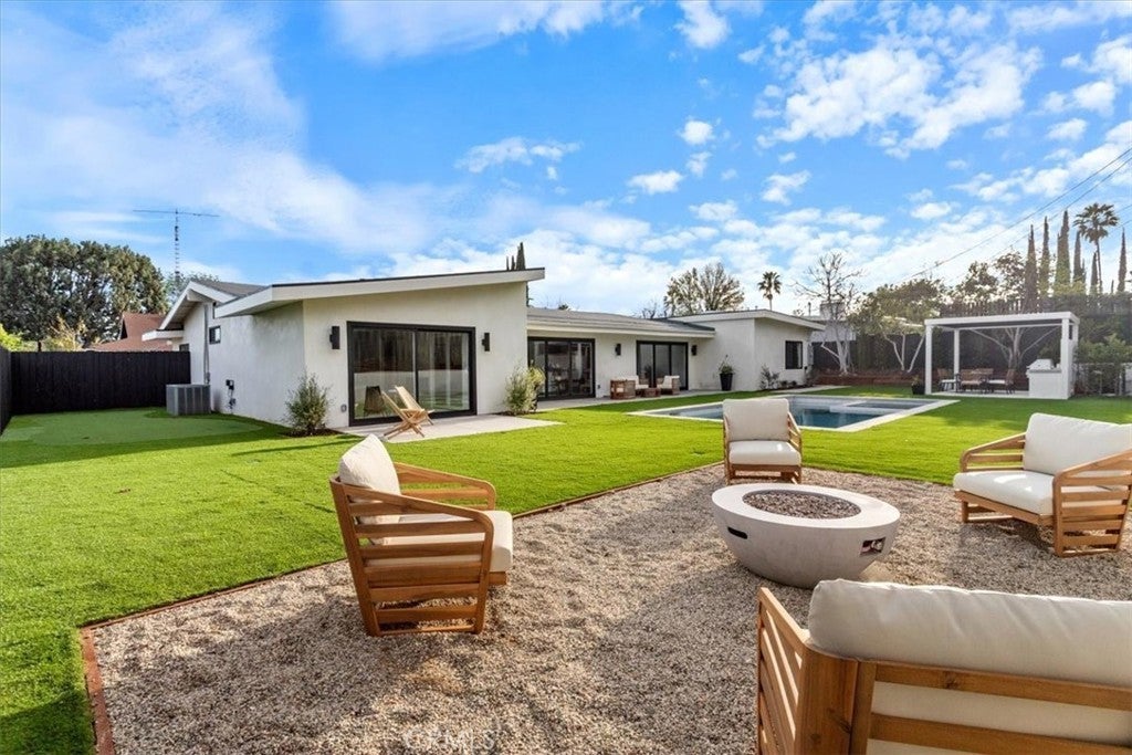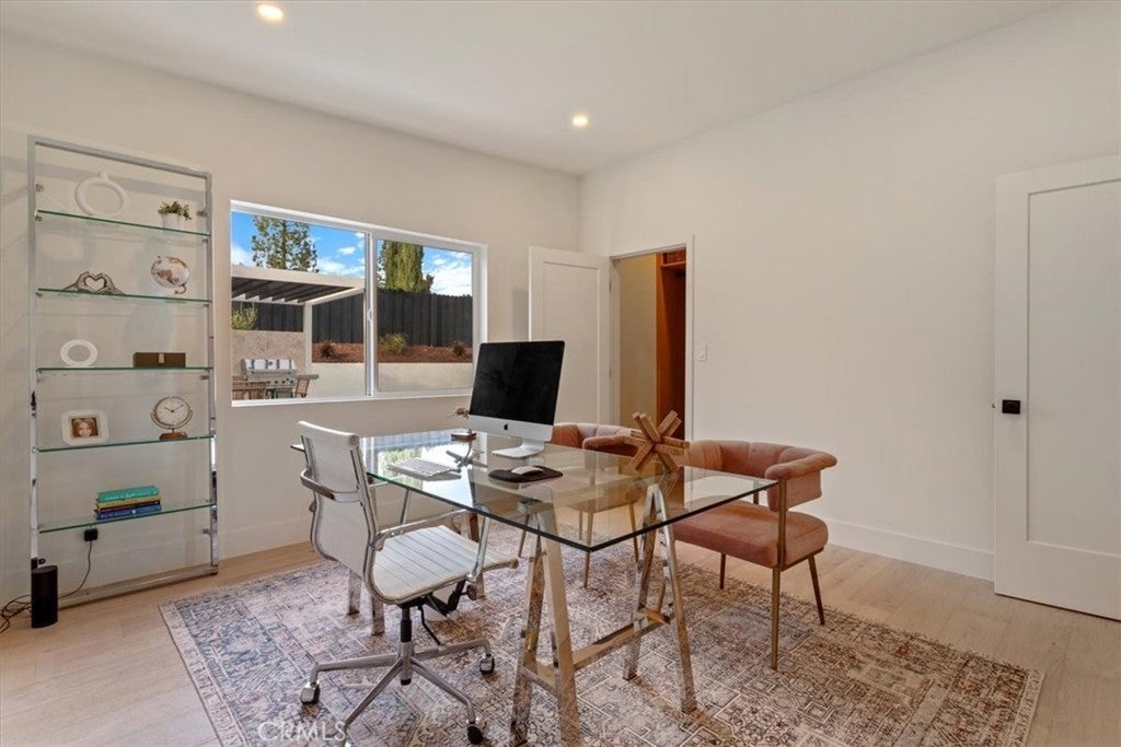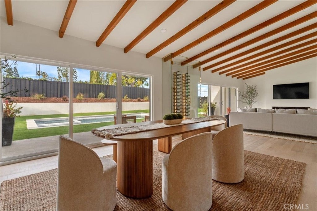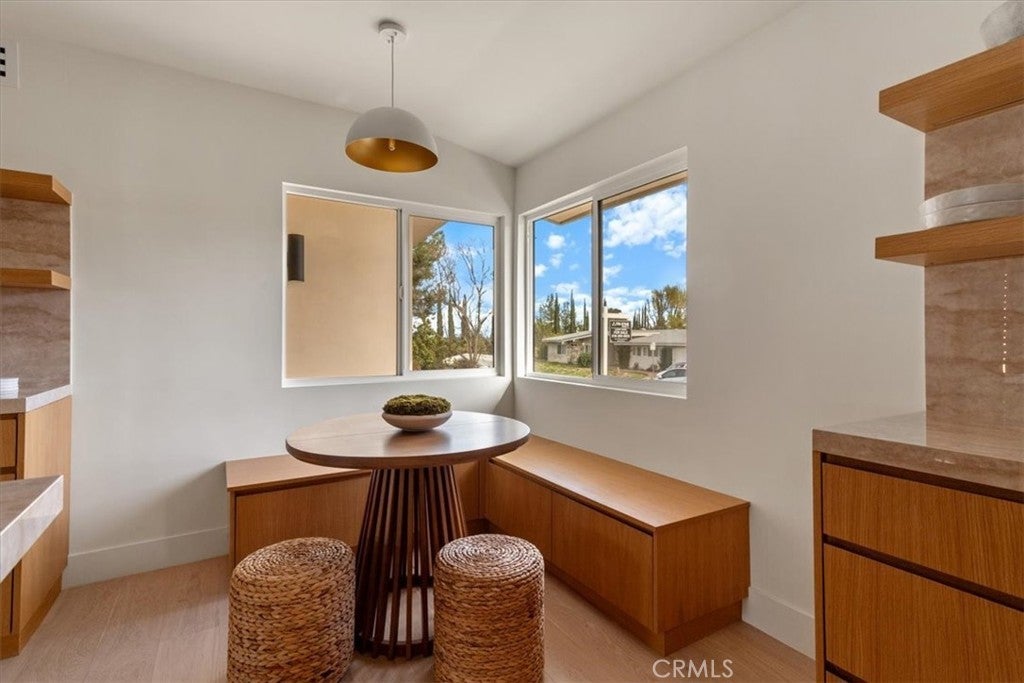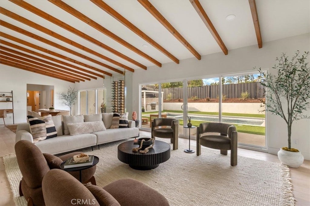 Completely Reimagined iconic Charles Du Bois mid-century home, timeless architectural Design with modern volume, warmth, and functionality This 4-bedroom, 3 bath boasting 2,720 sqft residence honors the original spirit of Du Bois design while elevating it for contemporary living. The homes layout has been redesigned to introduce an Open floor plan living room / Dining room with high Beamed ceilings, creating an expansive sense of scale and light rarely found in homes of this era. true indoor-outdoor living allowing the interior spaces to flow effortlessly into the landscape. Throughout the home, custom oak cabinetry has been meticulously designed and built in every space, offering warmth, cohesion, and exceptional storage without compromising clean architectural lines. The dining room flows seamlessly with the Living room and kitchen making it ideal for entertaining. The kitchen is both sculptural and functional, featuring Forno appliances, natural Taj Mahal Golden Porcelain countertops, and a kitchen nook with benched seating that serves as the heart of the home. The residence offers dual primary suites, thoughtfully positioned on opposite sides of the home to provide privacy and flexibility perfect for guests, in-laws, or work-from-home needs. Outside, the property continues to impress with a modern linear pool and spa, a covered outdoor BBQ Entertainment area, and multiple zones designed for relaxation and entertaining. A pebbled fire pit area with plenty of seating area the sets the tone for gatherings both intimate and lively. Every system in the home has been updated this is a fully rebuilt residence, offering the confidence of new construction with the soul of a mid-century classic. A rare opportunity to own a true architectural masterpiece rooted in history, redefined for modern life, and perfectly suited for the Woodland Hills lifestyle.