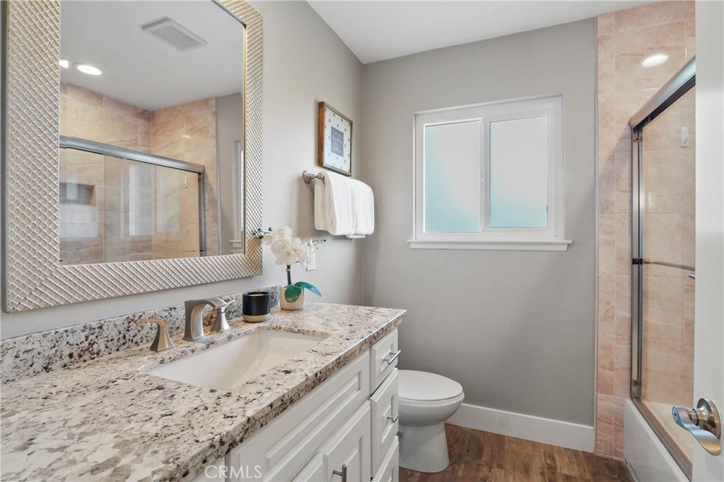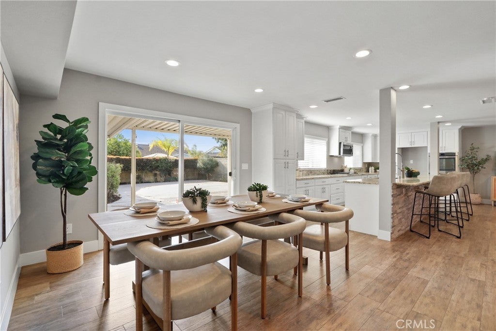 This beautiful 5-bedroom, 3-bath home offers a thoughtfully designed living space that has been completely remodeled throughout. Step through the double-door entry into an inviting open floor plan filled with natural light, where the living, dining, and kitchen areas all flow seamlessly together to create a warm and connected atmosphere. The showstopping 13-foot kitchen island is an impressive centerpiece featuring granite countertops and a stacked-stone accent finish—perfect for meal prep, hosting, or gathering. The updated kitchen offers soft-close cabinets and drawers, a built-in spice rack, pantry, granite countertops, stainless steel sink, and appliances which include a double oven, microwave, and gas cooktop. Custom wood-look tile flooring spans the entire main level. Double-pane windows enhance energy efficiency, while central A/C, heat and a whole house attic fan provide year-round comfort. The living room boasts a floor to ceiling custom stacked stone fireplace. Two spacious bedrooms are located on the main floor behind a private door, offering flexible living options for guests, workspace, or multi-use needs. The first-floor bathroom features a convenient walk-in shower. The laundry room includes a utility sink and plenty of storage. The entire interior has been freshly repainted for an updated and move-in-ready finish. Upstairs, brand-new carpet leads to three additional bedrooms, including a spacious primary suite with a walk-in closet and dual-sink vanity. Mirrored sliding closet doors are featured throughout. All bathrooms have been updated with beautiful mirrors, vanities, granite countertops, custom tile showers, and thoughtfully designed niches. At the top of the stairs you’ll find an additional closet and a large linen cabinet. The private backyard offers a peaceful retreat with two mature avocado trees providing shade and seasonal enjoyment—ideal for relaxing or entertaining. The property includes a detached 2-car garage, space to park two additional vehicles in front of the garage, and a 9.5-foot gate accommodating RV, boat, or trailer parking. Situated directly across from the scenic Santa Ana Riverbed biking trail—with access routes toward Newport and Huntington Beach as well as charming Old Town Orange. The home also provides easy access to the 91, 55, and 57 freeways, local schools including Fletcher Elementary (dual immersion program), Villa Park High School and Orange Lutheran High School are just minutes away.