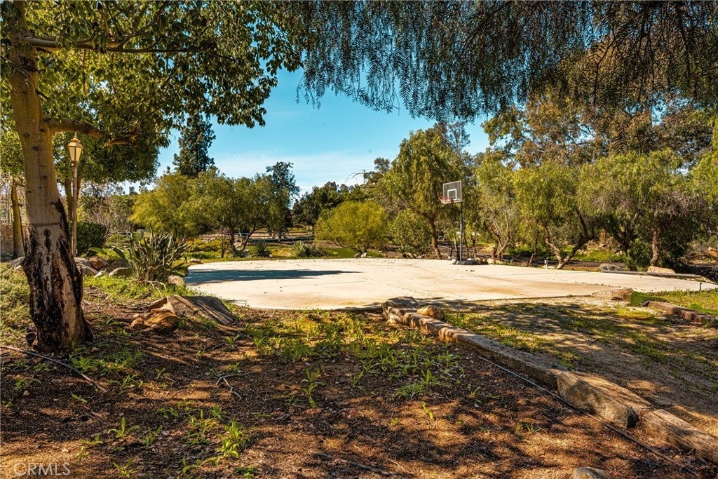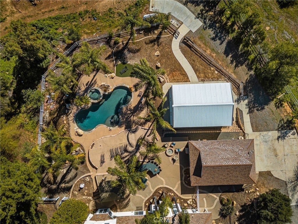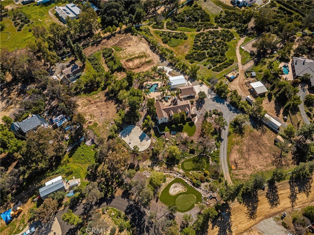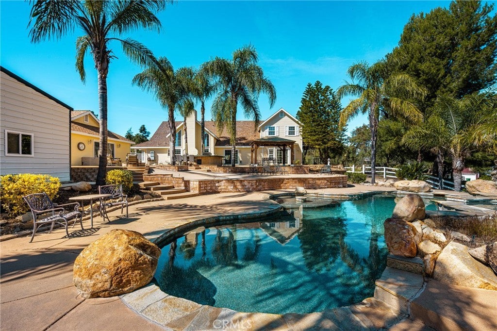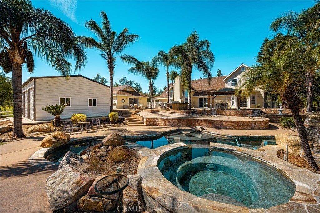 -Chaparral Hills Private Road Horse Property- A rare offering in the private road community of Chaparral Hills, this exceptional horse property defines refined country living in Menifee. Blending timeless craftsmanship with resort-style amenities, this estate presents a true multi-generational opportunity. Inside, elegant crown molding and rich hickory hardwood flooring set the tone for quality throughout. Warm and expansive, the family room showcases soaring vaulted ceilings and dramatic floor-to-ceiling stonework, creating a stunning yet inviting gathering space. The gourmet kitchen is designed to impress, featuring custom wood cabinetry, granite countertops, stainless steel appliances, a pantry, and an oversized center island ideal for entertaining. The main level offers two luxurious primary suites. The first includes a private entrance, dual walk-in closets, and a spa-inspired bath with granite counters and a walk-in shower. The second primary suite is a private haven, offering scenic backyard views, an expansive walk-in closet, and a tastefully designed ensuite bath for peaceful retreat. Upstairs, a beautifully crafted wood banister with wrought-iron balusters leads to four generously sized secondary bedrooms and two full bathrooms. A dedicated private theater room with projection and surround sound completes the upper level. Step outside to a resort-inspired backyard oasis. Swaying palms surround a sparkling pool and elevated spa, while a custom fire pit and expansive outdoor bar with built-in BBQ create the perfect space for entertaining. The grounds continue to impress with a dedicated gym room, private basketball court, and charming mini golf putting green — offering recreation and wellness right at home. Mature trees, drought-tolerant landscaping, and walking paths enhance the serene, park-like setting. A detached 3-bedroom, 2-bath guest house with a full kitchen offers exceptional privacy and separate side-street access, ideal for multigenerational living, extended guests, or rental opportunities. In addition to the main garage, a large detached secondary garage/workshop with high ceilings and finished concrete floors provides versatile space for a home office, gym, workshop, creative studio, or ultimate man-cave retreat. This extraordinary Chaparral Hills estate offers an unmatched combination of space, privacy, and lifestyle amenities — truly embodying luxury country living at its finest.