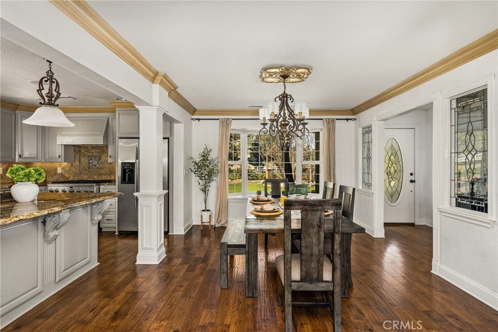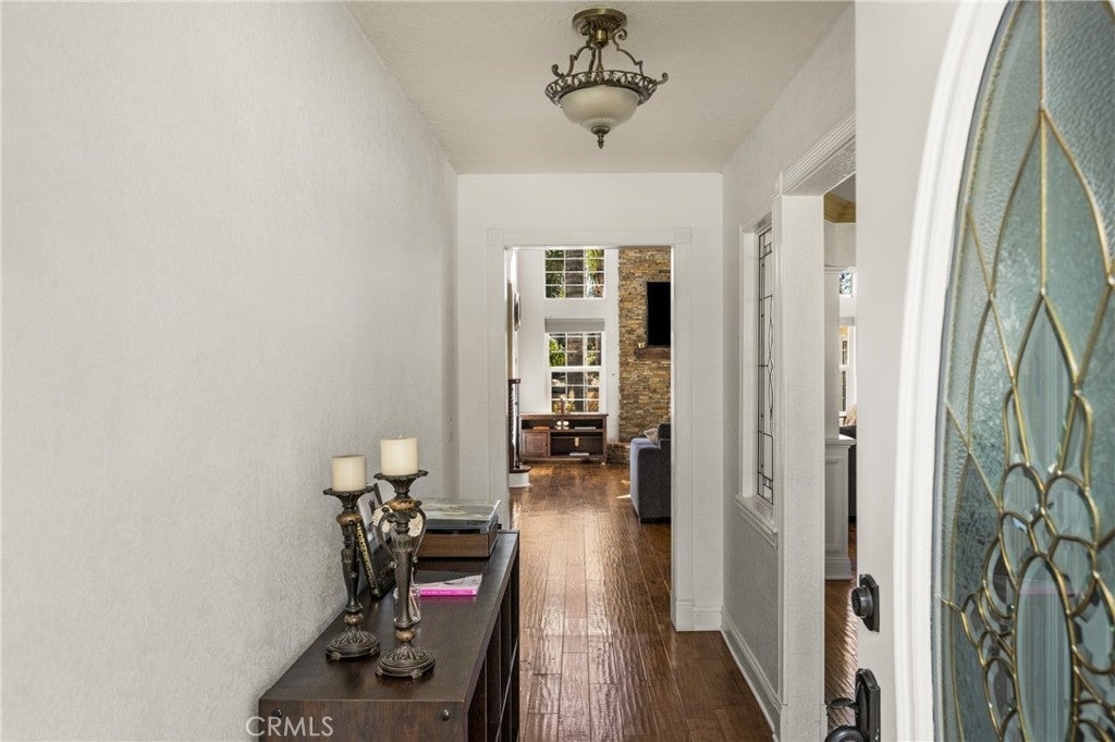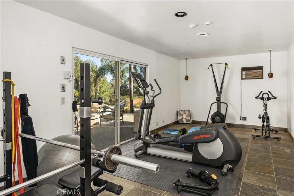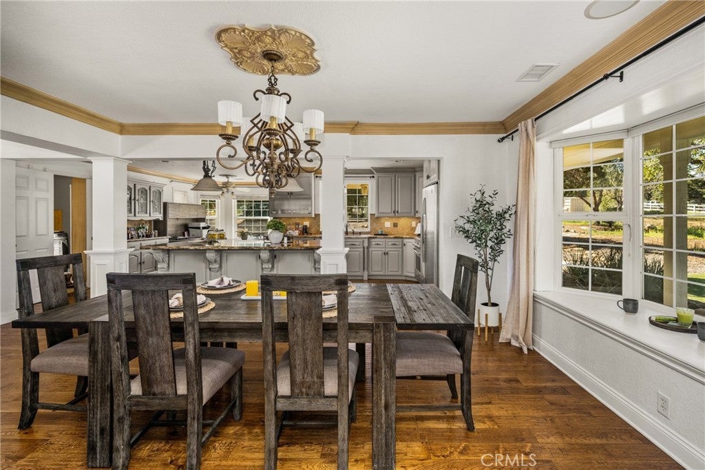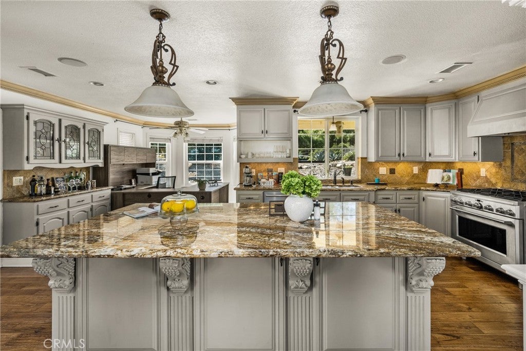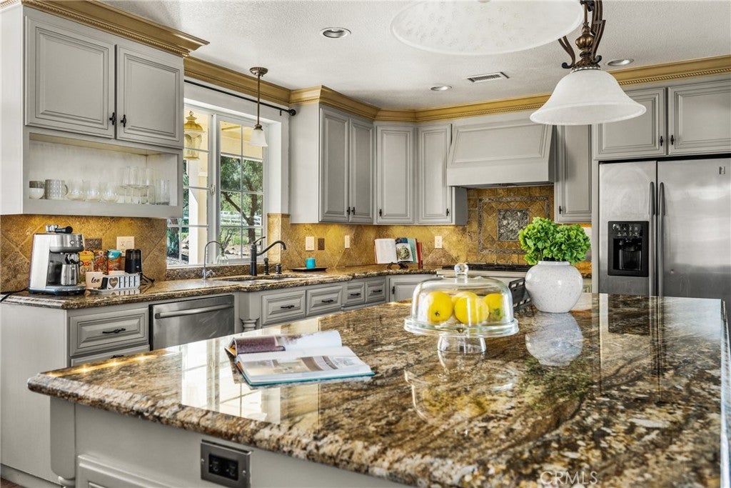 -Chaparral Hills Private Road Horse Property- A rare offering in the private road community of Chaparral Hills, this exceptional horse property defines refined country living in Menifee. Blending timeless craftsmanship with resort-style amenities, this estate presents a true multi-generational opportunity. Inside, elegant crown molding and rich hickory hardwood flooring set the tone for quality throughout. Warm and expansive, the family room showcases soaring vaulted ceilings and dramatic floor-to-ceiling stonework, creating a stunning yet inviting gathering space. The gourmet kitchen is designed to impress, featuring custom wood cabinetry, granite countertops, stainless steel appliances, a pantry, and an oversized center island ideal for entertaining. The main level offers two luxurious primary suites. The first includes a private entrance, dual walk-in closets, and a spa-inspired bath with granite counters and a walk-in shower. The second primary suite is a private haven, offering scenic backyard views, an expansive walk-in closet, and a tastefully designed ensuite bath for peaceful retreat. Upstairs, a beautifully crafted wood banister with wrought-iron balusters leads to four generously sized secondary bedrooms and two full bathrooms. A dedicated private theater room with projection and surround sound completes the upper level. Step outside to a resort-inspired backyard oasis. Swaying palms surround a sparkling pool and elevated spa, while a custom fire pit and expansive outdoor bar with built-in BBQ create the perfect space for entertaining. The grounds continue to impress with a dedicated gym room, private basketball court, and charming mini golf putting green — offering recreation and wellness right at home. Mature trees, drought-tolerant landscaping, and walking paths enhance the serene, park-like setting. A detached 3-bedroom, 2-bath guest house with a full kitchen offers exceptional privacy and separate side-street access, ideal for multigenerational living, extended guests, or rental opportunities. In addition to the main garage, a large detached secondary garage/workshop with high ceilings and finished concrete floors provides versatile space for a home office, gym, workshop, creative studio, or ultimate man-cave retreat. This extraordinary Chaparral Hills estate offers an unmatched combination of space, privacy, and lifestyle amenities — truly embodying luxury country living at its finest.