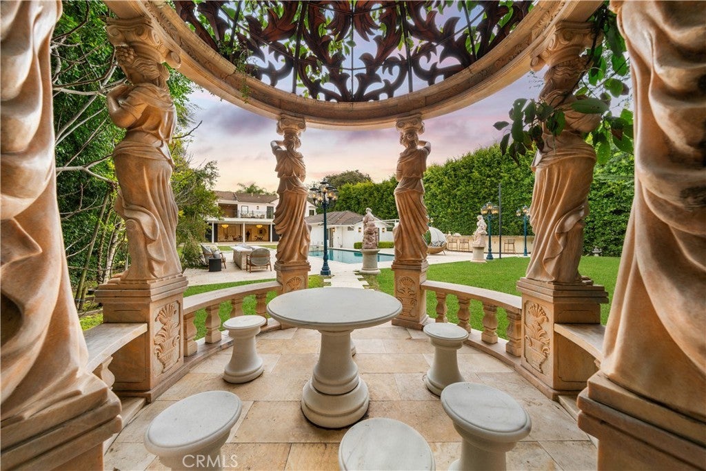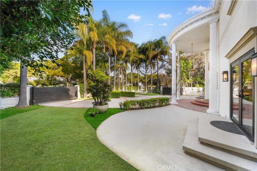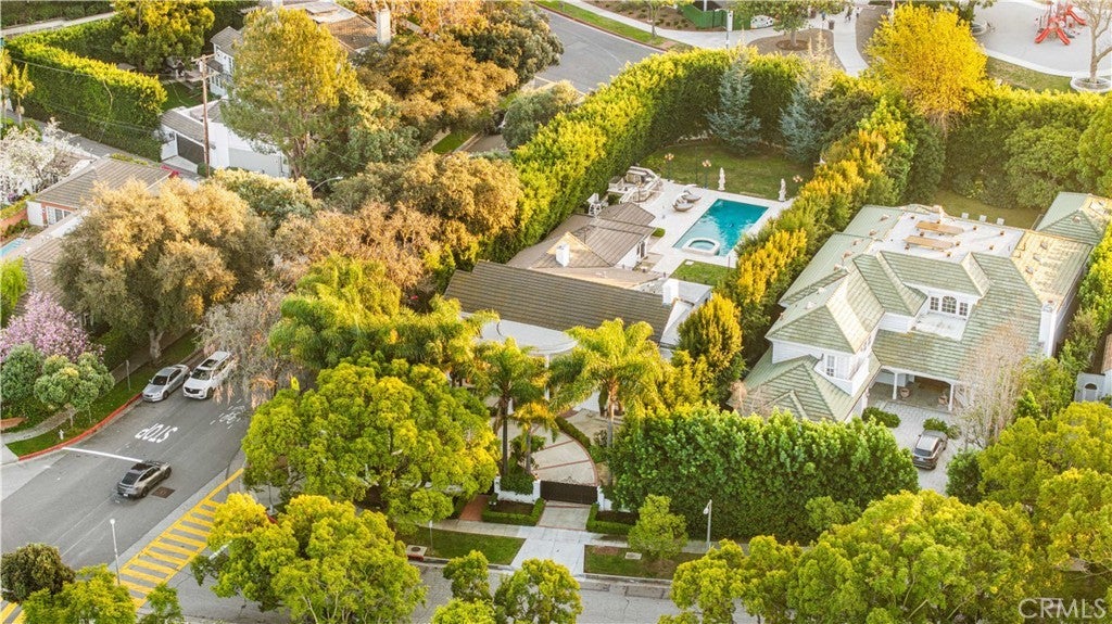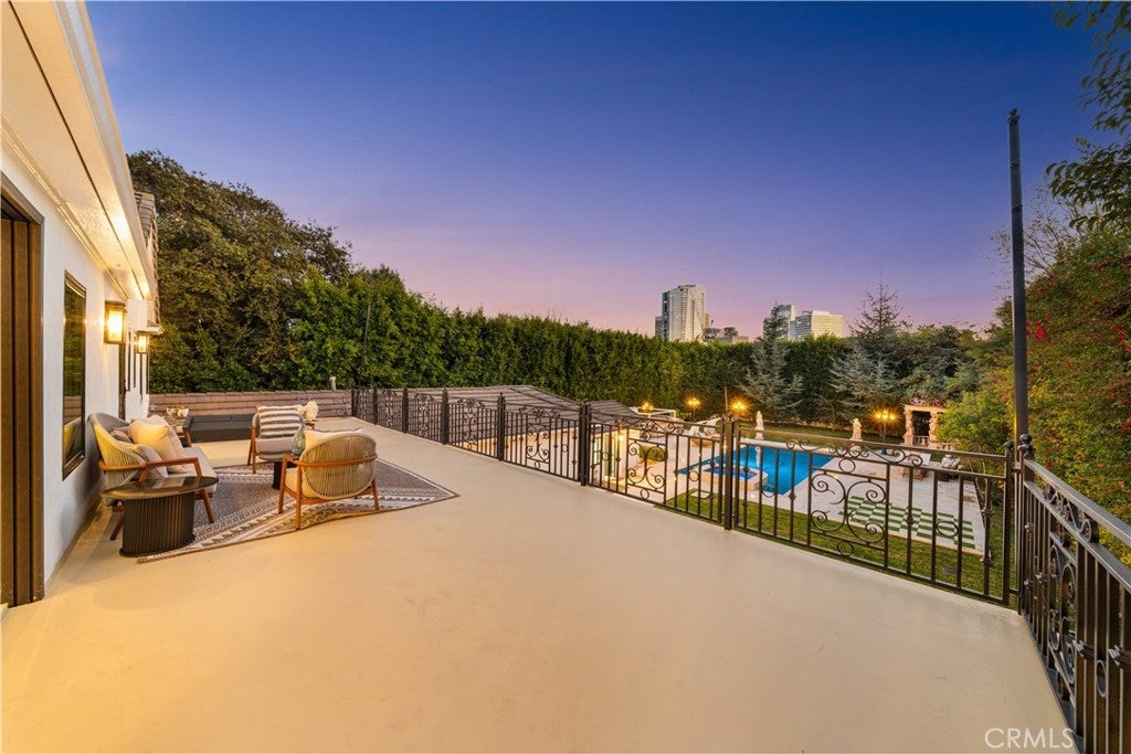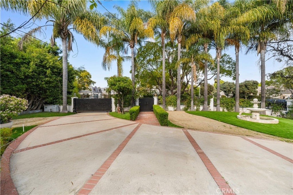 Situated on an expansive 0.43-acre lot, 701 Trenton Dr offers a two-story traditional residence with impressive curb appeal and a gated circular driveway accented by a fountain. The home features elegant living and dining rooms, along with a spacious family room with fireplace that opens through expansive glass doors to the private backyard, creating seamless indoor-outdoor living. The residence includes five bedrooms, with four located upstairs. The primary suite offers a sitting area, walk-in closets, and an oversized terrace with sweeping views toward Century City. Additional bedrooms are generously sized. The park-like backyard and yard space showcase mature landscaping, fruit trees, a resort-style pool, and a large BBQ area—ideal for entertaining, relaxing, and outdoor enjoyment. A chef’s kitchen with stainless steel appliances and breakfast area is complemented by a dedicated laundry and service wing, maid’s quarters, and a flexible bonus room. Additional features include a two-car garage and ample storage.