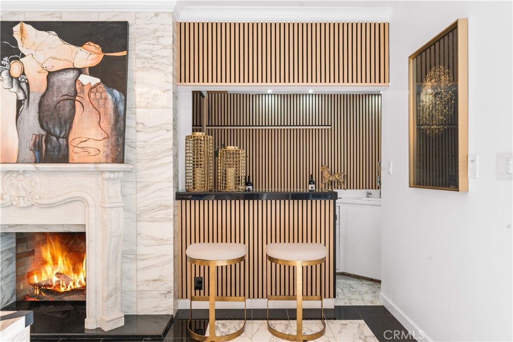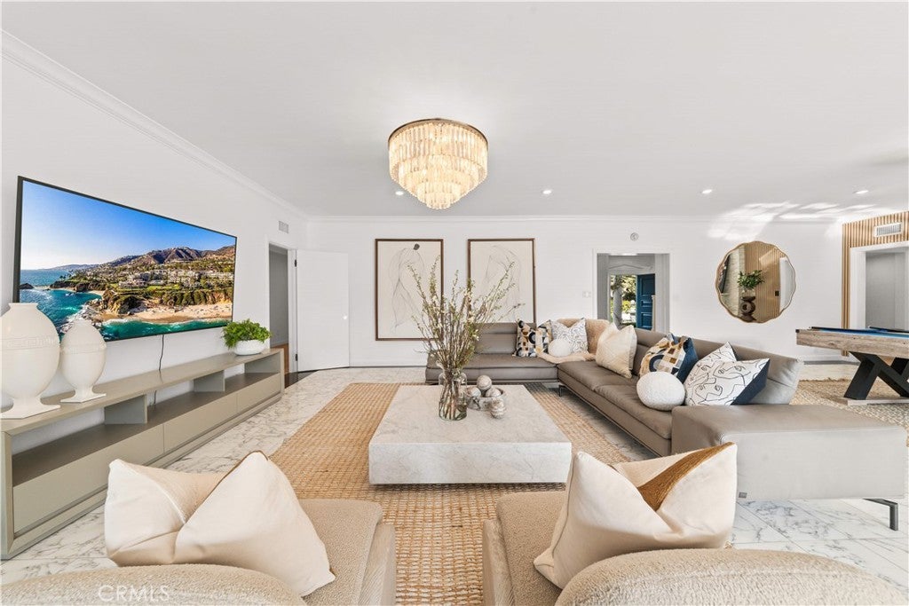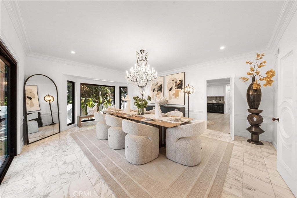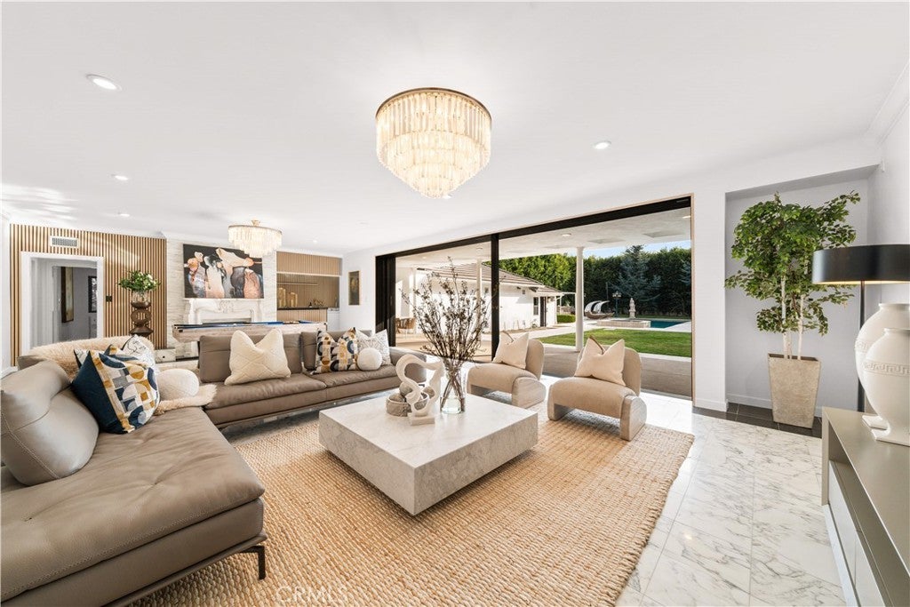 Situated on an expansive 0.43-acre lot, 701 Trenton Dr offers a two-story traditional residence with impressive curb appeal and a gated circular driveway accented by a fountain. The home features elegant living and dining rooms, along with a spacious family room with fireplace that opens through expansive glass doors to the private backyard, creating seamless indoor-outdoor living. The residence includes five bedrooms, with four located upstairs. The primary suite offers a sitting area, walk-in closets, and an oversized terrace with sweeping views toward Century City. Additional bedrooms are generously sized. The park-like backyard and yard space showcase mature landscaping, fruit trees, a resort-style pool, and a large BBQ area—ideal for entertaining, relaxing, and outdoor enjoyment. A chef’s kitchen with stainless steel appliances and breakfast area is complemented by a dedicated laundry and service wing, maid’s quarters, and a flexible bonus room. Additional features include a two-car garage and ample storage.