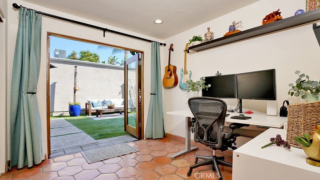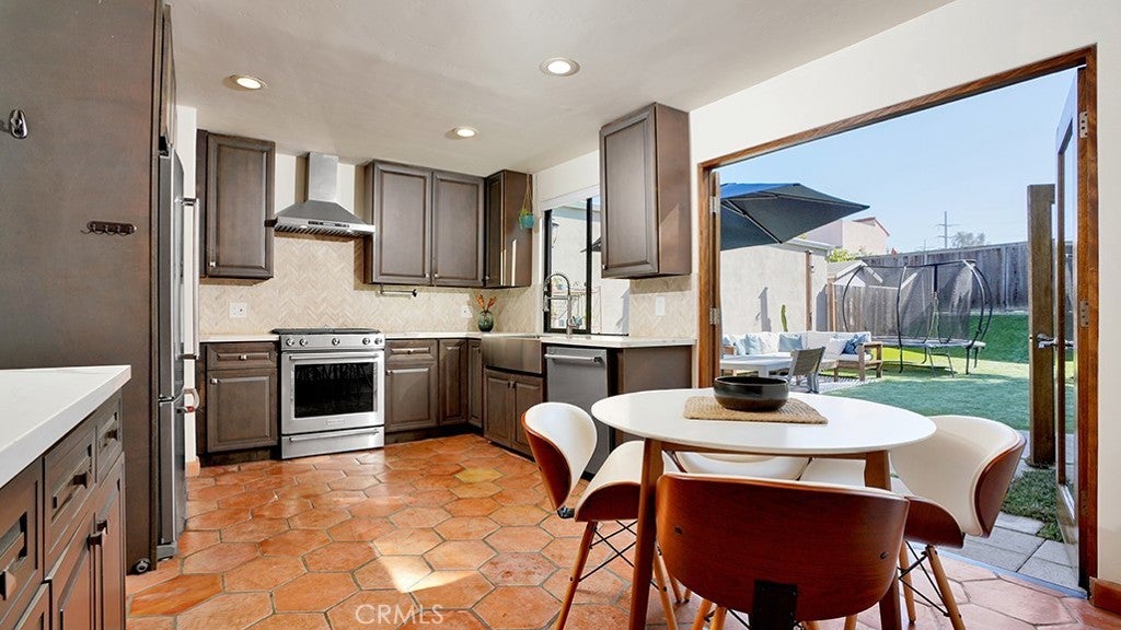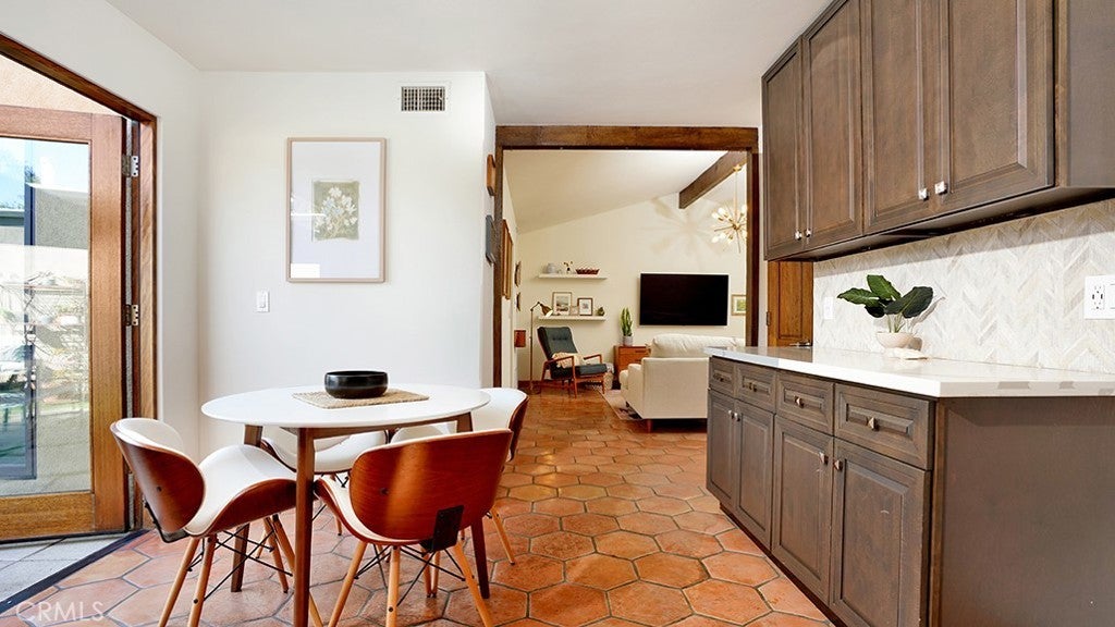 Welcome to the desirable Las Brisas community of San Juan Capistrano, where timeless Spanish charm meets thoughtful mid-century design. This beautifully updated three-bedroom, two-bath, single-level detached home offers warmth, character, and effortless livability throughout. Inside, smooth stucco walls, vaulted ceilings with exposed wood beams, handcrafted wood doors, and classic Saltillo tile flooring create a rich architectural backdrop filled with texture and warmth. The updated kitchen blends style and function with dark wood cabinetry, light countertops, and a striking patterned tile backsplash that complements the home’s finishes. Stainless steel appliances, a farmhouse-style sink, recessed lighting, and a modern vent hood complete the space. French doors open to a spacious, private backyard designed for both everyday enjoyment and entertaining. The outdoor space features a paver patio for dining and lounging, expansive turf areas, and multiple zones for gathering, play, and relaxation. Two of the three bedrooms offer direct access to the backyard, enhancing the home’s seamless indoor-outdoor flow. Both bathrooms have been updated, with one featuring a bathtub and the other a walk-in shower. Additional highlights include recessed lighting throughout, a newer roof, an epoxy-coated garage floor, and a low HOA of under $50 per month. Ideally located just a short stroll from historic downtown San Juan Capistrano, including shops, dining, and the vibrant River Street district. Enjoy convenient access to beaches, hiking trails, golf courses, equestrian facilities, a skate park, and major freeways. Don't miss this rare opportunity to own a chacter-rich, move-in ready single-family detached home in San Juan Capistrano, this one will go fast.