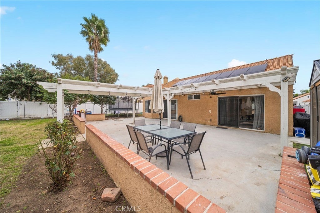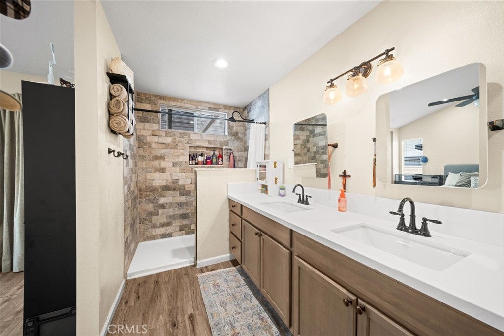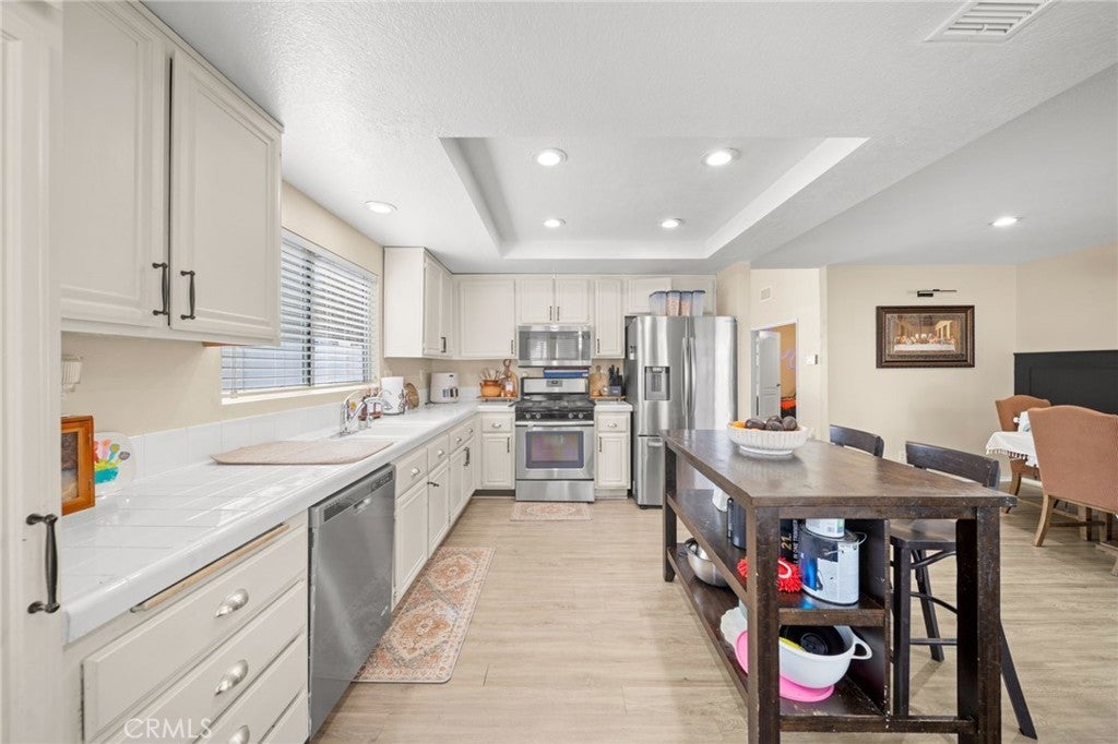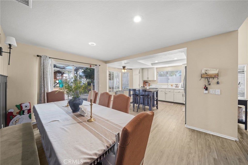 Welcome to this beautifully maintained home located in the desirable Menifee Lakes community. The light-filled living room features high ceilings, laminate wood flooring, and a cozy gas fireplace. The kitchen overlooks the spacious backyard, providing an ideal layout for everyday living and entertaining. The primary bedroom offers vaulted ceilings, dual mirrored closet doors, and a recently renovated ensuite bathroom, along with direct access to the backyard patio through a sliding glass door. Two additional secondary bedrooms include mirrored closet doors, with one featuring a double-door entry—ideal for guests, an office, or a flex space. Additional highlights include laminate wood flooring throughout, newer central air conditioning, ceiling fans in all rooms, epoxy-coated garage flooring, mature backyard trees, and a long driveway providing ample parking. Residents enjoy access to community amenities including a pool, walking trails, and neighborhood events. Menifee Lakes is within walking distance and offers recreational opportunities such as hiking, biking, and fishing.