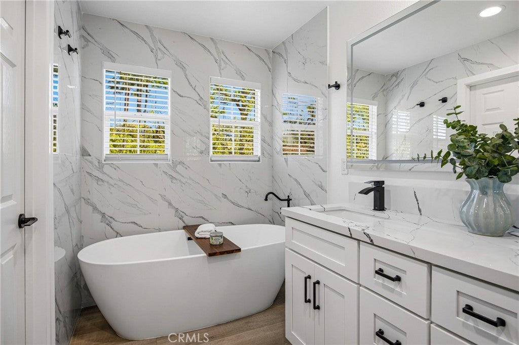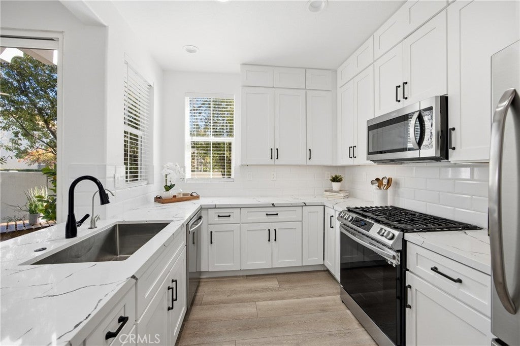 This beautifully renovated Savannah residence offers 3 bedrooms and 2.5 baths, thoughtfully updated from top to bottom. Recently refreshed and move-in ready, the home features elegant luxury vinyl plank flooring throughout, including the staircase. The light and bright modern kitchen showcases ceiling-height white shaker cabinetry, sleek subway tile backsplash, stainless steel appliances, and quartz countertops. All bathrooms have been elevated with quartz surfaces and designer tile for a refined, cohesive look. Enjoy the serenity of a private yard with scenic park views—perfect for relaxing or entertaining. Ideally positioned as an end property, this home is just moments from Ladera’s award-winning schools, pristine parks, and vibrant community amenities.