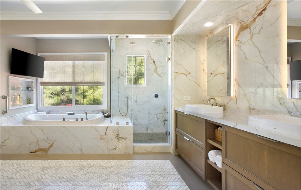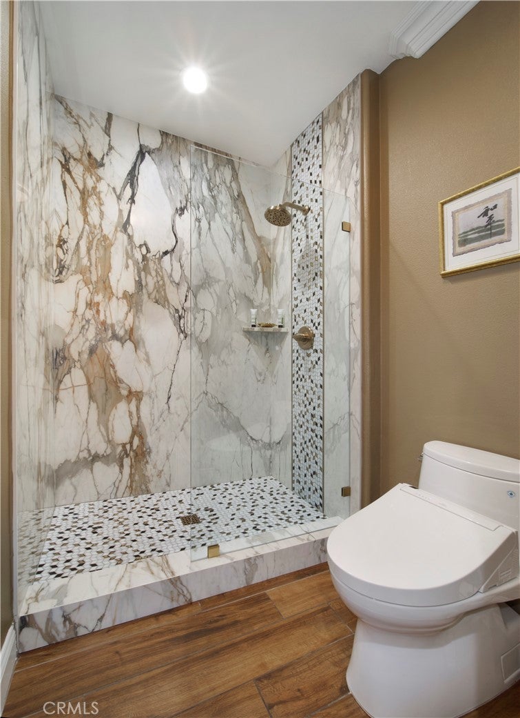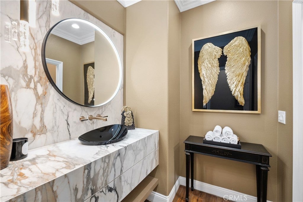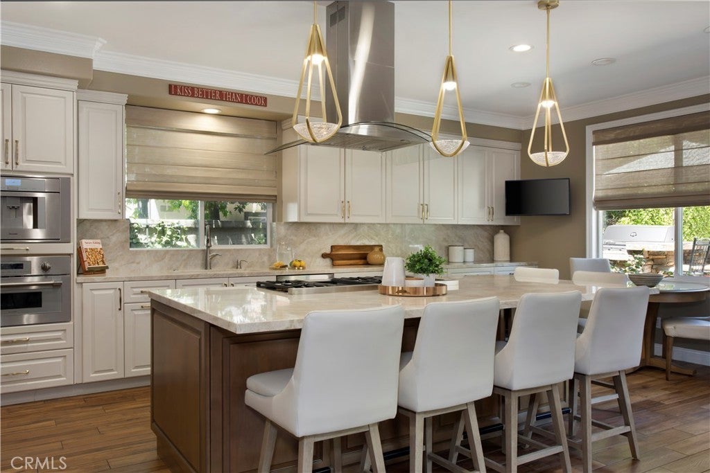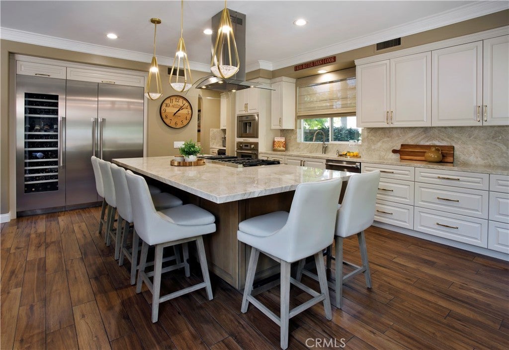 Located in the guard-gated community of Coto de Caza, this highly upgraded home radiates pride of ownership with extensive updates and modern luxuries at every turn, now on the market for the first time in over twenty years. Italian porcelain flooring flows through most of the main level, alongside a dedicated office with built-in desks. Entertaining is effortless with a wine room with built-in wine wall and a new bar room complete with icemaker and fridge. The kitchen was recently taken down to the studs and rebuilt with custom soft-close cabinetry, butler’s pantry, and top-of-the-line Thermador appliances including a six-burner gas range, double oven, speed ovens built-in coffee maker and wine fridge. Comfort and technology blend seamlessly with leased solar panels, Ring doorbell, Honeywell alarm system, and all new Hunter Douglas blinds with a lifetime warranty. Smart home features also include a custom high-end mesh network and Control4 system, allowing you to control the TV, audio, and thermostat from your iPad, with speakers installed throughout the living areas, primary suite and outdoors. Bifold doors stretch across the back of the family room to extend your living space right into the backyard. This outdoor paradise features a large heated Pebble Tec pool with waterfalls and a jacuzzi. Host gatherings with the brand new Lynx grill, pizza maker, outdoor TV and fridge, or relax by the fire pit surrounded by fruit trees, designer roses, fountains and custom lighting. The laundry room is also recently renovated with new cabinetry and the washer and dryer included. All bathrooms have been recently remodeled, and each bedroom features mirrored wardrobe doors. The upper level also hosts a finished attic for storage and a hall with built-in bookshelves and reading nook. The primary suite features a private fireplace and beverage bar. The spa-inspired primary bathroom offers a bubbler tub and MrSteam shower with aromatherapy, Toto heated washlet,Robern medicine cabinets, and a walk-in closet by Closet World. Residents enjoy access to local horse trails and you also have the option to join as a Social Member to enjoy fitness or become a Full member to enjoy tennis, pickleball and two championship golf courses designed by Robert Trent Jones Jr. at the renowned Coto de Caza Golf & Racquet Club. Located only minutes from diverse shopping and dining, this property offers a rare combination of luxury updates and active community living in a spectacular setting.