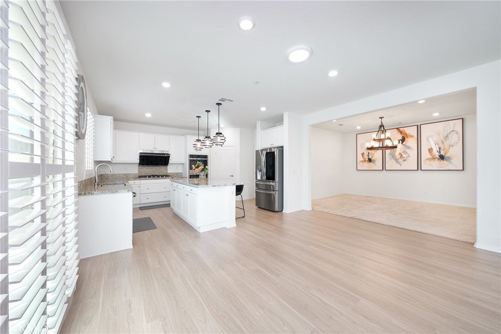 Built in 2021 by Lennar, this beautifully upgraded home is located in the desirable Park Lane community, just minutes from Costco, shopping, dining, and with easy access to Highways 60 & 15. Featuring an open-concept layout, the home is bright and functional with a stylish fireplace in the main living area. The upgraded kitchen offers white cabinetry, cooktop, upgraded range hood, double ovens, and a built-in water filtration system. A whole-house water softener system adds everyday comfort. The first-floor bedroom and full bathroom provide ideal flexibility for guests or multi-generational living. Upstairs includes a spacious loft and a primary suite with a walk-in closet. Additional highlights include solar panels for energy efficiency, a protective mesh safety screen, and fully finished front and backyard landscaping designed for easy maintenance. Move-in ready, low maintenance, and very competitively priced—an excellent opportunity in a sought-after neighborhood.