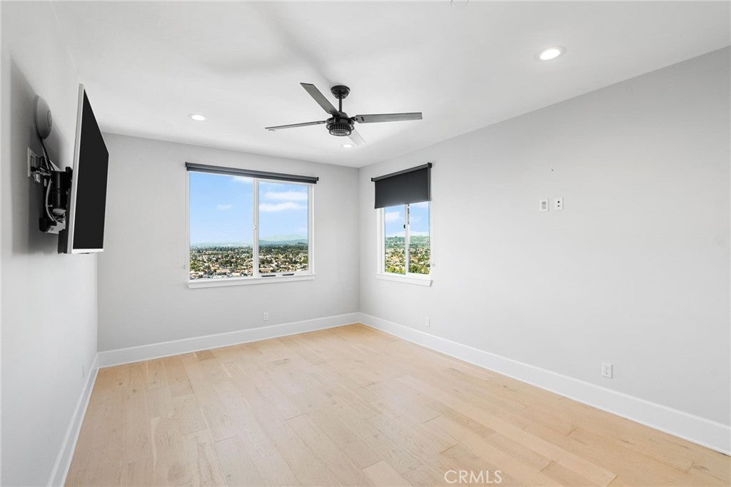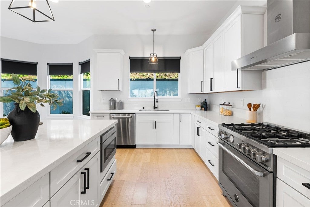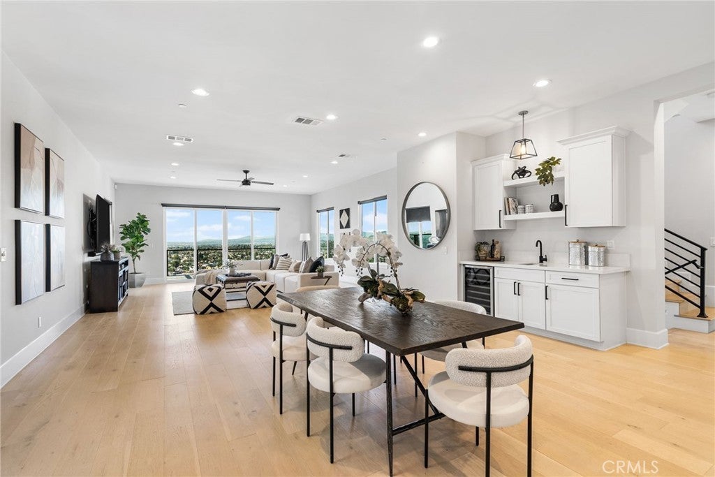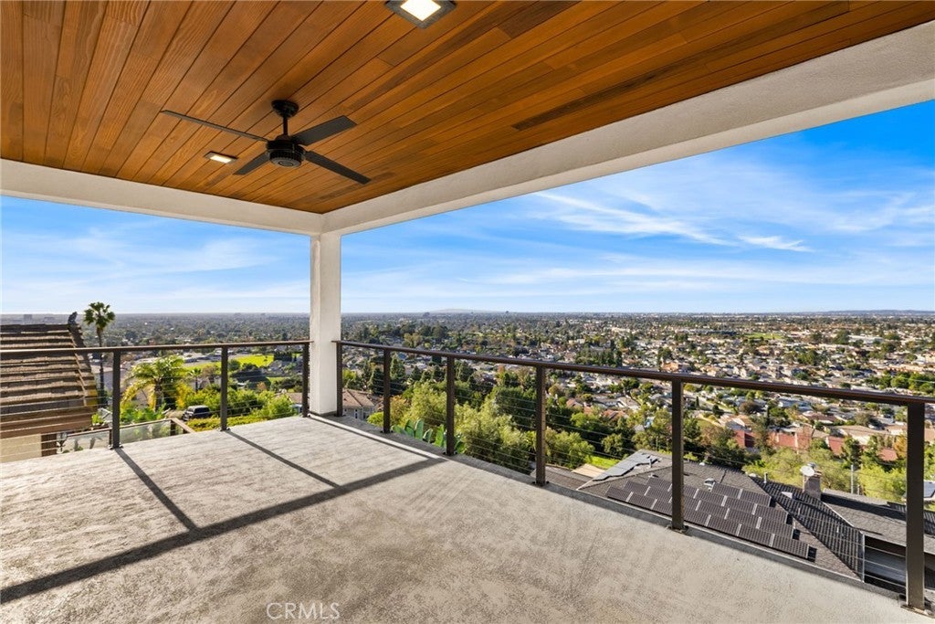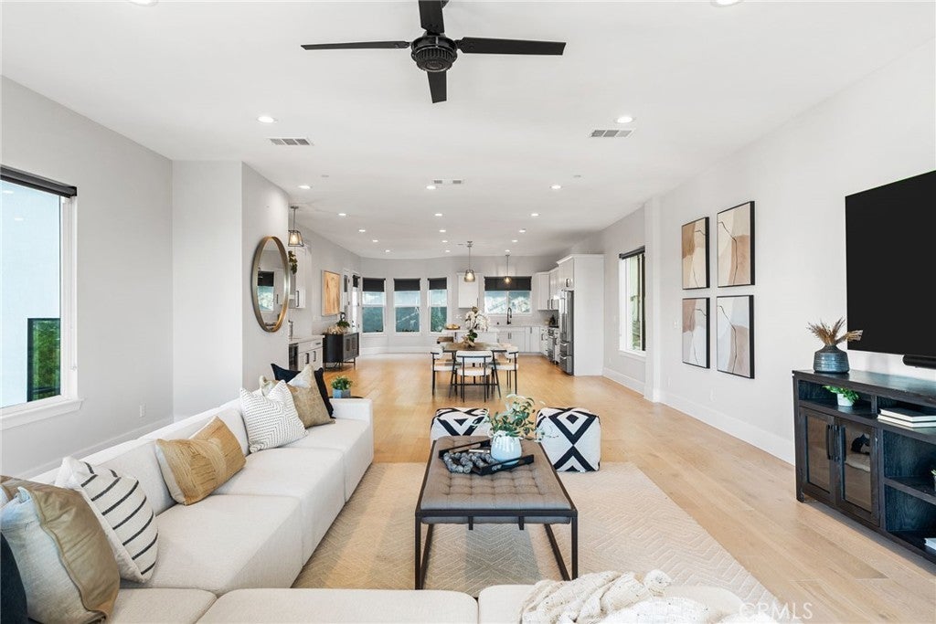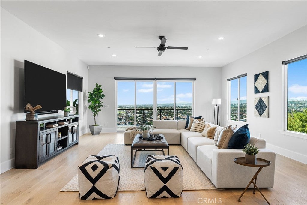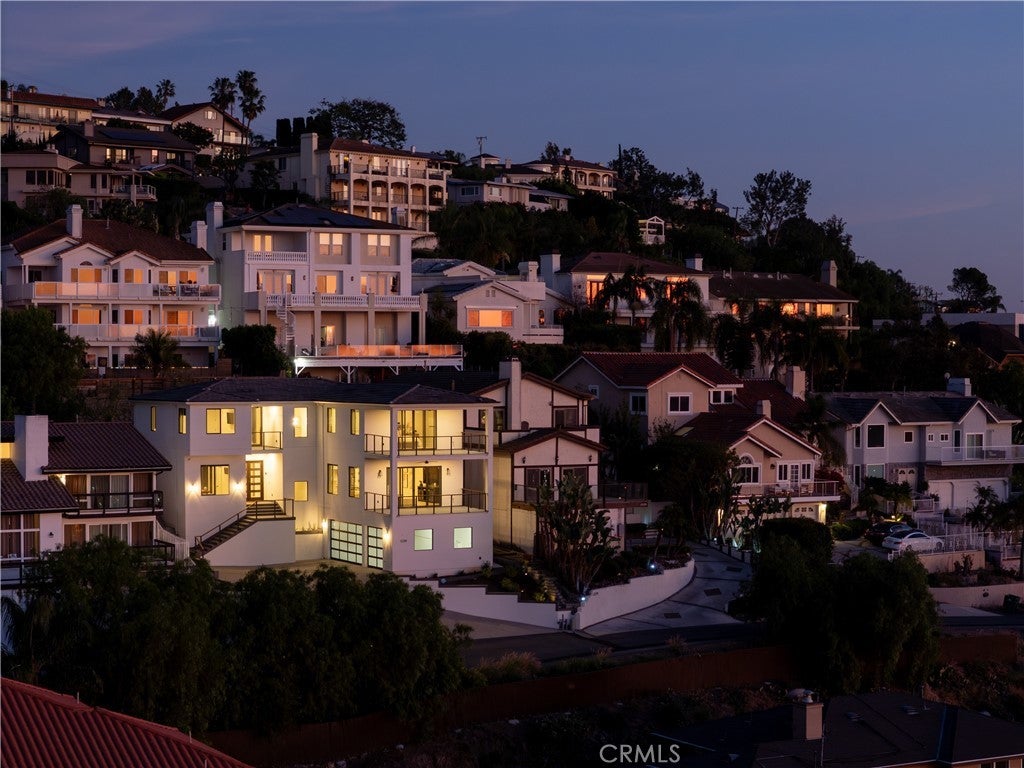 Contemporary Hilltop Retreat with Sweeping Year Round Sunset Views. Perched high in one of North Tustin’s most coveted neighborhoods, this 2020-built modern residence captures unobstructed west-facing vistas—snow-capped mountains, the sparkling Pacific, Catalina Island, even downtown LA and of course, the Disneyland fireworks. Spanning 4,075 sq ft, the home offers four bedrooms, three full baths, and two half baths, designed for effortless entertaining and relaxed everyday living. Ten-foot ceilings (nine in the bedrooms) and an airy open plan unite the kitchen, dining, and family rooms, while a formal living room with fireplace, a flexible den/office or fifth bedroom, and three view balconies invite gathering or quiet retreat. The chef’s kitchen impresses with white shaker cabinetry, quartz counters, an oversized island, walk-in pantry, and premium stainless appliances—including a six-burner range, coffee bar and wine cooler. The 800 sq ft primary suite is a private sanctuary featuring a spa-inspired bath, expansive walk-in closet, and a 200 sq ft balcony for soaking in amazing sunsets. A built-in, wall-mounted, self-cooled data rack underscores the home’s tech-forward design. Outside, the backyard is ready for a hot tub, garden, or play space, and the three-car garage provides generous storage. Combining luxury, comfort, and incomparable views, this hilltop masterpiece offers a lifestyle that is as breathtaking as its views.