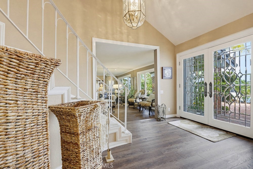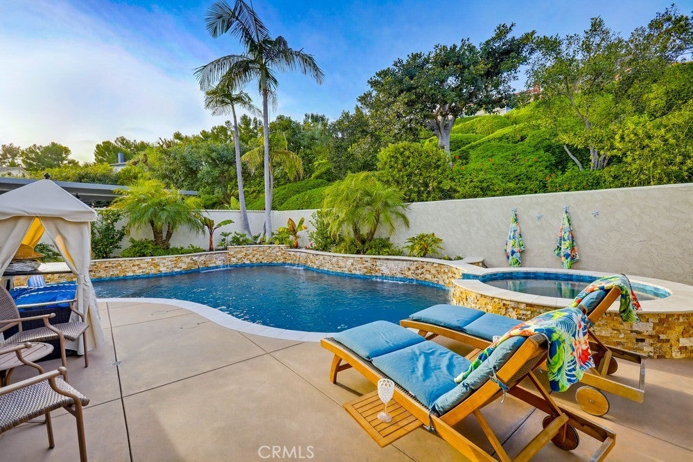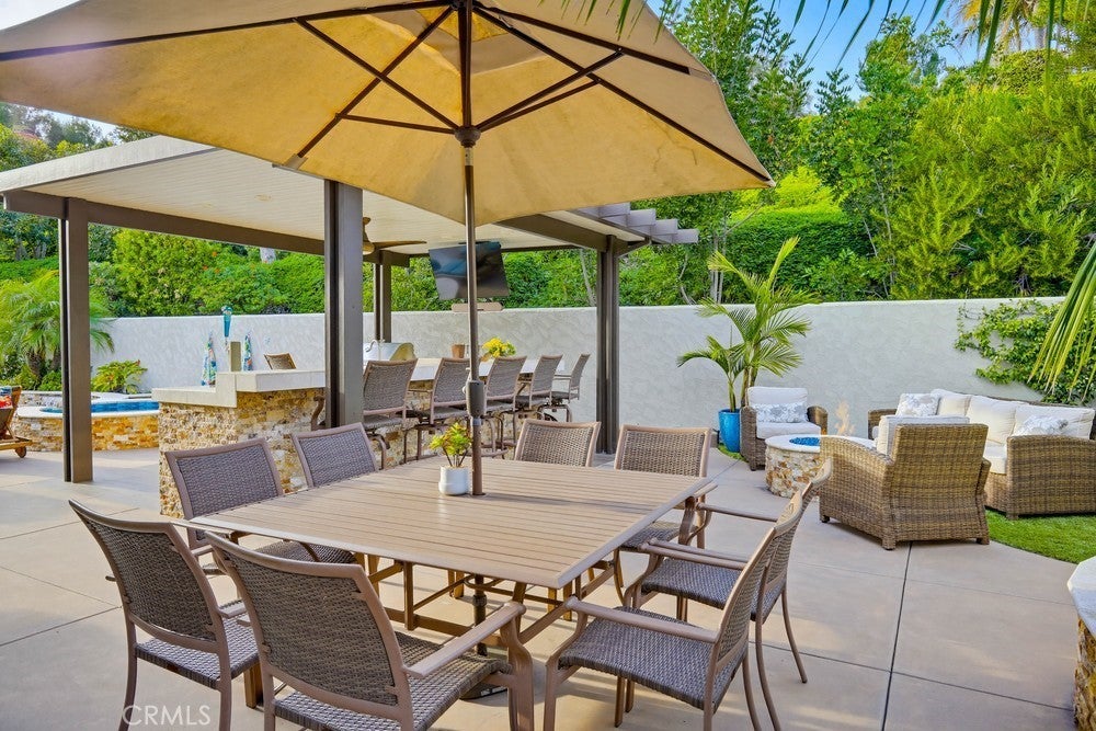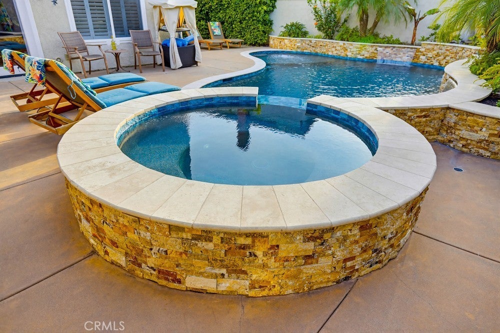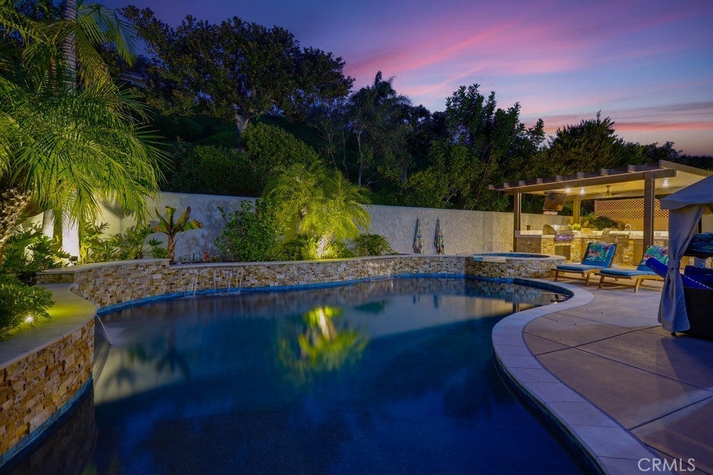 YOUR PRIVATE SANCTUARY AWAITS! Tucked into a tranquil cul-de-sac, this exceptional residence unveils a resort-inspired outdoor oasis unlike anything else on the market. Designed for both grand entertaining and intimate relaxation, the expansive backyard centers around a breathtaking 22,000-gallon custom pool and spa, framed by lush landscaping and serene hillside views. The pool’s deep-blue PebbleTec finish, infinity-edge Jacuzzi, sheer-descent waterfalls, and oversized Baja shelf with bubbler and umbrella sleeve create a true luxury retreat. A fully appointed outdoor kitchen—featuring a 3-burner Delta grill with a sear zone and rotisserie, an additional gas burner, a refrigerator, a kegerator, and elegant travertine counters—sits beneath a sophisticated Alumawood patio cover. A gas firepit, outdoor shower, and private putting green complete this extraordinary space. Inside, the home continues to impress with a gourmet kitchen showcasing quartz countertops, custom European cabinetry, and premium stainless-steel appliances. The spacious primary suite overlooks the pool and rolling hills, while the fully reimagined primary bath offers custom cabinetry, an exquisite flagstone shower with three shower heads, radiant onyx counters, and matching flagstone flooring. The secondary upstairs bath features granite counters, a quartz shower, and radiant floor heating. Four generous secondary bedrooms, including one conveniently located downstairs, provide comfort and versatility, with the guest room enhanced by a built-in Murphy bed. Additional upgrades include new LVP flooring downstairs, newer carpet upstairs, vinyl windows, custom interior doors, and French doors opening from the dining room to the outdoor dining area. Residents enjoy access to exceptional community amenities, including scenic walking trails, a premier tennis center, and coveted Lake Mission Viejo membership. This is a rare offering—an extraordinary home that blends luxury, comfort, and resort-style living in perfect harmony.