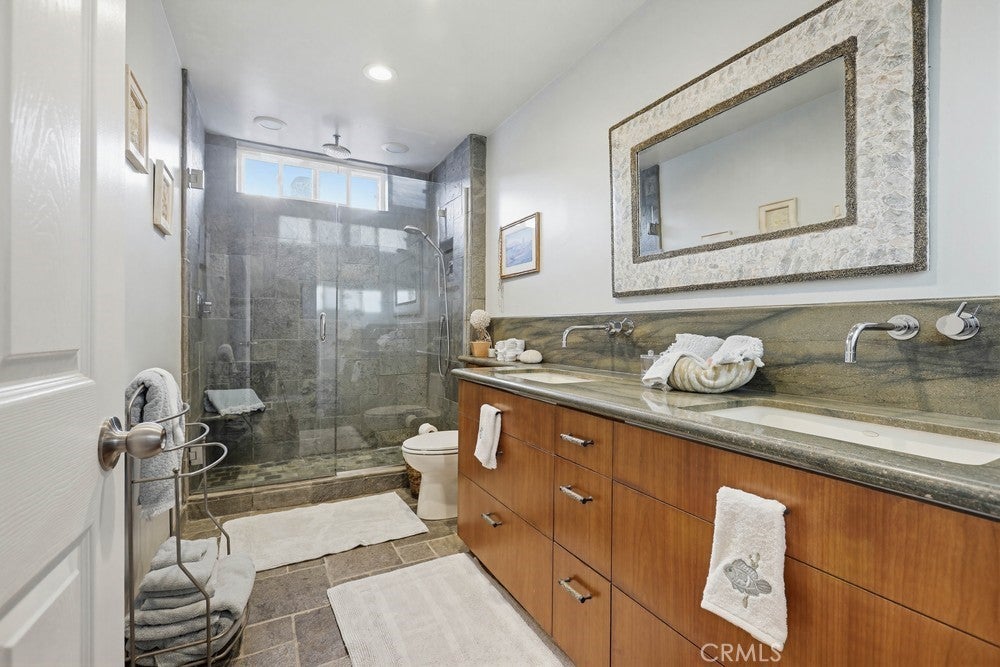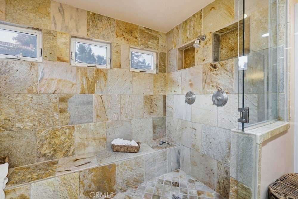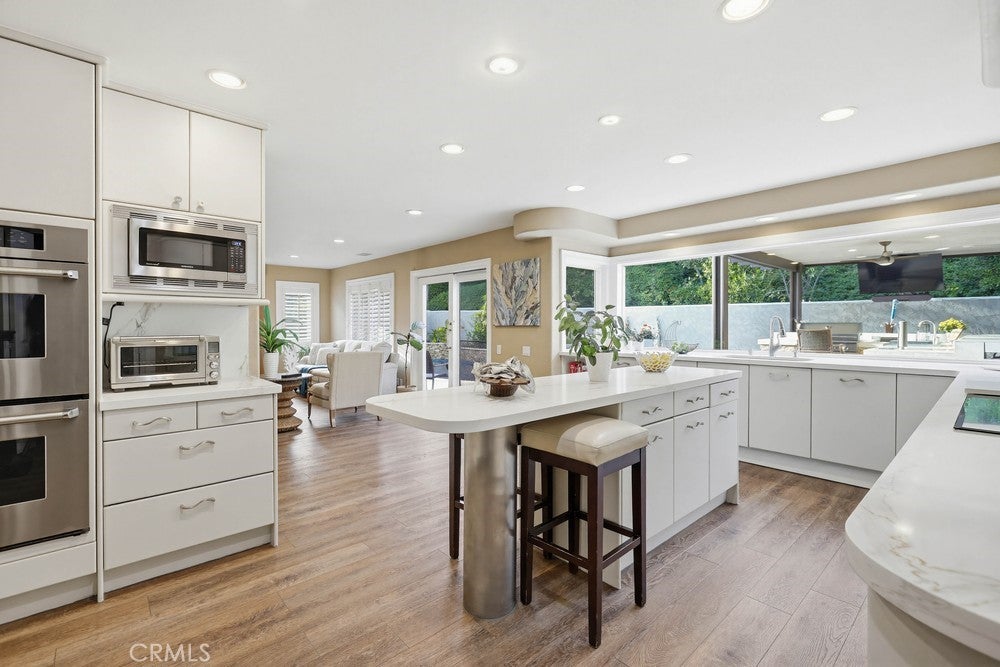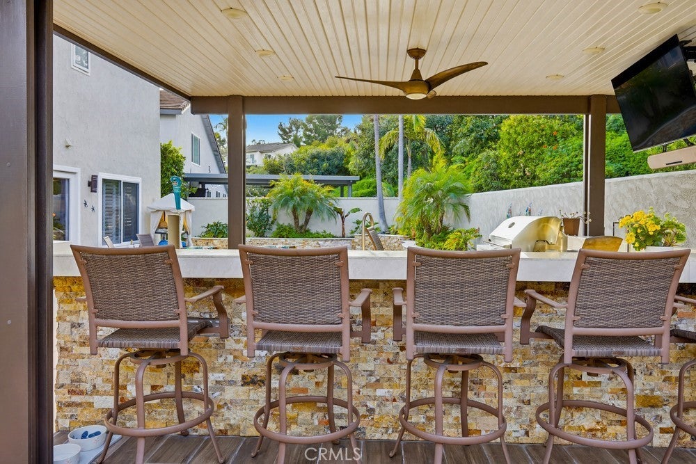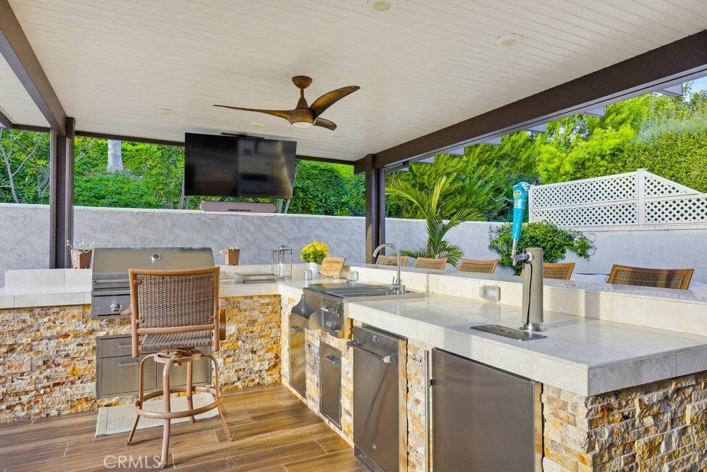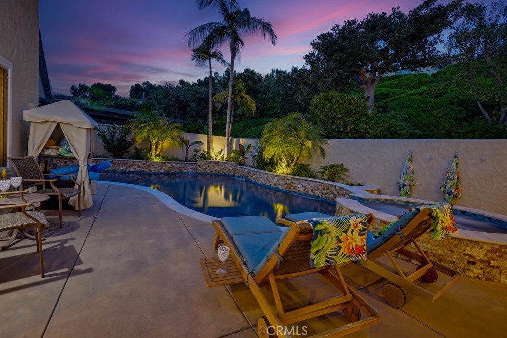 YOUR PRIVATE SANCTUARY AWAITS! Tucked into a tranquil cul-de-sac, this exceptional residence unveils a resort-inspired outdoor oasis unlike anything else on the market. Designed for both grand entertaining and intimate relaxation, the expansive backyard centers around a breathtaking 22,000-gallon custom pool and spa, framed by lush landscaping and serene hillside views. The pool’s deep-blue PebbleTec finish, infinity-edge Jacuzzi, sheer-descent waterfalls, and oversized Baja shelf with bubbler and umbrella sleeve create a true luxury retreat. A fully appointed outdoor kitchen—featuring a 3-burner Delta grill with a sear zone and rotisserie, an additional gas burner, a refrigerator, a kegerator, and elegant travertine counters—sits beneath a sophisticated Alumawood patio cover. A gas firepit, outdoor shower, and private putting green complete this extraordinary space. Inside, the home continues to impress with a gourmet kitchen showcasing quartz countertops, custom European cabinetry, and premium stainless-steel appliances. The spacious primary suite overlooks the pool and rolling hills, while the fully reimagined primary bath offers custom cabinetry, an exquisite flagstone shower with three shower heads, radiant onyx counters, and matching flagstone flooring. The secondary upstairs bath features granite counters, a quartz shower, and radiant floor heating. Four generous secondary bedrooms, including one conveniently located downstairs, provide comfort and versatility, with the guest room enhanced by a built-in Murphy bed. Additional upgrades include new LVP flooring downstairs, newer carpet upstairs, vinyl windows, custom interior doors, and French doors opening from the dining room to the outdoor dining area. Residents enjoy access to exceptional community amenities, including scenic walking trails, a premier tennis center, and coveted Lake Mission Viejo membership. This is a rare offering—an extraordinary home that blends luxury, comfort, and resort-style living in perfect harmony.