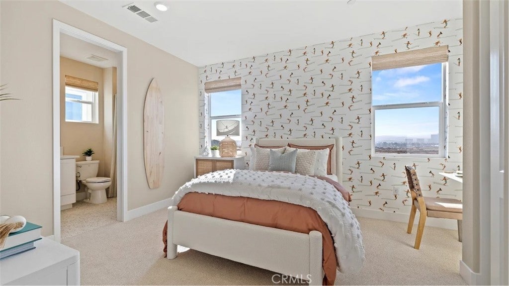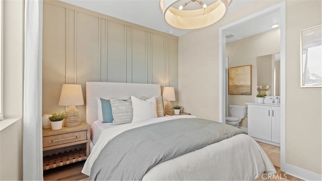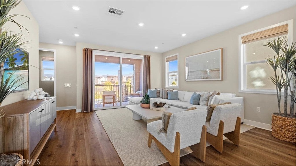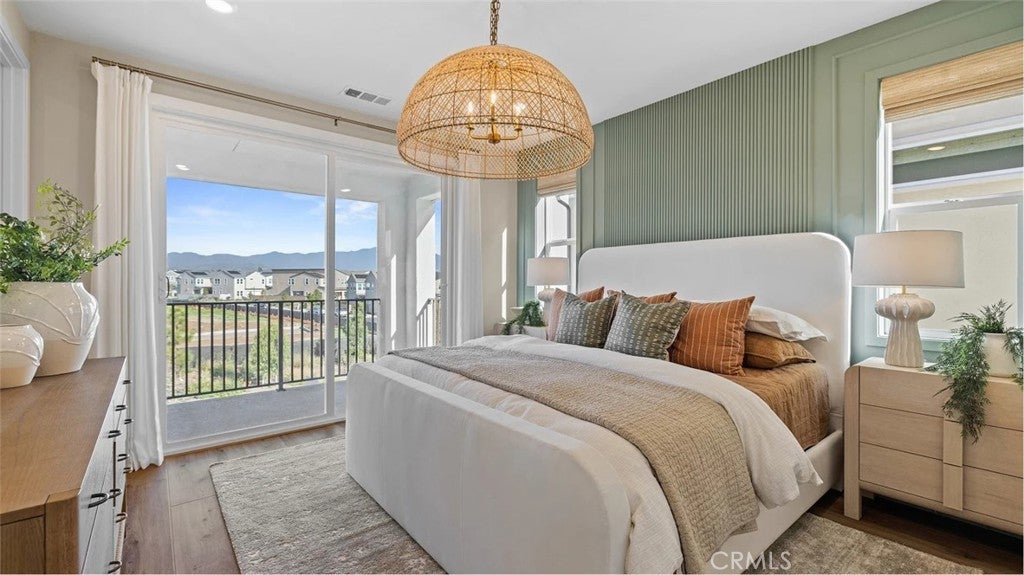 At Great Park's newest home collection RHEA, the plan 1 home features a flexible and well-designed home built for modern living. The 1st floor features a 2-bay garage and a bedroom perfect for guests, or a private home office. The second floor showcases an entertainer’s kitchen with an large kitchen island, plentiful cabinets for storage, and a spacious balcony. The third floor offers a spacious primary with an extra long private balcony. There is an equally spacious secondary bedroom with its on en-suite bathroom. Between the secondary bedroom and the primary suite is a conveniently located laundry closet. This home is just a short walk to a stunning 13-acre park with beautiful amenities including 2 pools, pickle ball, handball, basketball, tot-lot and more. The home is in a desirable street-facing location, offering easy guest parking in front.