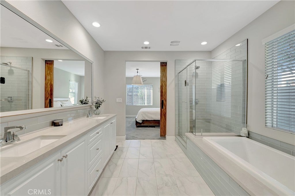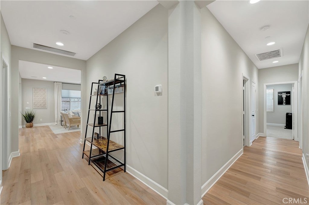 OVER $200,000 IN UPGRADES AND A MULTI-GEN SUITE!! Newly built in 2020, this beautiful Audie Murphy Ranch home sets itself apart with stunning upgrades and was one of the original model homes. With 2,881 sqft of living space on a spacious 8,712 sq foot lot, this single-story home has 4 bedrooms, 4 bathrooms and a tandem 3 car garage. Walk inside and you’ll find high ceilings, plenty of lighting and a dream open concept chef's kitchen with a large island, Quartz countertops, custom cabinetry, and a large walk-in pantry. With a dining room big enough to seat the whole crew, the adjacent living room, multi-gen suite and California room all have built in speakers, which make this home perfect for entertaining. The spacious primary bedroom has a custom sliding barn door to it's private bathroom, featuring dual sinks, a soaking tub, walk in shower with tile and seat, and an extra-large walk-in closet. Completing this amazing home is its multi-gen suite with separate entrance, cabinets with countertop, sink, mini-refrigerator, a private ¾ bathroom and a second washer and dryer! To add icing on the cake, the owner has added plenty of additional storage throughout the home and the garage, extra solar panels, a solar skylight, whole house fan, permanent holiday lighting, rain gutters, and electric car charging outlet. All of this located inside the incredible Audie Murphy Ranch community with a recreation center, swimming pool, spa, sports courts, hiking trails, and more.