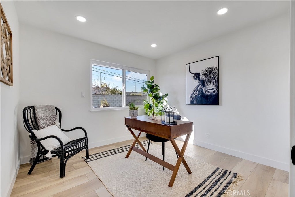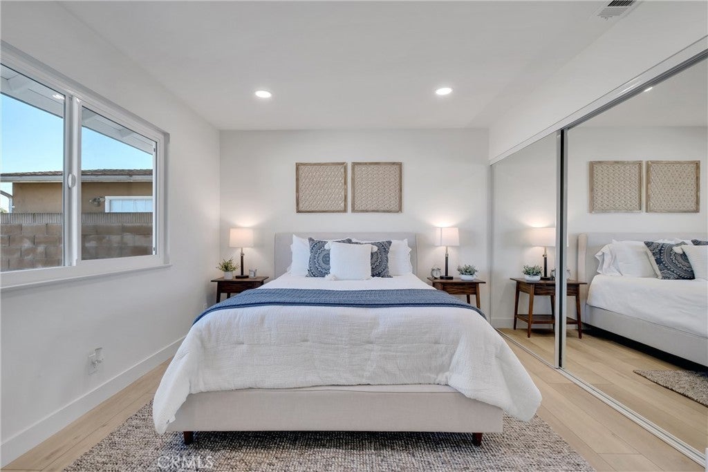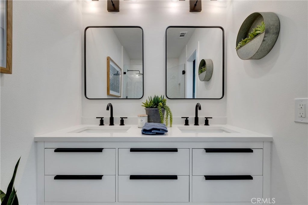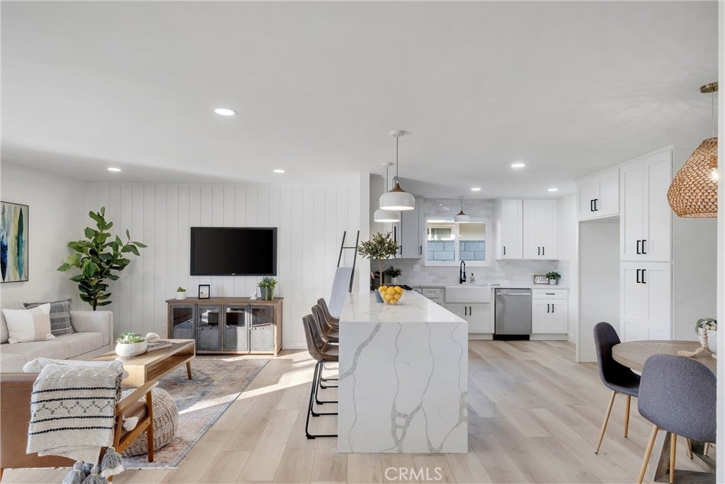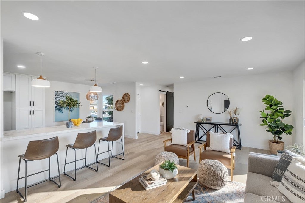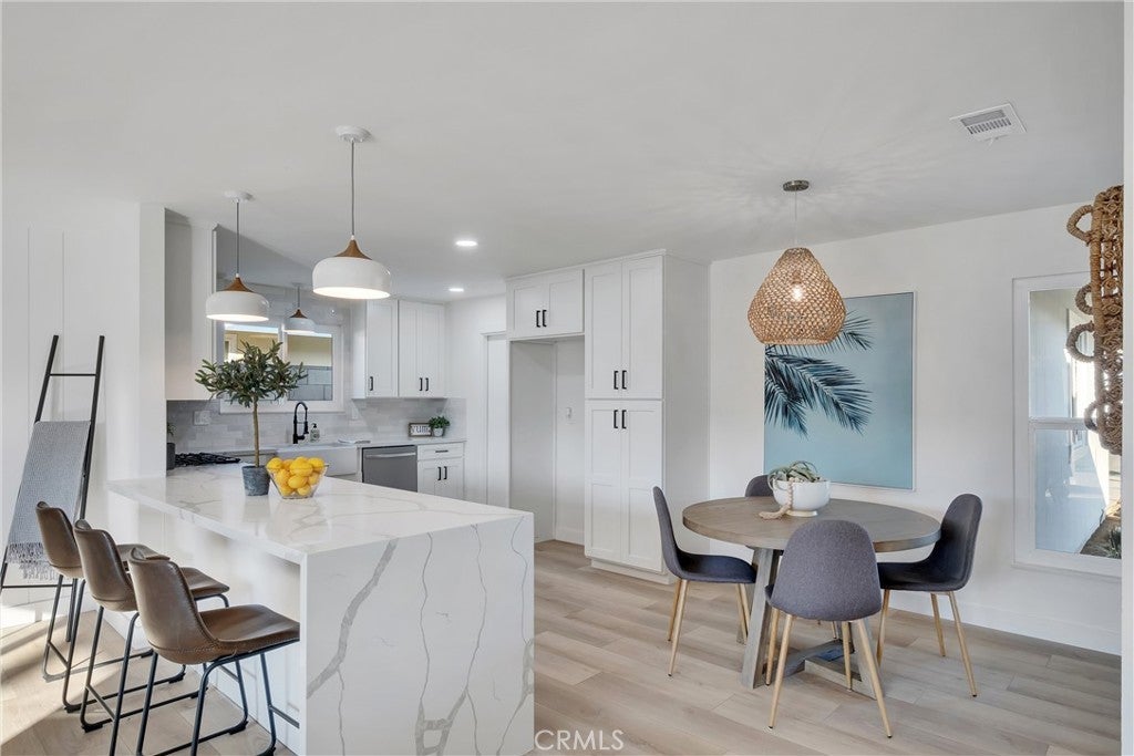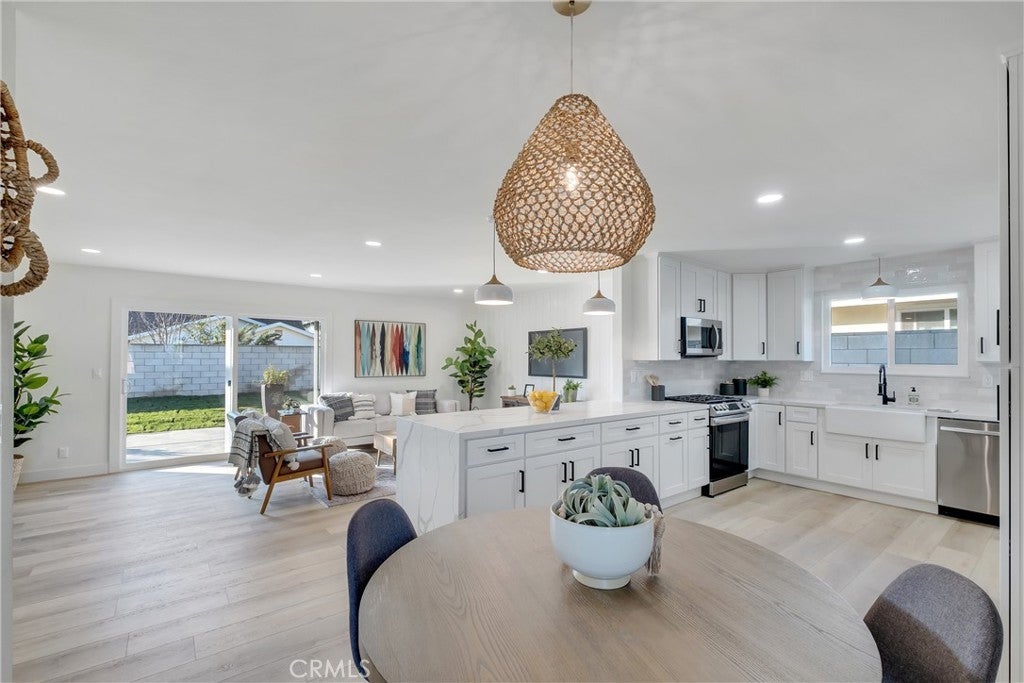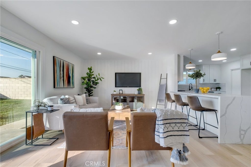 Absolutely breathtaking Huntington Beach home, nestled in a beautiful family neighborhood, completely re-imagined from top to bottom, inside & out in 2022! Every detail of the home has been meticulously taken into consideration, with impressive features, layout, and flow inspired by a professional design team. Some details include: breath-taking kitchen and bathrooms, whole house re-pipe, dual pane windows, new hardscape & landscape, finished garage, etc!! The dining area is appointed with massive windows and a boho style chandelier, bringing beautiful light into the space. The kitchen features a massive 8 foot peninsula with waterfall finish, crisp shaker cabinetry, and modern lighting and fixtures. The main living area features stunning floor to ceiling wide plank vertical shiplap that brings texture and personality. Your primary bedroom retreat features an enormous bathroom with stylish and unique finishes, not normally found in other homes on the market. The guest bathroom is extremely impressive with fun pattern tiles, a beautiful vanity, and gorgeous fixtures. Some additional key notes of the home include mentioning the large front and back patios, new landscape, concrete and hardscape, automatic sprinklers, finished garage with recessed lighting, epoxy flooring and newer garage door, Eternity Brand vinyl plank flooring, Bedrosian's tile & stone, Plantation shutters, Samsung appliances, Starbridge custom windows, black barn doors, recessed lighting, custom black modern fixtures, back patio pergola with retractable awning & so much more! This one level home is absolutely stunning with unbeatable curb appeal and great neighbors! Close to Huntington Harbour, Bolsa Chica State Beach, Sunset Beach, Seal Beach, shopping, dining, amazing schools, and easy access to the 405 & 22 Freeways