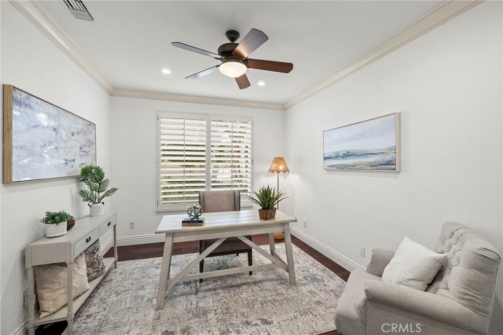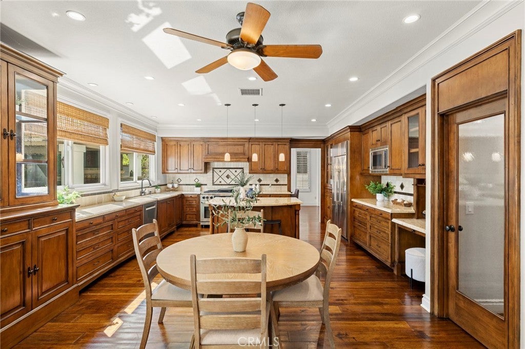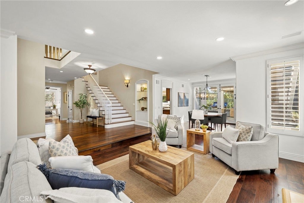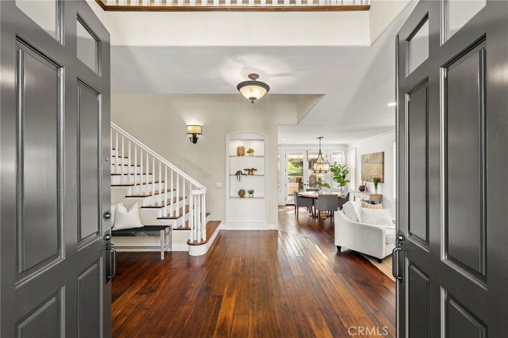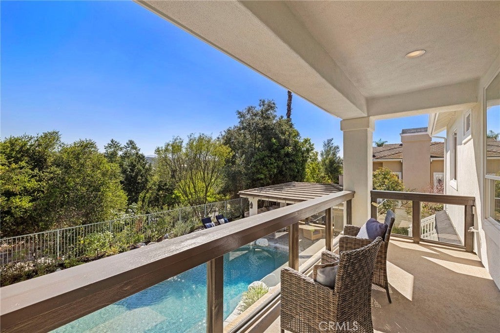 10 Brentano is a beautifully reimagined pool home nestled within the tranquil enclave of Canyon Estates in the prestigious guard-gated community of Coto de Caza. Inside, rich walnut hardwood floors span both levels, complemented by high-end custom built-ins and detailed woodwork throughout that enhance both style and functionality. The flexible 5-bedroom, 4.5-bathroom floor plan offers exceptional versatility, including a main-level bedroom with a private en-suite bath, walk-in shower, and direct access to the backyard—ideal for guests, multi-generational living, or a private home office. Designed for both everyday living and entertaining, the gourmet kitchen showcases a full suite of Dacor stainless steel appliances, a generous center island, and an effortless flow into the inviting family room. Expansive windows frame views of the resort-style backyard, creating a seamless indoor-outdoor connection. Upstairs, the home offers a well-designed layout featuring the expansive primary suite, three additional bedrooms with two bathrooms, and a large bonus room providing exceptional flexibility for a media room, playroom, or additional living space. The primary suite serves as a private retreat, complete with a custom entertainment wall, spa-inspired bath with marble flooring, deep soaking tub, walk-in closet, and a luxurious steam shower. A private balcony captures serene views of the surrounding hills and valleys—perfect for morning coffee or sunset relaxation. The backyard is designed for quintessential Southern California living, featuring a PebbleTec pool and spa with cascading water features, two covered and heated outdoor living areas, a fully equipped outdoor kitchen, outdoor fireplace, multiple TVs and a handcrafted pizza oven—creating a true private resort setting. An owned solar system provides additional efficiency and value to this amazing home. Ideally located just minutes from the award-winning Coto de Caza Golf & Racquet Club, top-rated schools, Irvine Spectrum, and world-class beaches, 10 Brentano offers an exceptional lifestyle in one of Orange County’s most sought-after communities. More than just a home, it is a private retreat and a true destination.
