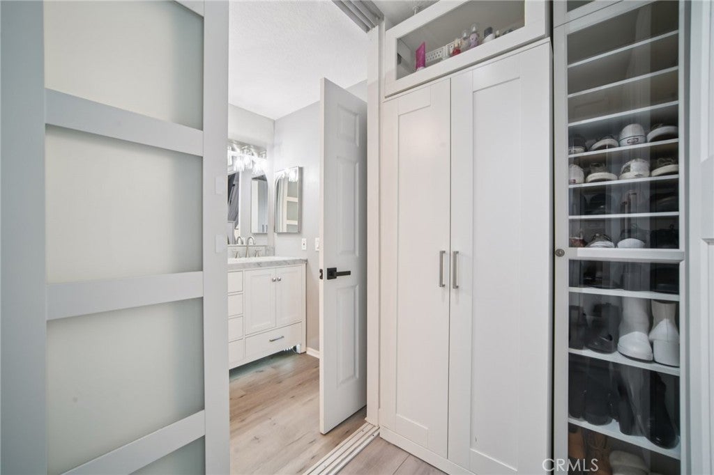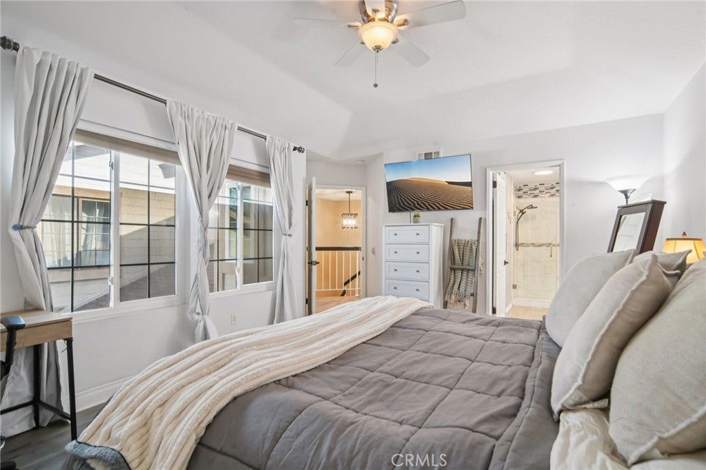 Located in the desirable Serrano Highlands neighborhood of Lake Forest, this beautifully upgraded home offers a welcoming blend of style, comfort, and thoughtful improvements throughout. Most of the interior has been freshly painted in neutral designer tones (excluding secondary bedrooms), complemented by premium laminate flooring on both levels, including all bedrooms. Upgraded wood stairs with stained treads and risers, wide baseboards, and enhanced door casings add to the home’s refined appeal. Dual-pane energy-efficient windows and a sliding glass door provide comfort and efficiency, while recessed LED lighting and new, updated ceiling fans in the downstairs living areas enhance the bright and modern feel. The entry welcomes you with a stylish accent wall featuring custom wainscoting. The fully remodeled kitchen is a standout, featuring premium wood cabinetry with soft-close drawers, granite countertops, a ceramic-coated farmhouse sink, and a Fapully commercial-style single-handle pull-down sprayer faucet with LED light. Stainless steel appliances include a double oven range, metal hood, and Bosch quiet dishwasher, with recessed lighting and updated electrical completing this functional and inviting space—ideal for everyday living and entertaining. Plumbing and mechanical upgrades include a whole-home PEX re-pipe and a new high-efficiency water heater, offering peace of mind for years to come. All bathrooms have been tastefully updated, highlighted by the remodeled primary bathroom with a double-sink vanity topped with Carrara marble, Kohler faucets, and a custom tiled shower with built-in seat and niche, frameless glass enclosure, upgraded lighting, fan, and flooring. The powder room and hall bathroom have also been refreshed with new vanities, fixtures, flooring, and finishes. The primary suite features premium flooring, a multi-setting ceiling fan/light, and a custom walk-in closet system with built-in cabinetry and drawers. Additional storage is available in the attic above the garage, complete with a convenient pull-down stair access. Outside, the front patio has been transformed into a low-maintenance space with woodchips and drought-tolerant landscaping. Serrano Highlands is a family-friendly community with HOA-hosted events throughout the year, making this move-in ready home an exceptional opportunity in a sought-after Lake Forest neighborhood.
