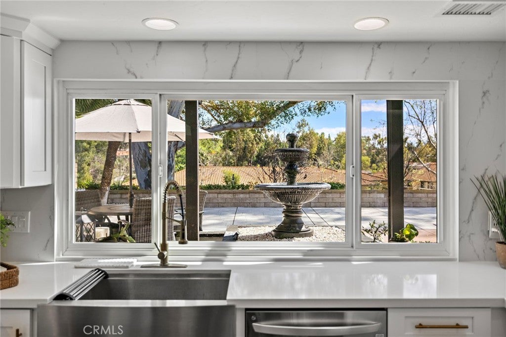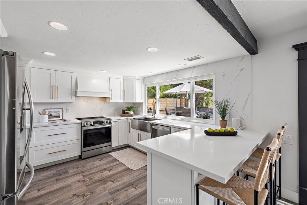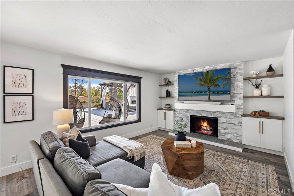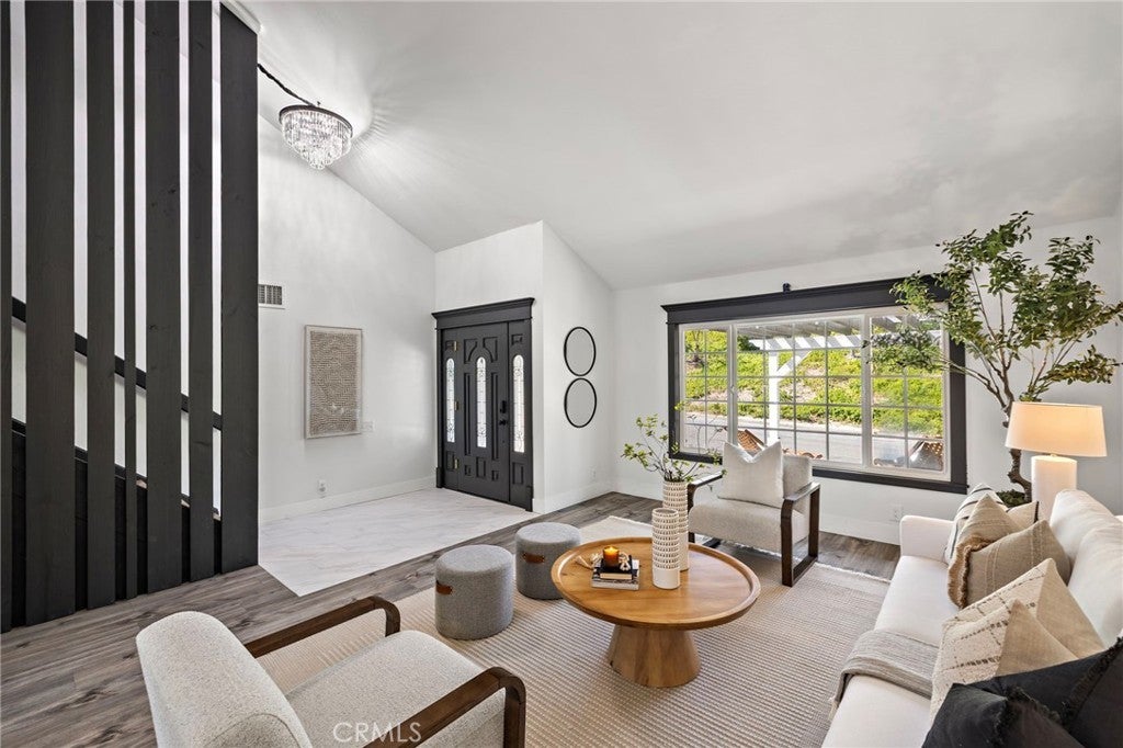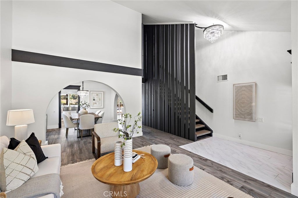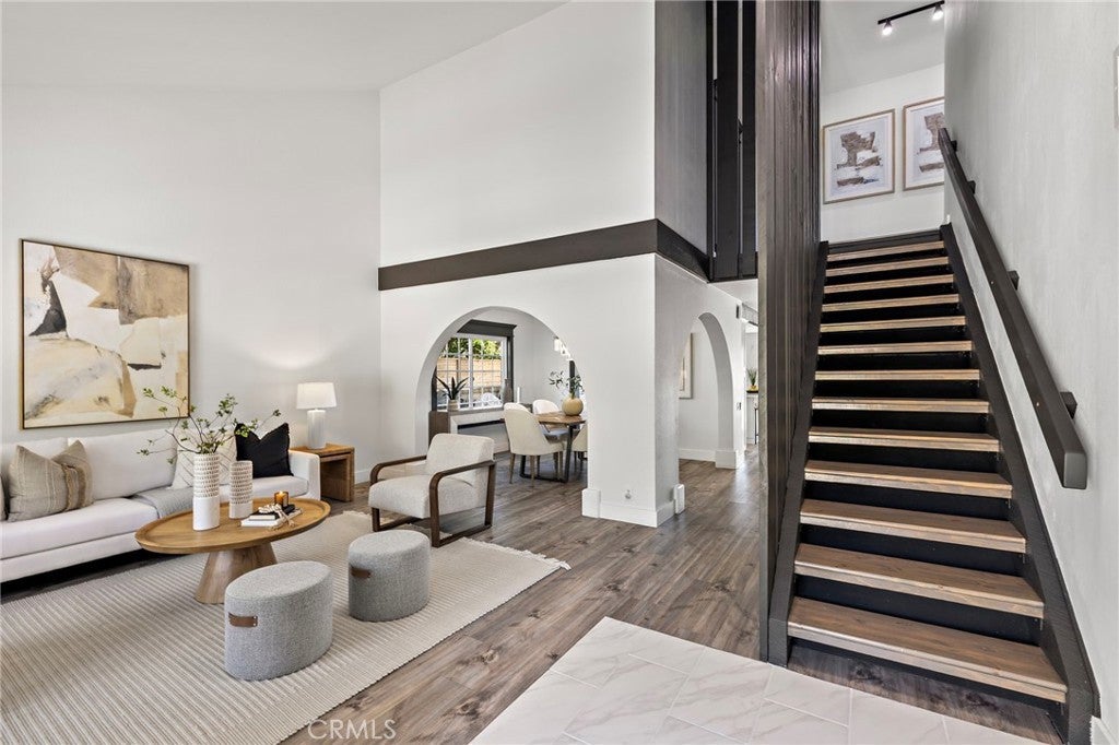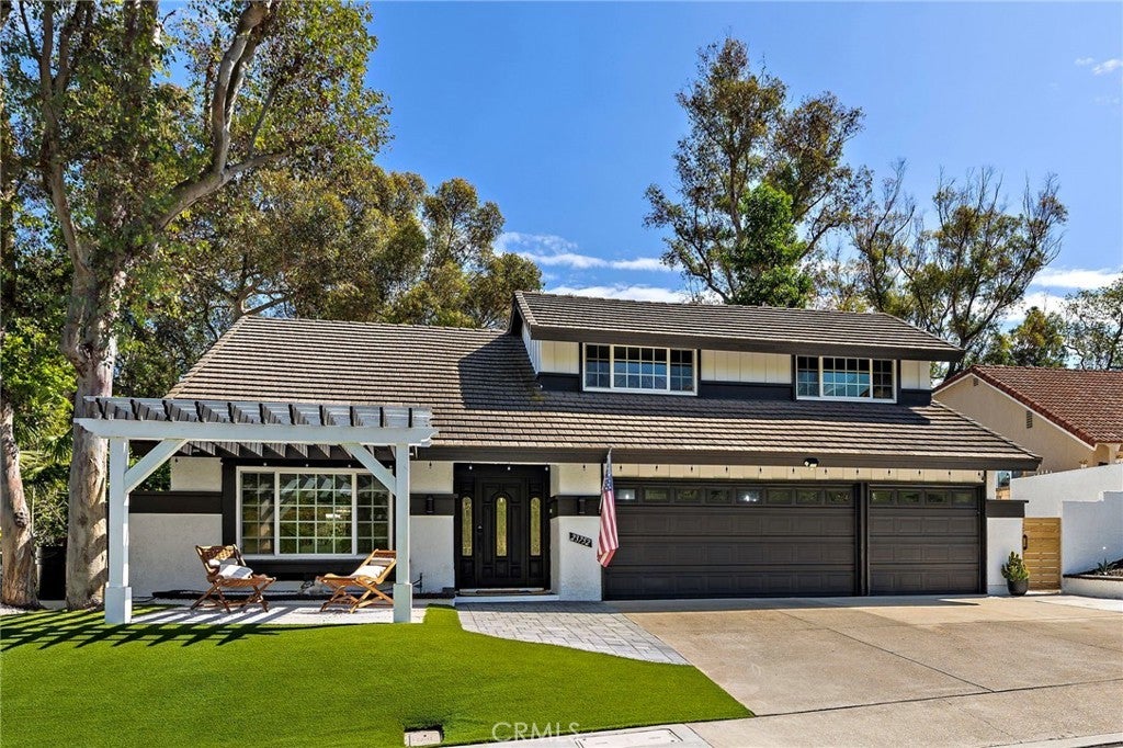 From the moment you arrive, this exceptional four bedroom, three bath residence captivates with a presence that simply feels like the one! The dramatic entry showcases a striking architectural staircase accented by custom wood slats with concealed storage, updated flooring and a statement chandelier that draws the eye upward. The open-concept living and dining areas, designed to maximize natural light, flow effortlessly from the foyer and are highlighted by a beautifully refreshed fireplace with custom built-in cabinetry and shelving, complemented by updated flooring—ideal for both everyday living and refined entertaining. The kitchen has been completely reimagined with new custom cabinetry, quartz countertops, stainless steel appliances, designer backsplash, upgraded fixtures, and new flooring, offering the perfect balance of style and functionality. A custom wine storage area with wine refrigerator and glass display nook adds a sophisticated touch, perfect for hosting. All bathrooms have been beautifully updated with new vanities, faucets, mirrors, flooring and lighting, along with thoughtful finishes throughout, including custom paneling in the first-floor bath. A well-planned laundry area with custom cabinetry maximizes everyday convenience and smart storage. Each bedroom has been freshly painted and enhanced with custom wood detailing. An oversized secondary bedroom features refined chair rail paneling, while the primary suite offers a serene retreat, highlighted by a beautifully appointed fireplace. The en-suite bath has been fully renovated for elevated comfort and everyday luxury. Outdoor living has been thoughtfully curated to create a private oasis. The backyard boasts hardscape enhancements and a new gazebo, ideal for entertaining or unwinding, while the front-yard pergola offers a serene spot to enjoy the California sunshine, in the privacy of a single loaded street. Residents also enjoy exclusive access to Mission Viejo’s private lake, a rare and coveted lifestyle amenity, featuring summer concerts on the beach, boating, fishing, swimming and a full calendar of lakeside events. Every detail of this home reflects the owners’ background in high-end custom construction, blending timeless craftsmanship with modern finishes throughout.