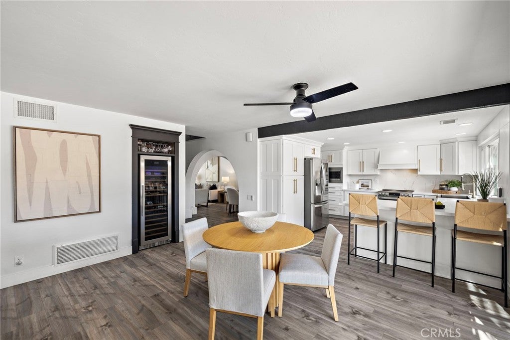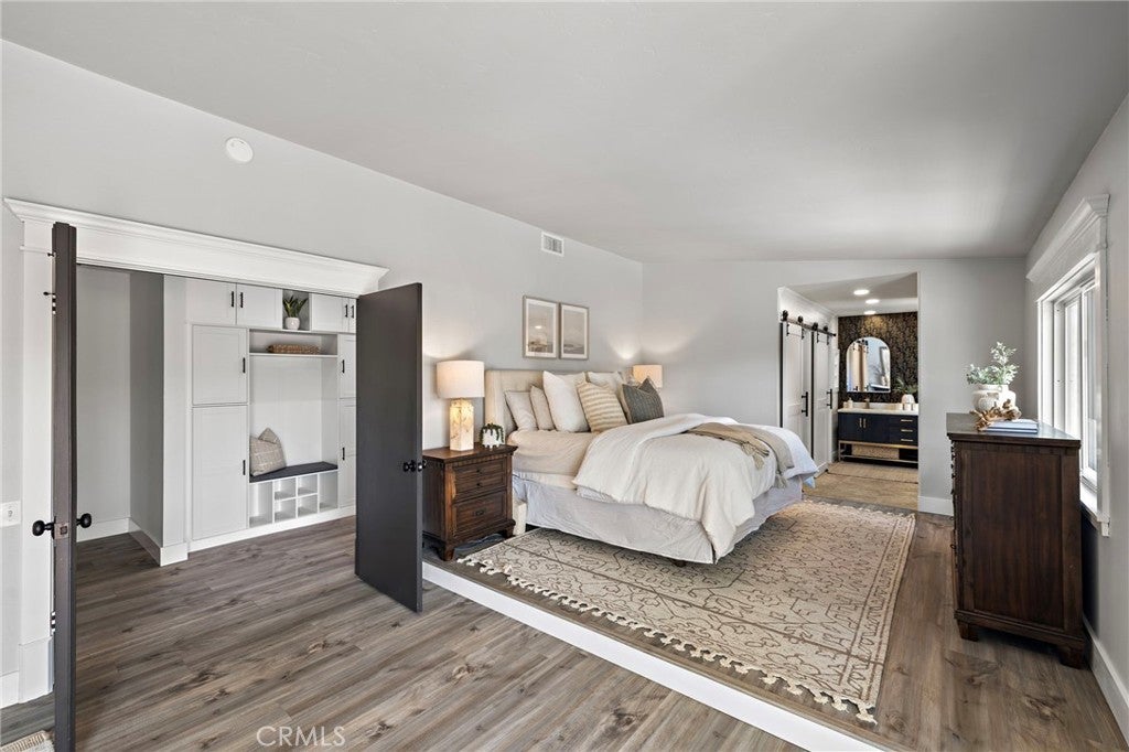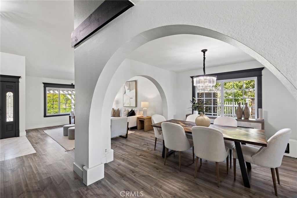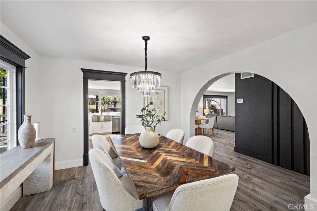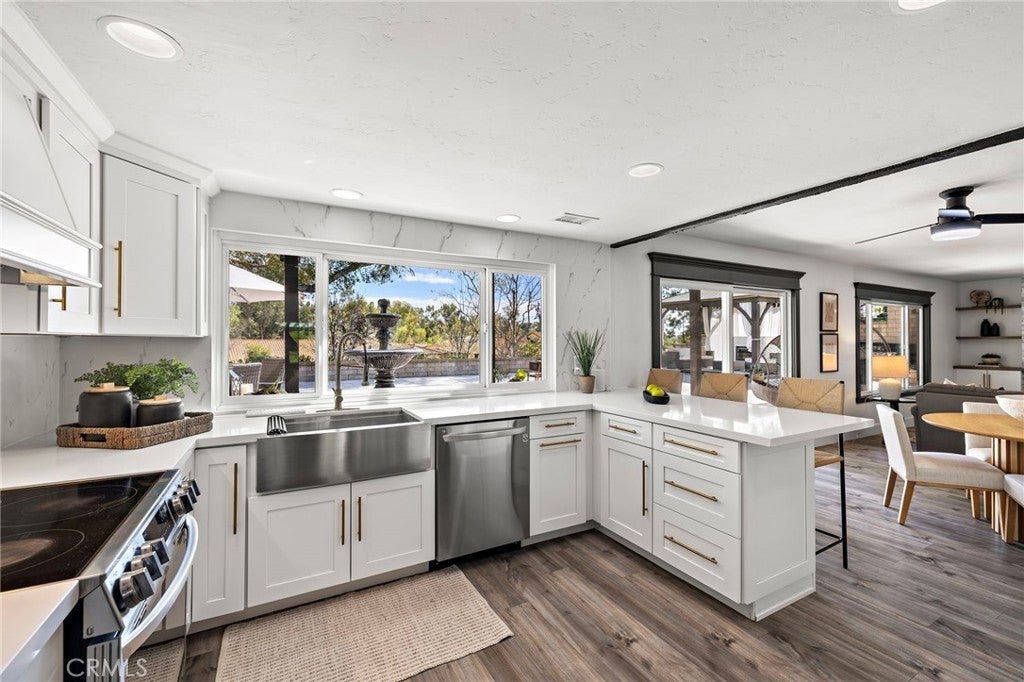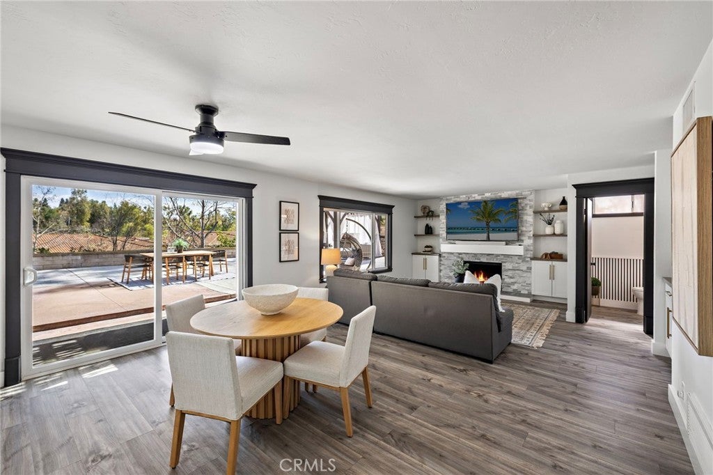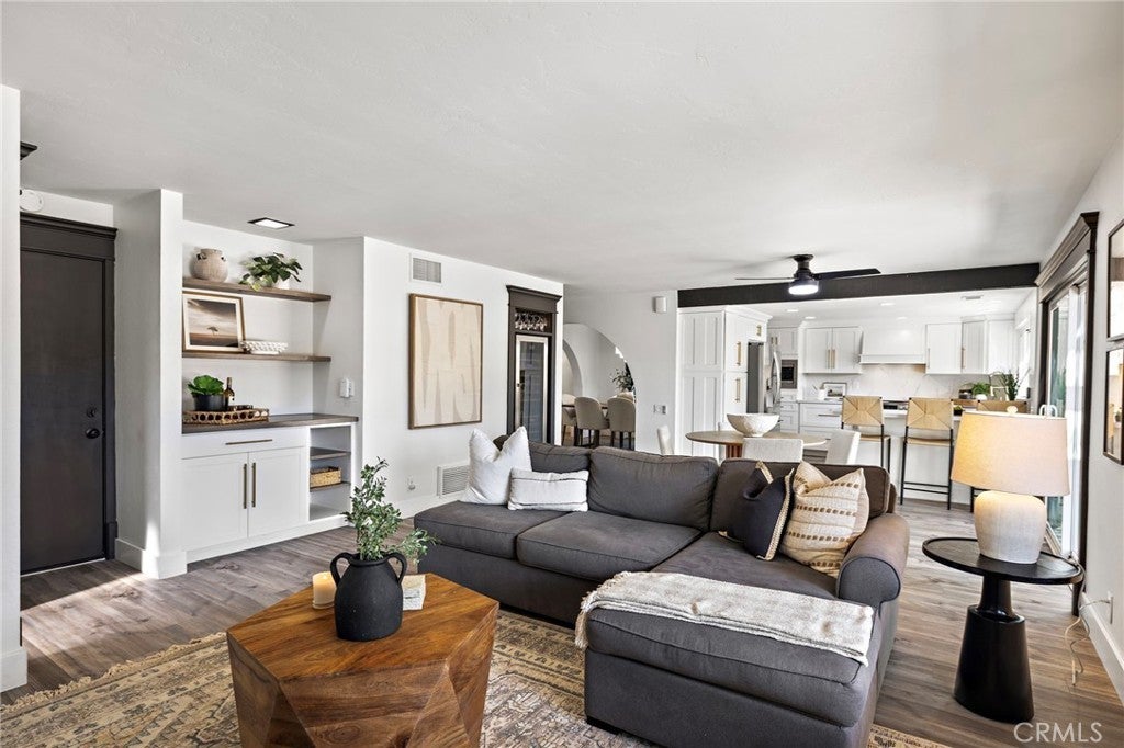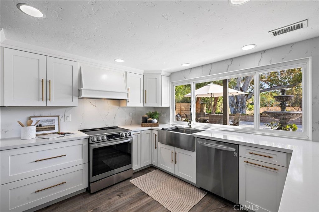 From the moment you arrive, this exceptional four bedroom, three bath residence captivates with a presence that simply feels like the one! The dramatic entry showcases a striking architectural staircase accented by custom wood slats with concealed storage, updated flooring and a statement chandelier that draws the eye upward. The open-concept living and dining areas, designed to maximize natural light, flow effortlessly from the foyer and are highlighted by a beautifully refreshed fireplace with custom built-in cabinetry and shelving, complemented by updated flooring—ideal for both everyday living and refined entertaining. The kitchen has been completely reimagined with new custom cabinetry, quartz countertops, stainless steel appliances, designer backsplash, upgraded fixtures, and new flooring, offering the perfect balance of style and functionality. A custom wine storage area with wine refrigerator and glass display nook adds a sophisticated touch, perfect for hosting. All bathrooms have been beautifully updated with new vanities, faucets, mirrors, flooring and lighting, along with thoughtful finishes throughout, including custom paneling in the first-floor bath. A well-planned laundry area with custom cabinetry maximizes everyday convenience and smart storage. Each bedroom has been freshly painted and enhanced with custom wood detailing. An oversized secondary bedroom features refined chair rail paneling, while the primary suite offers a serene retreat, highlighted by a beautifully appointed fireplace. The en-suite bath has been fully renovated for elevated comfort and everyday luxury. Outdoor living has been thoughtfully curated to create a private oasis. The backyard boasts hardscape enhancements and a new gazebo, ideal for entertaining or unwinding, while the front-yard pergola offers a serene spot to enjoy the California sunshine, in the privacy of a single loaded street. Residents also enjoy exclusive access to Mission Viejo’s private lake, a rare and coveted lifestyle amenity, featuring summer concerts on the beach, boating, fishing, swimming and a full calendar of lakeside events. Every detail of this home reflects the owners’ background in high-end custom construction, blending timeless craftsmanship with modern finishes throughout.