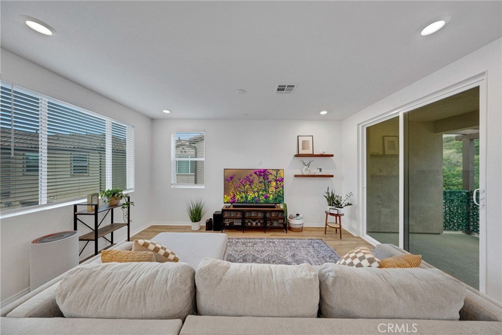 Welcome to The Retreat in Fontana, featuring a well-appointed 1,183 sq ft home with modern upgrades and a functional layout. Upgraded flooring runs throughout the open living and dining areas, which flow seamlessly into the kitchen—ideal for everyday living and entertaining. Large dual-pane windows and recessed lighting create a bright, inviting atmosphere. Both bedrooms are thoughtfully positioned for added privacy. The spacious primary suite includes a walk-in closet and an en-suite bathroom with dual sinks and a walk-in shower. A secondary bedroom and full bathroom provide flexibility for guests or a home office. Additional highlights include in-unit laundry and a private covered balcony, perfect for relaxing outdoors. Located within the gated Retreat community and the highly desired Etiwanda School District, residents enjoy resort-style amenities including a pool, club house, playground, and beautifully maintained grounds. Energy-efficient features such as solar panels and a tankless water heater help reduce utility costs. Conveniently close to shopping, dining, parks, and major freeways, this move-in-ready home offers both comfort and convenience.
