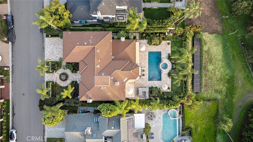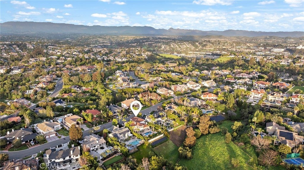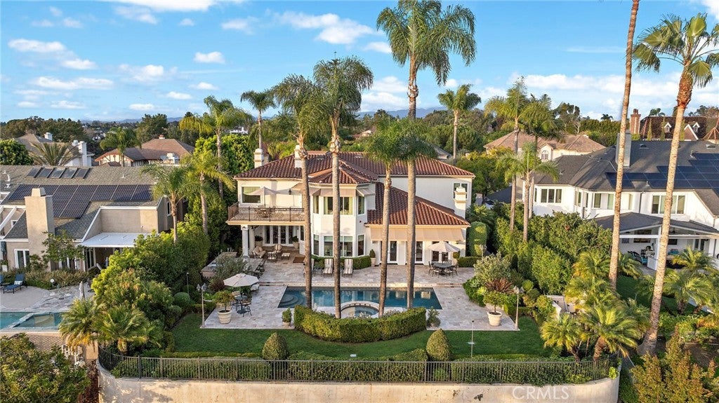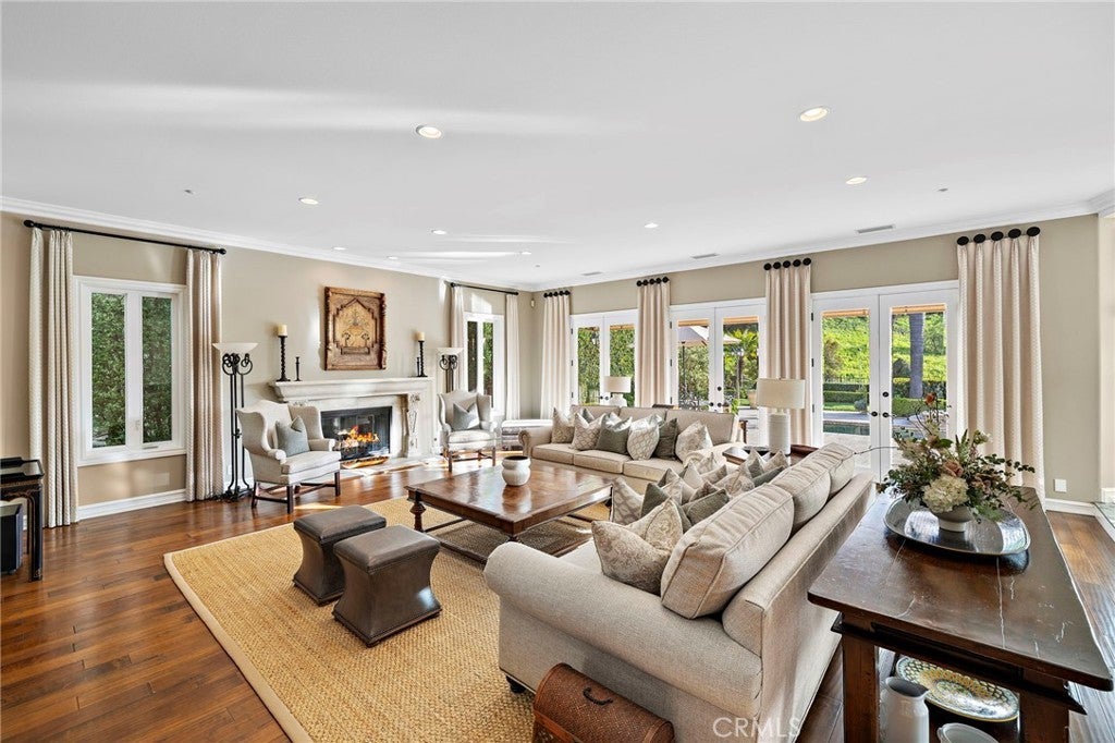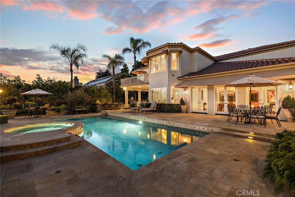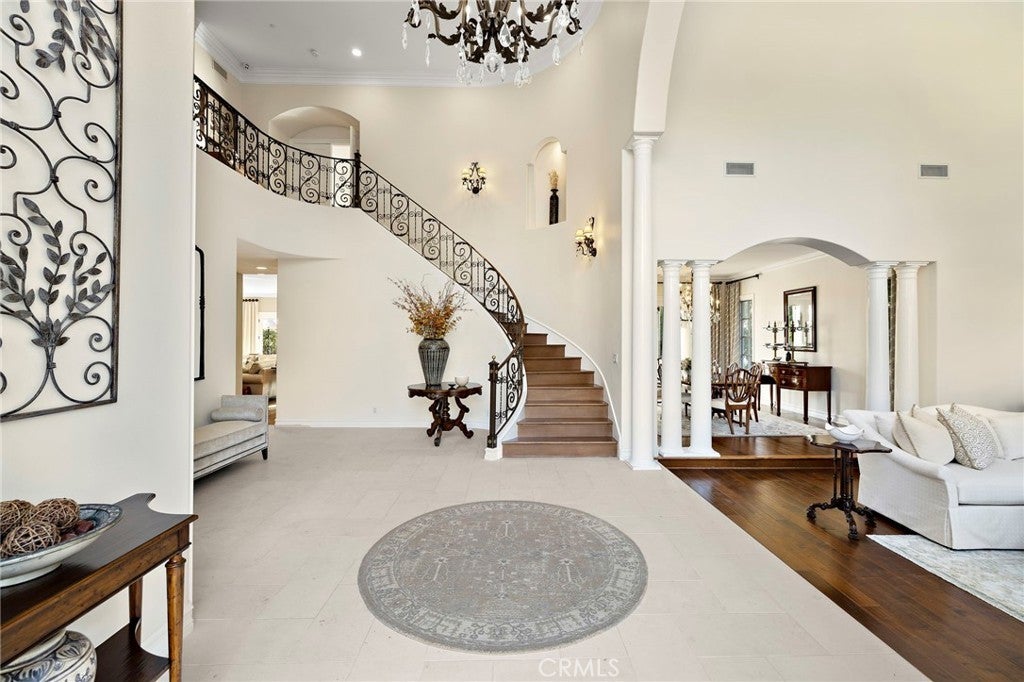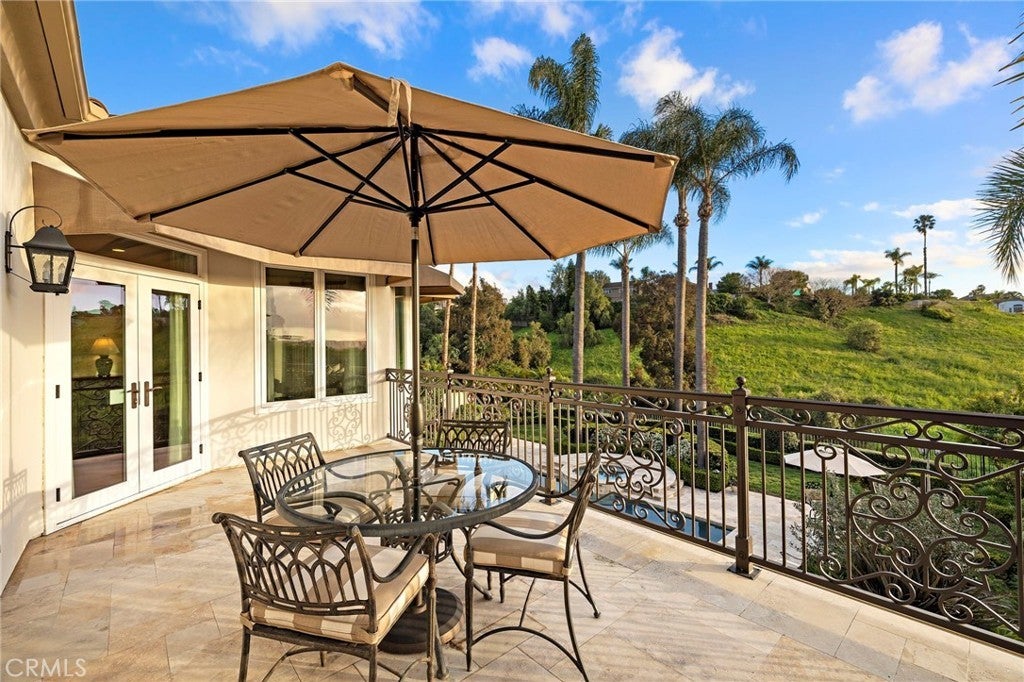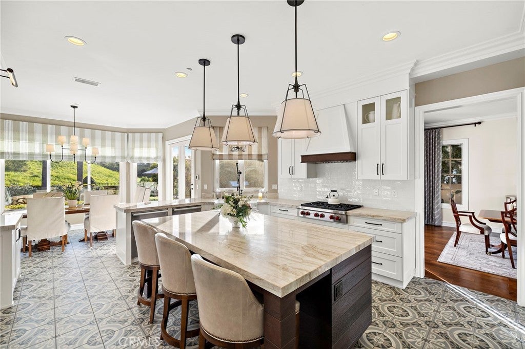Positioned on one of the most coveted cul-de-sac streets in Nellie Gail Community, this stately estate is defined by scale, symmetry, and a refined European-influenced presence. Set on an approximately 20,000 sq ft lot, the property captures sweeping views of rolling hills and open space while offering exceptional privacy. A freshly painted exterior introduces a formal arrival with stone-tiled walkways, manicured hedges, rose gardens, a central entry fountain, and Italian cypress framing the double-door entry. Soaring ceilings and wood flooring throughout create an immediate sense of volume and continuity. The main level includes an executive library with coffered ceiling, a privately located bedroom suite with en-suite bath, and a formal dining room designed for large-scale entertaining. The fully remodeled kitchen is a true showpiece, featuring crisp white cabinetry, pull-out storage, pantry, appliance garage, natural quartzite countertops, a center island with seating, and premium Sub-Zero, Wolf, and Miele appliances. Adjacent is a charming breakfast nook overlooking the rear garden, pool, and open views. The kitchen opens to an expansive family room with fireplace, built-in entertainment center, wine closet with three wine refrigerators, and three sets of French doors leading outdoors. Upstairs, the primary suite offers a spacious retreat and fireplace, view deck, spa-style bath with dual vanities, soaking tub, walk-in shower, and a custom walk-in closet with exceptional storage. Three additional en-suite bedrooms and a bonus room complete the upper level. Dual staircases enhance everyday functionality. Outdoor living includes stone hardscape, outdoor kitchen, IR heaters, Rogers Gardens–designed landscaping, and a saltwater Pebble-Tec pool and spa—all oriented to capture open hillside views. Additional highlights include; 39 ground-mounted OWNED solar panels producing approx. 11.5 kW (2016), upgraded windows, interior and exterior security cameras, new roof (2020), full PEX re-pipe (2021), pool filter control equipment (2024), pool heater (2019), and a 3-car garage with epoxy floors, EV Tesla 240V/40-amp wall charger, and ceiling height suitable for a car lift. Community Highlights: Nellie Gail offers equestrian trails and an equestrian center, a private clubhouse with restaurant, tennis and swim centers, and eight pickleball courts—one of South Orange County’s most established and desirable communities.