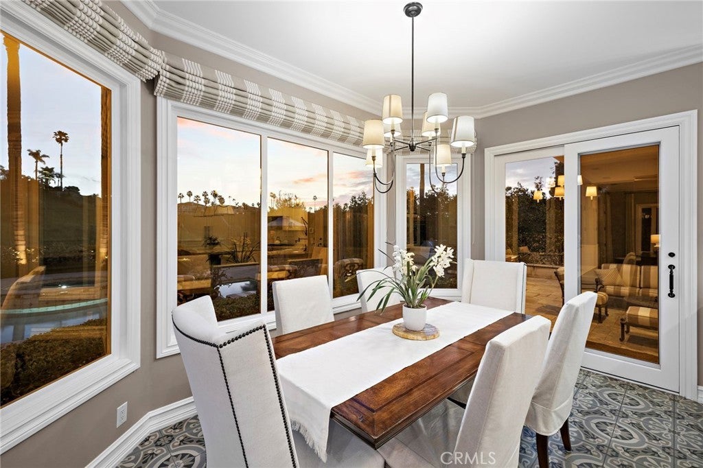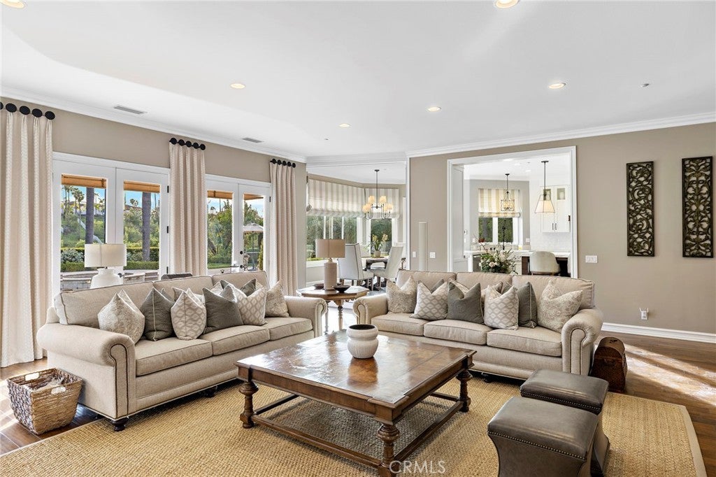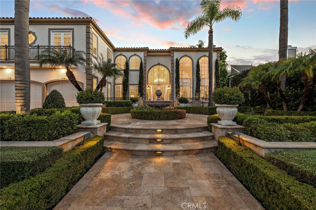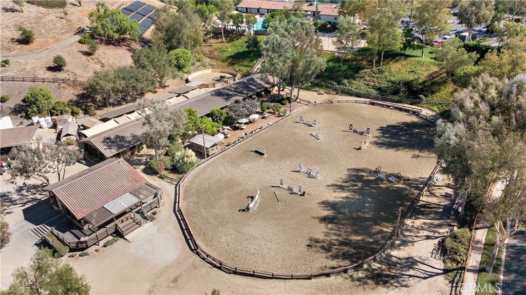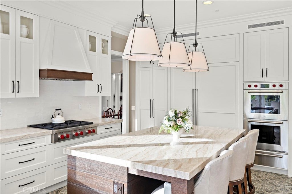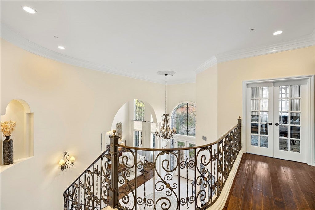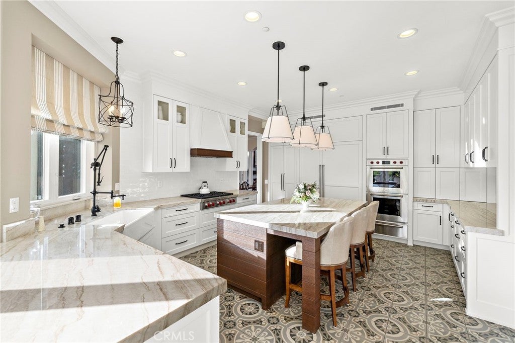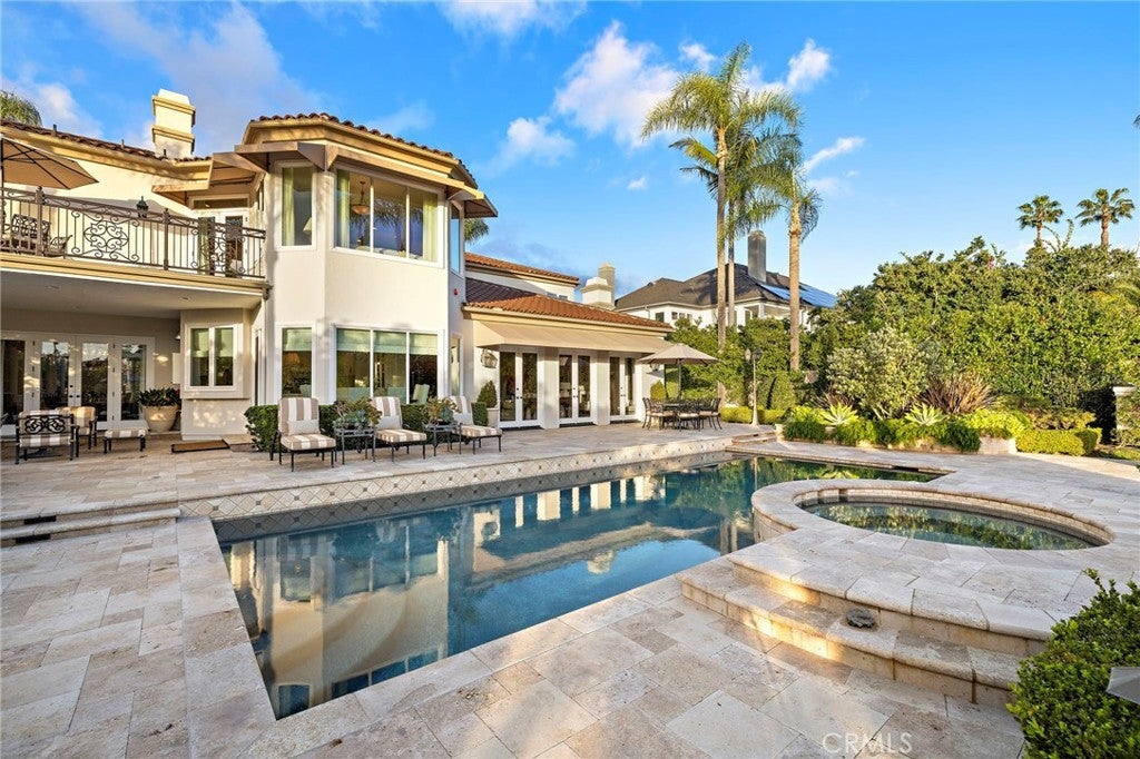 Positioned on one of the most coveted cul-de-sac streets in Nellie Gail Community, this stately estate is defined by scale, symmetry, and a refined European-influenced presence. Set on an approximately 20,000 sq ft lot, the property captures sweeping views of rolling hills and open space while offering exceptional privacy. A freshly painted exterior introduces a formal arrival with stone-tiled walkways, manicured hedges, rose gardens, a central entry fountain, and Italian cypress framing the double-door entry. Soaring ceilings and wood flooring throughout create an immediate sense of volume and continuity. The main level includes an executive library with coffered ceiling, a privately located bedroom suite with en-suite bath, and a formal dining room designed for large-scale entertaining. The fully remodeled kitchen is a true showpiece, featuring crisp white cabinetry, pull-out storage, pantry, appliance garage, natural quartzite countertops, a center island with seating, and premium Sub-Zero, Wolf, and Miele appliances. Adjacent is a charming breakfast nook overlooking the rear garden, pool, and open views. The kitchen opens to an expansive family room with fireplace, built-in entertainment center, wine closet with three wine refrigerators, and three sets of French doors leading outdoors. Upstairs, the primary suite offers a spacious retreat and fireplace, view deck, spa-style bath with dual vanities, soaking tub, walk-in shower, and a custom walk-in closet with exceptional storage. Three additional en-suite bedrooms and a bonus room complete the upper level. Dual staircases enhance everyday functionality. Outdoor living includes stone hardscape, outdoor kitchen, IR heaters, Rogers Gardens–designed landscaping, and a saltwater Pebble-Tec pool and spa—all oriented to capture open hillside views. Additional highlights include; 39 ground-mounted OWNED solar panels producing approx. 11.5 kW (2016), upgraded windows, interior and exterior security cameras, new roof (2020), full PEX re-pipe (2021), pool filter control equipment (2024), pool heater (2019), and a 3-car garage with epoxy floors, EV Tesla 240V/40-amp wall charger, and ceiling height suitable for a car lift. Community Highlights: Nellie Gail offers equestrian trails and an equestrian center, a private clubhouse with restaurant, tennis and swim centers, and eight pickleball courts—one of South Orange County’s most established and desirable communities.