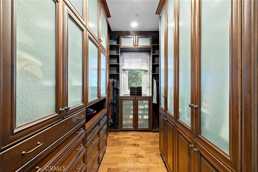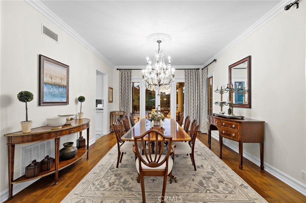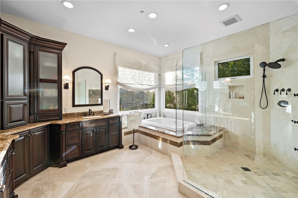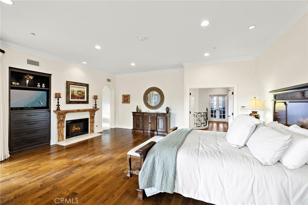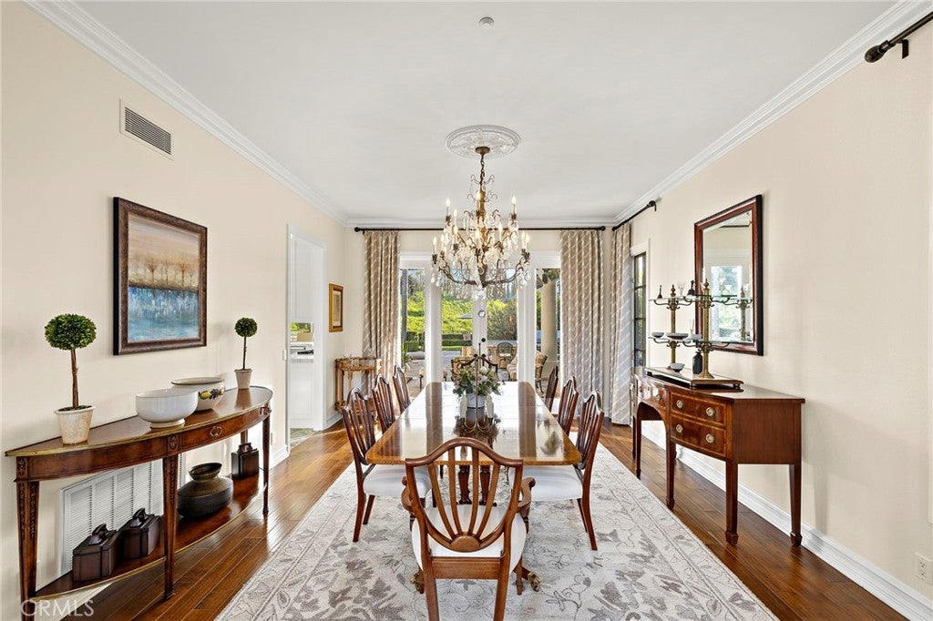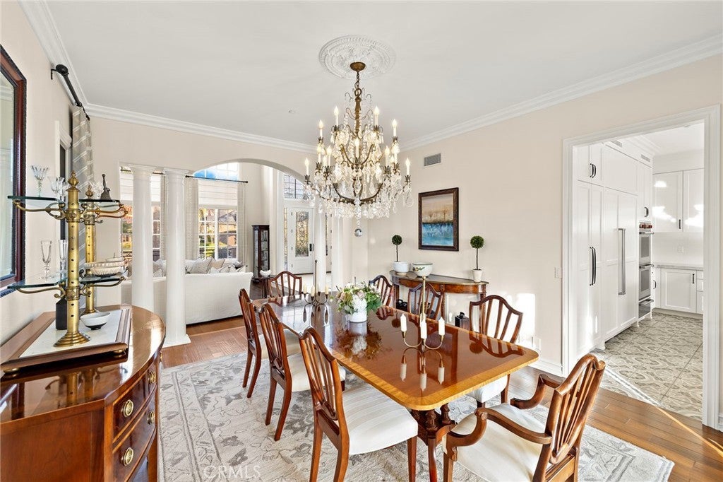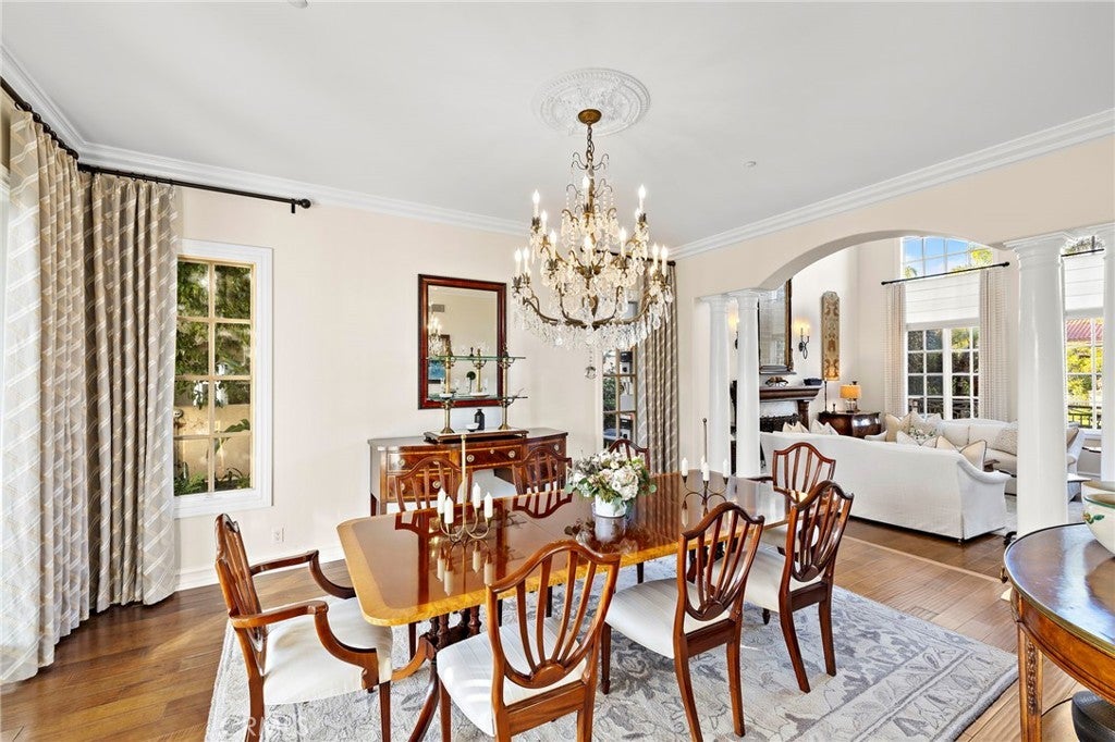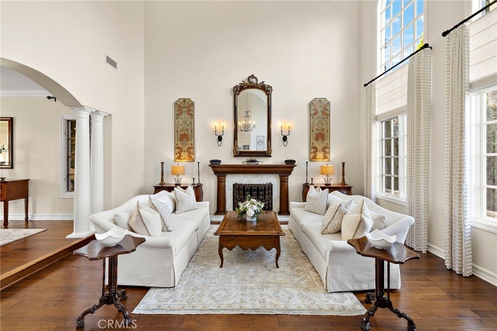 Positioned on one of the most coveted cul-de-sac streets in Nellie Gail Community, this stately estate is defined by scale, symmetry, and a refined European-influenced presence. Set on an approximately 20,000 sq ft lot, the property captures sweeping views of rolling hills and open space while offering exceptional privacy. A freshly painted exterior introduces a formal arrival with stone-tiled walkways, manicured hedges, rose gardens, a central entry fountain, and Italian cypress framing the double-door entry. Soaring ceilings and wood flooring throughout create an immediate sense of volume and continuity. The main level includes an executive library with coffered ceiling, a privately located bedroom suite with en-suite bath, and a formal dining room designed for large-scale entertaining. The fully remodeled kitchen is a true showpiece, featuring crisp white cabinetry, pull-out storage, pantry, appliance garage, natural quartzite countertops, a center island with seating, and premium Sub-Zero, Wolf, and Miele appliances. Adjacent is a charming breakfast nook overlooking the rear garden, pool, and open views. The kitchen opens to an expansive family room with fireplace, built-in entertainment center, wine closet with three wine refrigerators, and three sets of French doors leading outdoors. Upstairs, the primary suite offers a spacious retreat and fireplace, view deck, spa-style bath with dual vanities, soaking tub, walk-in shower, and a custom walk-in closet with exceptional storage. Three additional en-suite bedrooms and a bonus room complete the upper level. Dual staircases enhance everyday functionality. Outdoor living includes stone hardscape, outdoor kitchen, IR heaters, Rogers Gardens–designed landscaping, and a saltwater Pebble-Tec pool and spa—all oriented to capture open hillside views. Additional highlights include; 39 ground-mounted OWNED solar panels producing approx. 11.5 kW (2016), upgraded windows, interior and exterior security cameras, new roof (2020), full PEX re-pipe (2021), pool filter control equipment (2024), pool heater (2019), and a 3-car garage with epoxy floors, EV Tesla 240V/40-amp wall charger, and ceiling height suitable for a car lift. Community Highlights: Nellie Gail offers equestrian trails and an equestrian center, a private clubhouse with restaurant, tennis and swim centers, and eight pickleball courts—one of South Orange County’s most established and desirable communities.