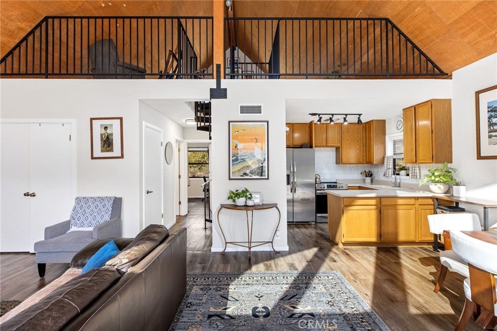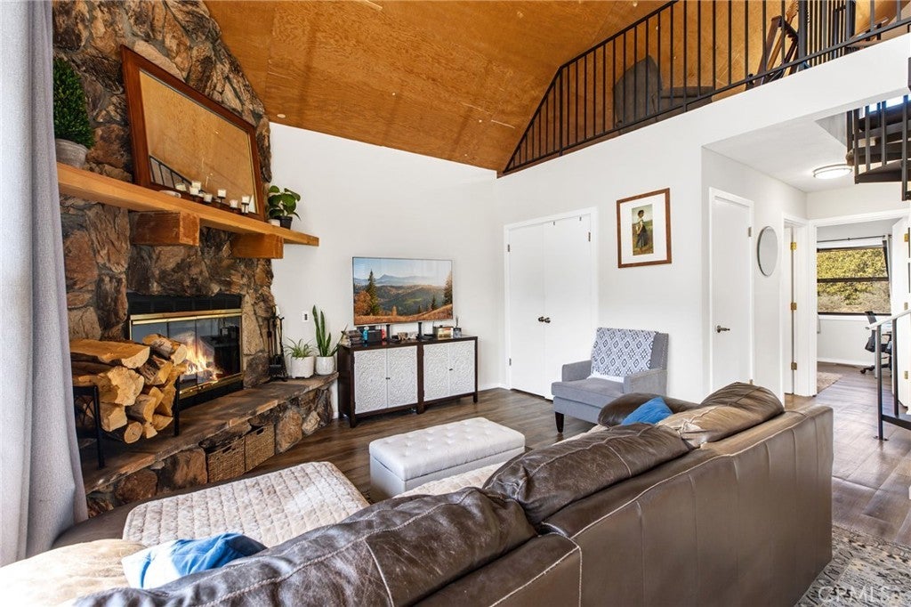 Perched in the scenic mountains of Mountain Center, this recently remodeled A-frame retreat blends character, comfort, and versatility. Set on .31 acres and fully fenced, the property captures sweeping views while offering privacy and functionality. Inside, the open living and kitchen area is warmed by a cozy wood-burning fireplace, complemented by vinyl flooring throughout, fresh interior paint, and a beautifully updated bathroom. The home features two bedrooms conveniently located downstairs, while a spiral staircase leads to a spacious 400 sq ft loft that could easily serve as a third bedroom, office, or flexible living space. This additional loft area adds valuable square footage and versatility, offering endless possibilities to fit your needs whether a guest suite, creative studio, or workout space. Recent upgrades include newer appliances such as a stove, refrigerator, and washer and dryer, along with a modern all-electric furnace and heating system. The home runs entirely on electric and features a well system with a new switch, strong water pressure, and an 80-gallon capacity. Additional highlights include tinted windows, Trex decking with a gutter system, and a newer roof installed in 2021. Outdoors, you’ll find a two-car garage and the added benefit of being located right next to the local fire station for extra peace of mind. Whether you’re searching for a full-time mountain residence or a serene second-home escape, this distinctive property offers a rare blend of style, upgrades, expanded living space, and mountain charm.