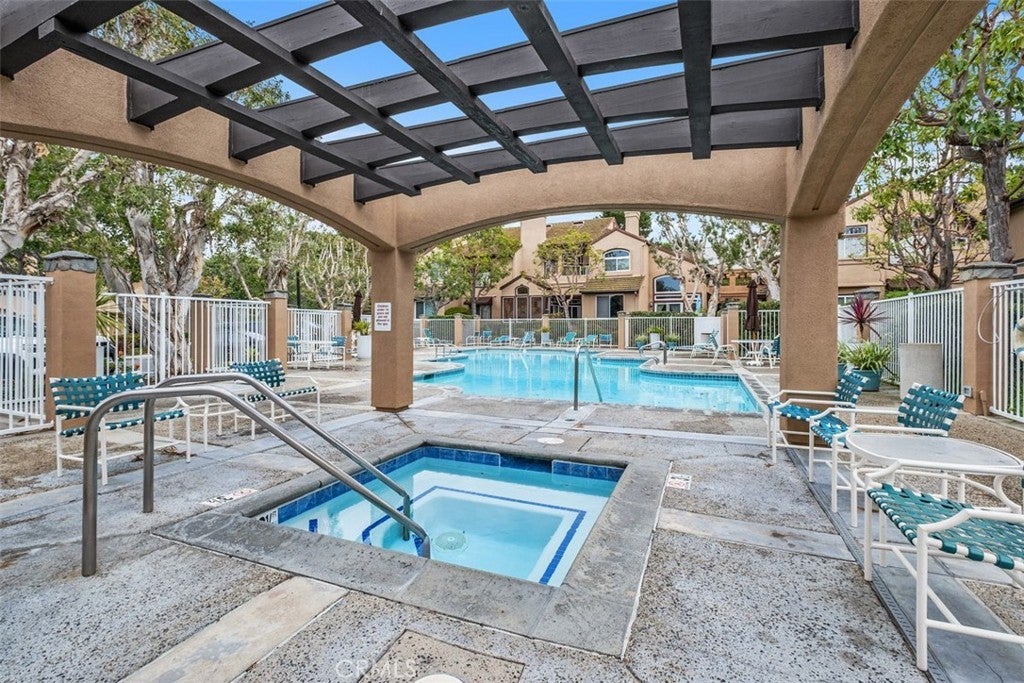 Prime Location! Recently completed top-to-bottom renovation! Fully furnished, turn-key, ground-floor, single-level located in a quiet, community walking distance to fine dining and two shopping centers, coastal close with a refreshing ocean breeze. Community pool and spa. This open-concept home features newly replaced hardwood floors, updated interior/exterior doors and beautiful custom windows, recessed lighting throughout, and a two-way gas fireplace with bi-fold glass doors. Modern kitchen includes quartz countertops, custom cabinetry, bar seating, and recently updated appliances: 6-burner range, dishwasher, disposal, microwave, refrigerator, and interior stacked washer/dryer. Spacious primary suite offers a professionally designed custom closet. Bathroom features dual sinks plus a separate privacy room with vanity and step-in shower. Additional highlights include updated heating and central air systems, remote-controlled bedroom ceiling fan, and top-down/bottom-up remote shades in dining area with additional shutters, shades, and draperies throughout. Covered patio with room for BBQ and outdoor dining—enjoy morning sun without harsh afternoon exposure. Attached garage with epoxy flooring and EV charger. Move-in ready and thoughtfully upgraded throughout!