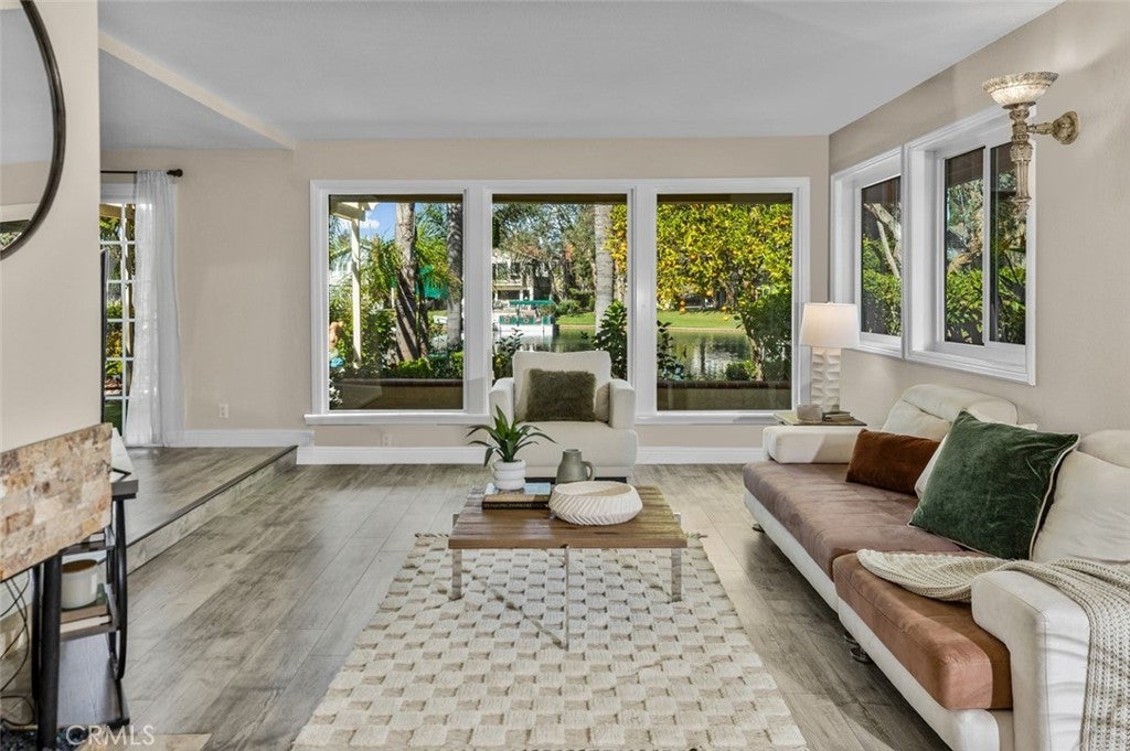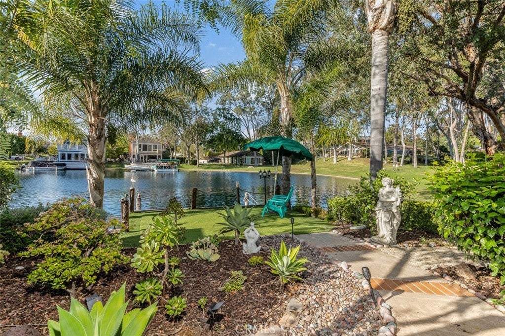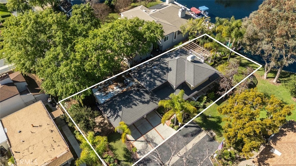 The Largest Waterfront Lot in Lake Forest, a Setting that Simply Cannot be Replicated. Positioned along the widest stretch of shoreline in Hidden Lakes, the residence sits beyond an expansive lawn and mature trees, creating a rare sense of depth between the home and the water. The scale of the parcel allows the lake to feel panoramic rather than immediate, private, quiet, and open in a way rarely experienced on waterfront properties. Inside, broad windows frame uninterrupted views across the water, drawing natural light deep into the home throughout the day. The layout lives comfortably toward the lake, allowing daily life to unfold around reflections, greenery, and sky. The interior has been thoughtfully updated while remaining warm and livable. Two bedrooms are located on the main level for flexibility and accessibility, while the kitchen has been refreshed to open naturally toward the living spaces and views beyond. Upstairs, the primary suite serves as a quiet retreat, featuring a spacious bedroom, private balcony overlooking the lake, and a refined en suite bath highlighted by a custom walk-in shower. Outdoors, the grounds read more like a private garden than a backyard, with a dock along the shoreline, shaded pergola seating, fire pit lounge, and multiple areas to gather or retreat. The distance across the water preserves calm sightlines and reinforces the sense of space that defines the property. Practicality matches the setting with a full three car garage and separate RV parking, offering flexibility rarely available on lakefront homes and further emphasizing the scale of the lot. More than a waterfront residence, this is a true shoreline estate defined by land, proportion, and permanence in a way that can no longer be recreated within Lake Forest.