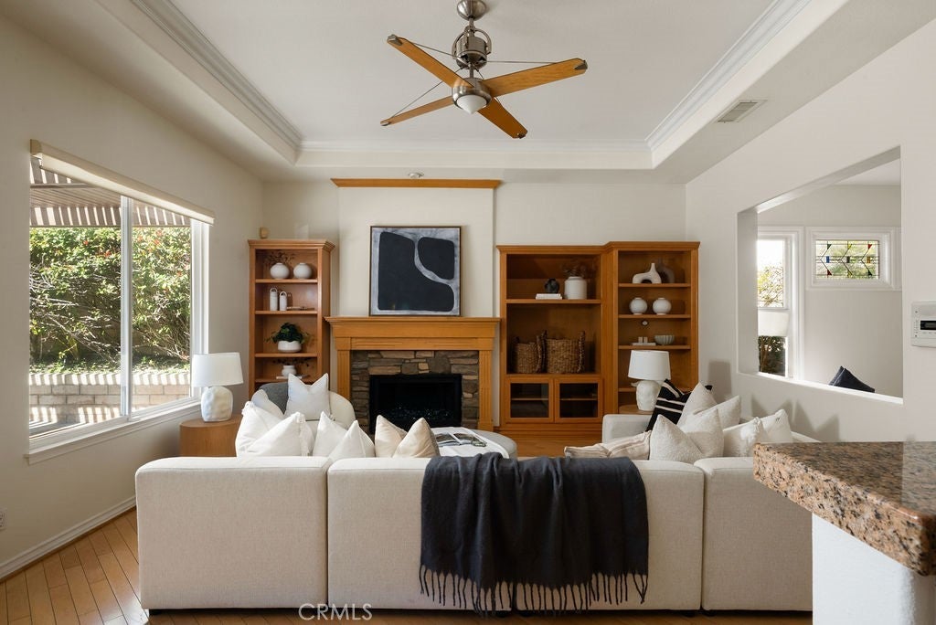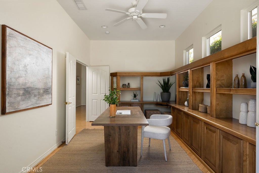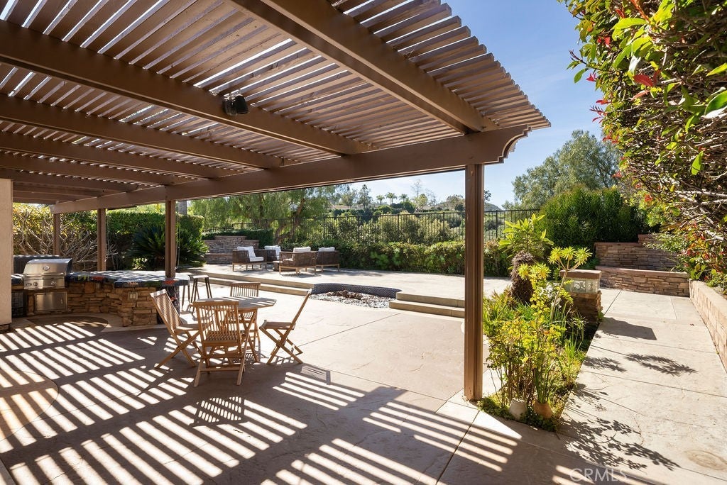 Welcome to a rare find in Hillcrest Estates. Tucked behind the gates in one of Laguna Niguel’s most established neighborhoods, this single-level home sits on a flat lot with sweeping westward hillside and canyon views. The setting feels elevated and private, yet connected to everything that defines coastal Orange County living. Inside, the layout is thoughtful and easy with high ceilings throughout creating a spacious setting. 3 bedrooms and 2.5 bathrooms are complemented by a full dedicated office with built-ins, ideal for working from home or carving out space that is entirely your own. Formal dining pairs with two comfortable seating areas, offering flexibility for both hosting and everyday living. The open kitchen with breakfast nook flows naturally to the backyard through Milgard dual-paned windows and glass door, creating an effortless indoor/outdoor rhythm. Natural light fills the main living spaces while maintaining a sense of warmth and comfort. Step outside to a covered patio complete with a built-in barbecue and bar top, designed for relaxed entertaining with accessibility features. The flat lot provides usable outdoor space, while the canyon backdrop adds depth and privacy. Fresh interior paint and new carpet in living areas give the home a fresh feel. A leased Tesla solar system supports energy efficiency, and the spacious 2-car attached garage includes built-in storage with a large accessible attic. This property has accessibility features throughout including doorways, bars, ramps and zero steps—all tastefully incorporated for the option of ease. Hillcrest Estates is known for its elevated privacy, trail access, and 24-hour guard gated security. Residents enjoy close proximity to Laguna Niguel Regional Park, the Salt Creek Trail, Whole Foods, and some of South Orange County’s most beautiful beaches just minutes away. This upscale single-level residence is best experienced in person and is a truly rare offering.