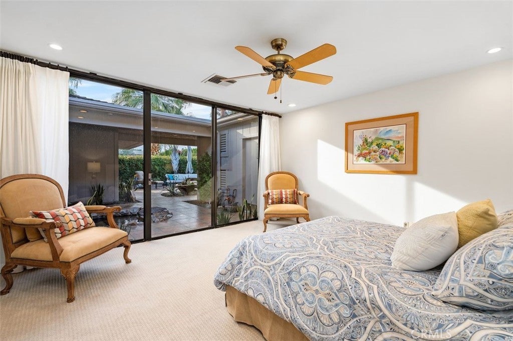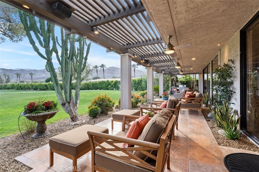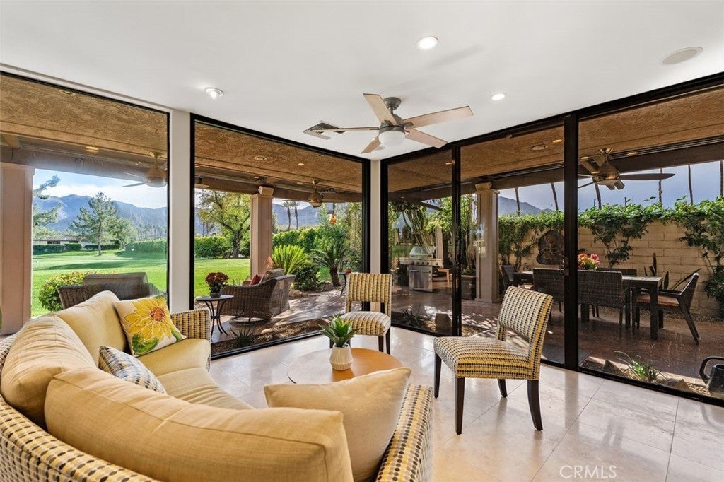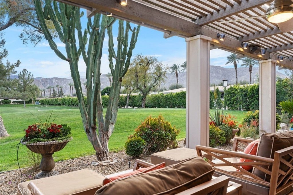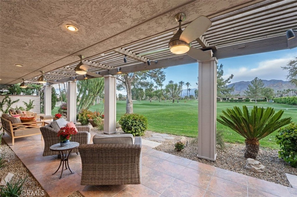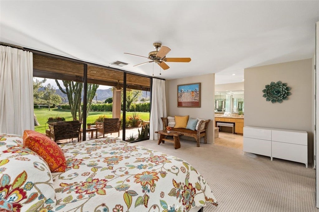 Welcome to your desert dream home in the heart of The Springs Country Club — where luxury, lifestyle, and location come together seamlessly. Perfectly positioned on the prestigious 3rd hole of the championship golf course, this beautifully maintained 3-bedroom, 3-bath residence offers nearly 2,700 square feet of thoughtfully designed living space. With its coveted south-facing orientation, the home captures breathtaking mountain views and abundant natural light throughout the day. A large, tranquil private front courtyard welcomes you with a serene Koi pond, creating an inviting outdoor retreat ideal for morning coffee or evening gatherings. Inside, neutral stone flooring flows through the main living areas, complemented by new contemporary low-pile carpeting in the bedrooms for a fresh, modern feel. Designed for effortless indoor-outdoor living, the spacious layout opens toward the golf course and mountain backdrop. The primary suite is a true sanctuary, featuring two generous walk-in closets and a well-appointed en-suite bath. The kitchen combines style and functionality with slab granite countertops, a gas range, and stainless steel appliances — perfect for both everyday living and entertaining. Additional highlights include a two-car garage plus a dedicated golf cart garage, both finished with durable epoxy flooring. Ideally located directly across from Eisenhower Medical Center and just minutes from shopping, dining, and entertainment at The River at Rancho Mirage and El Paseo, this home offers both privacy and convenience. Residents of The Springs Country Club enjoy a vibrant social scene, premier tennis and pickleball facilities, and a recently updated championship golf course — all within a secure, beautifully maintained community.