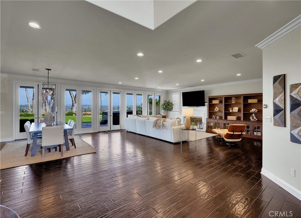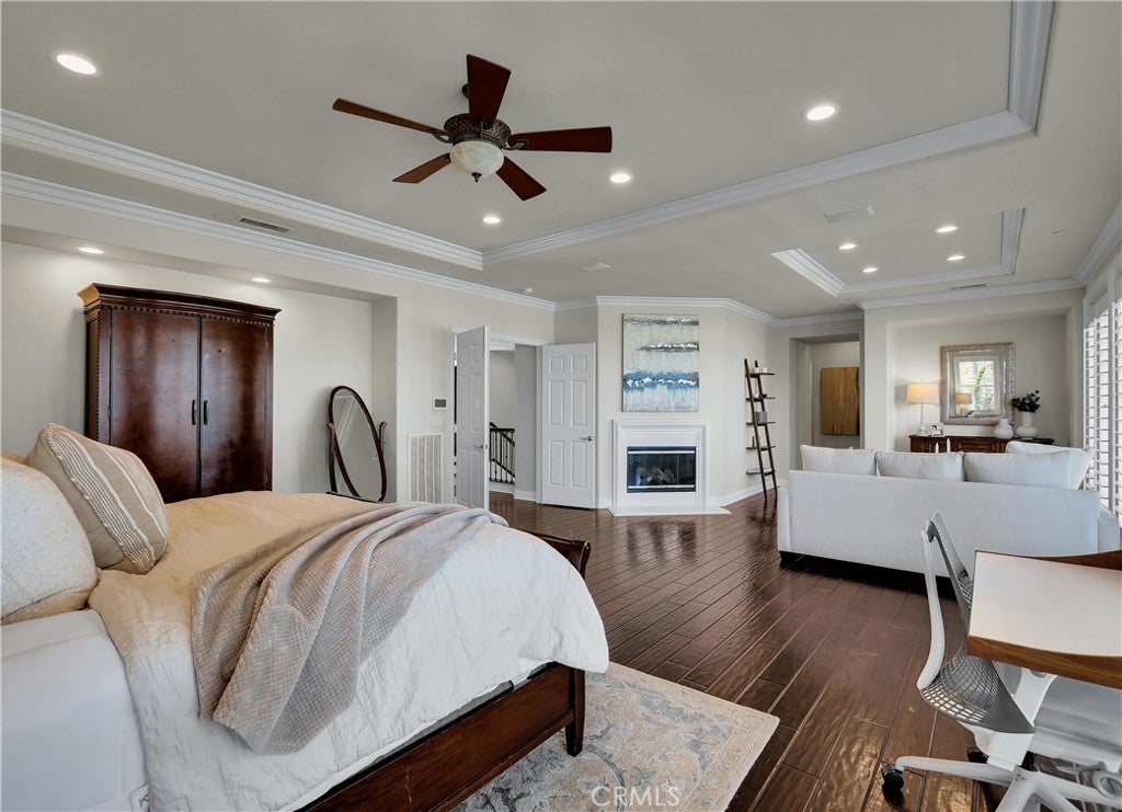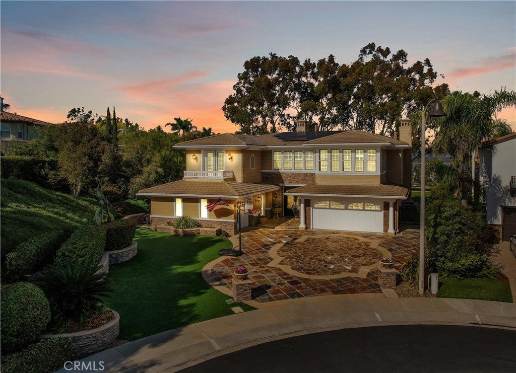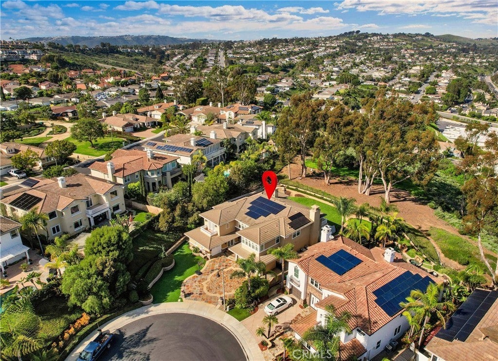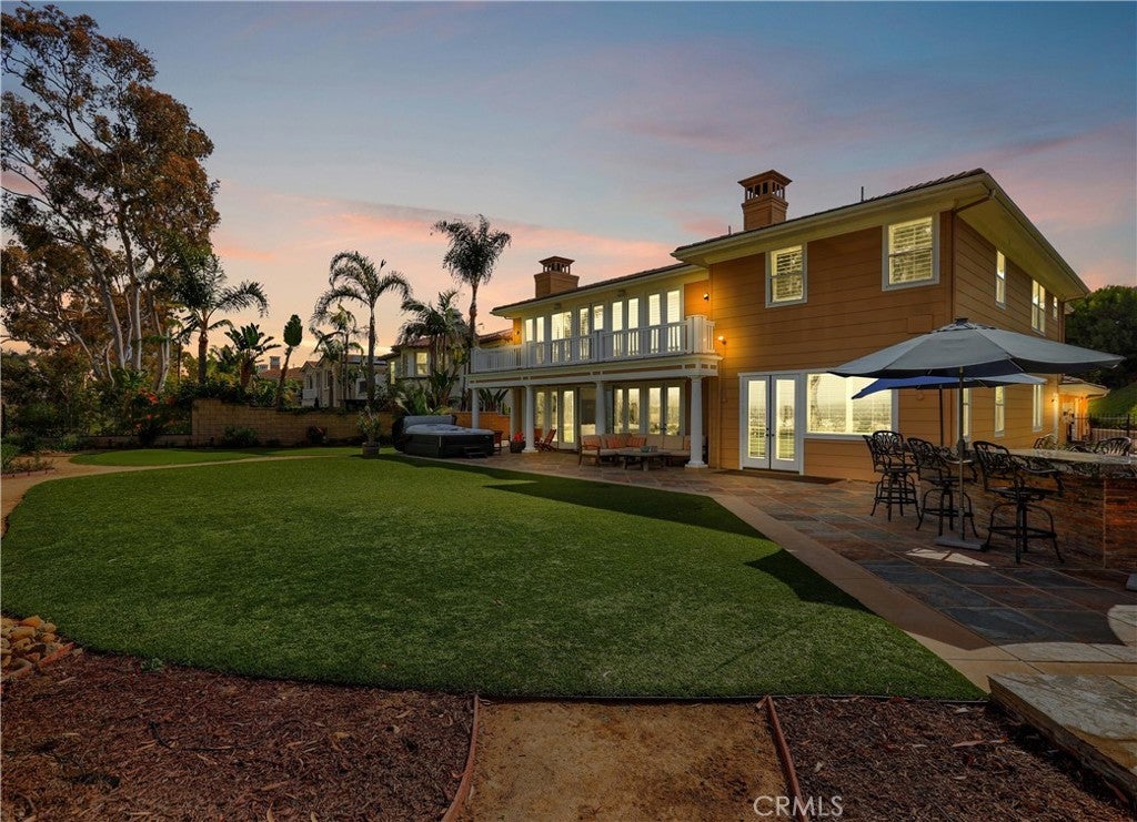 Exclusive Bal Harbour gated community, prime oversized lot at the end of a quiet cul-de-sac, breathtaking panoramic Saddleback Mountain and city light views, cool ocean breezes, expansive well-designed floor plan, sophisticated interior design, Solar system, huge entertainer’s dream backyard, and an amazing location close to Iconic Dana Point Harbor, what more could you desire! This home has it all!!! Handsome exterior features, highly manicured landscaping, and a stately, wrought iron double door entry create a dramatic first impression. Step through the sun filled foyer into the open concept formal living and dining space, blessed with an inviting fireplace, wet bar with wine cooler, and spectacular sit-down views through the wall-to-wall French doors opening to the backyard, the perfect indoor-outdoor living space for entertaining. The exquisitely updated gourmet kitchen boasts sparkling Quartzite countertops and fully tiled backsplash, stainless steel appliances, professional grade refrigerator and gas range, double ovens, center prep island with vegetable sink, breakfast bar and eat-in nook, and is open to the family room and fireplace with French doors opening to the backyard. Main level includes a highly desirable In-Law suite with French doors opening to the front courtyard for private access. Travel up the light filled staircase with upgraded wrought iron bannisters, to the breathtaking primary suite with romantic fireplace, retreat sitting area, a wall of windows filling the room with natural light, and French doors opening to the large private balcony taking full advantage of the spectacular views. The handsome primary bath has elegant cabinetry, dual vanities, a decadent soaking tub, vanity area, an oversized step in shower, his & her toilets, and a beautifully designed walk-in closet with built-in organizers. The upstairs level also includes guest bedrooms, all with En-Suite bathrooms, and an executive home office. The huge backyard with a covered patio and expansive lawn, Jacuzzi Spa, built-in bar and BBQ, outdoor fireplace, seating areas, putting greens, mature fruit trees, veggie boxes, glass fencing, and picturesque Pepper Trees provide an ideal setting for hosting parties and enjoying breathtaking views, cool ocean breezes, and 4th of July Fireworks. Walking distance to Doheny and Dana Point Harbor, hiking and biking on San Juan Creek Trail, a short stroll to St Edwards School, and close to an abundance of shopping and dining venues.