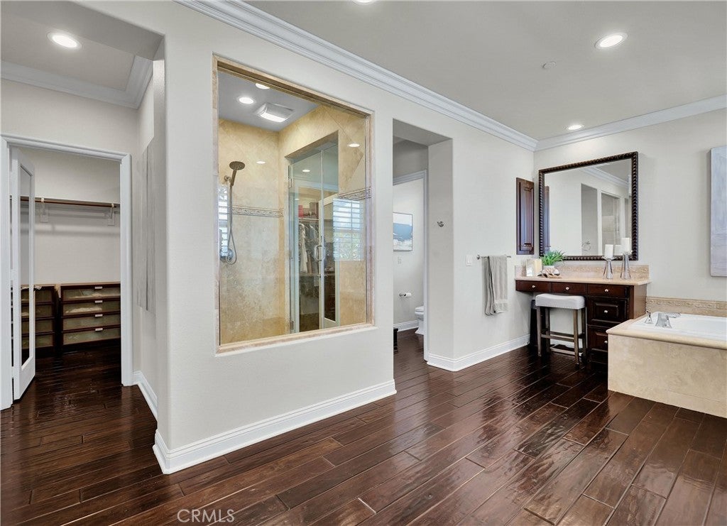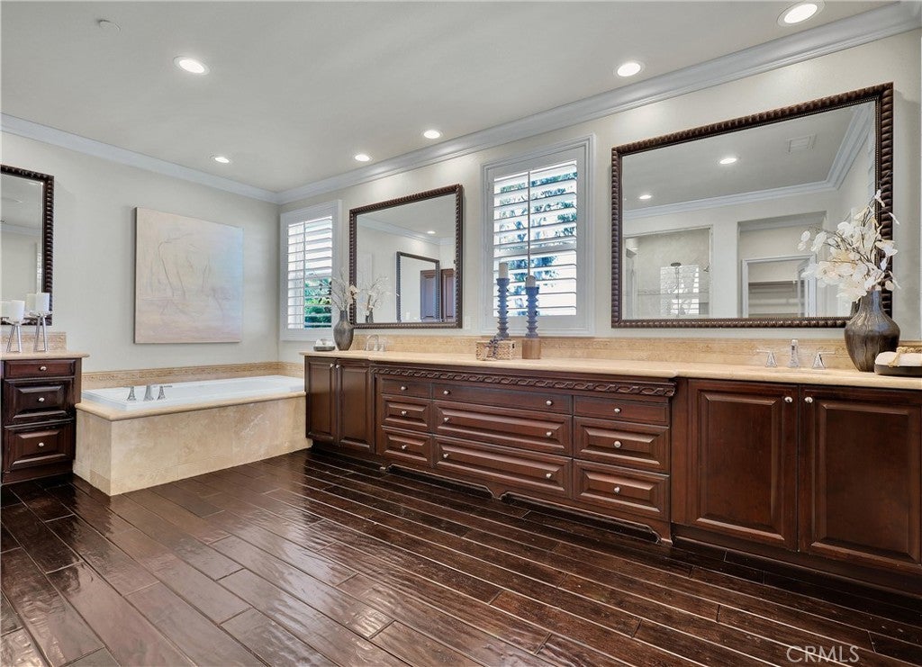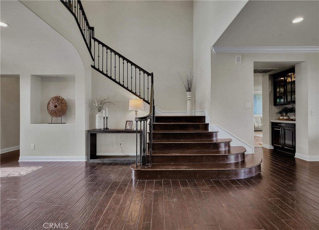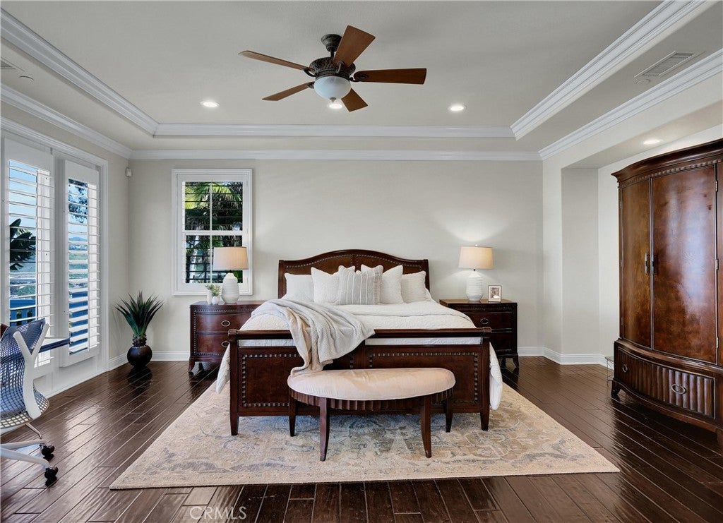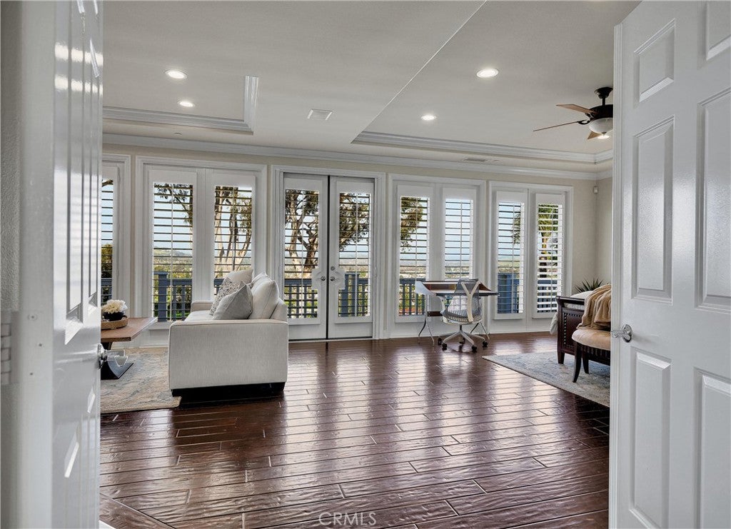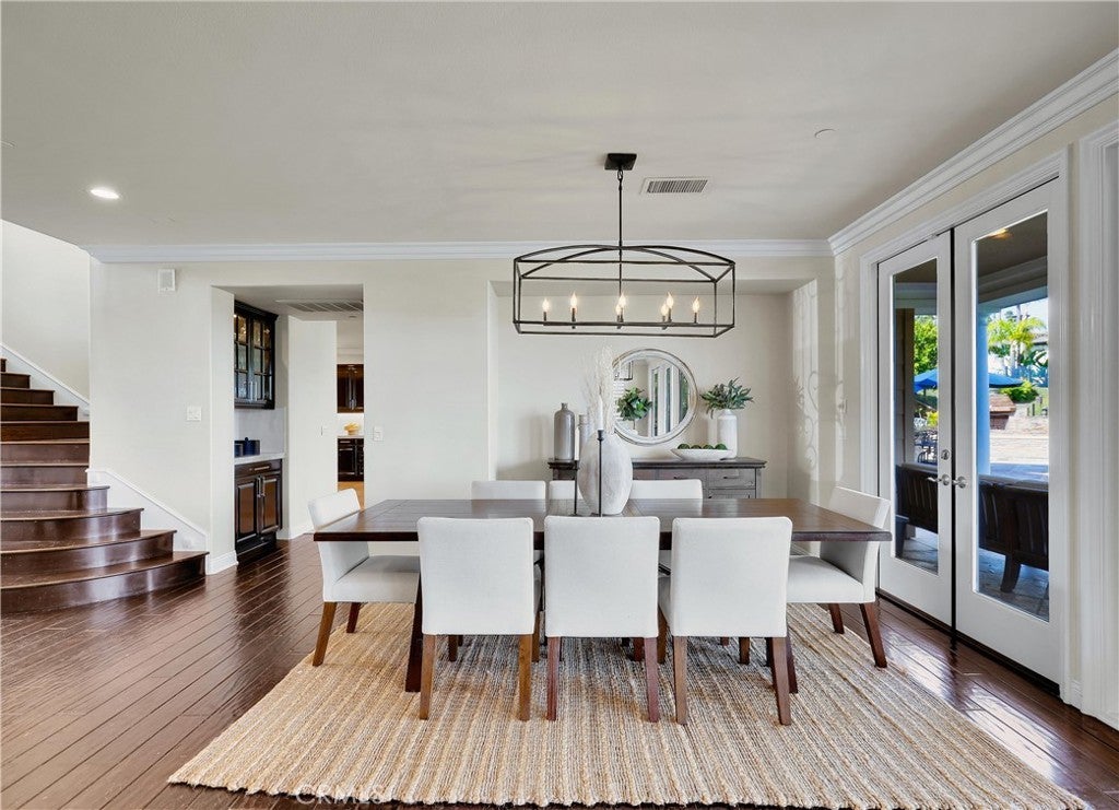 Exclusive Bal Harbour gated community, prime oversized lot at the end of a quiet cul-de-sac, breathtaking panoramic Saddleback Mountain and city light views, cool ocean breezes, expansive well-designed floor plan, sophisticated interior design, Solar system, huge entertainer’s dream backyard, and an amazing location close to Iconic Dana Point Harbor, what more could you desire! This home has it all!!! Handsome exterior features, highly manicured landscaping, and a stately, wrought iron double door entry create a dramatic first impression. Step through the sun filled foyer into the open concept formal living and dining space, blessed with an inviting fireplace, wet bar with wine cooler, and spectacular sit-down views through the wall-to-wall French doors opening to the backyard, the perfect indoor-outdoor living space for entertaining. The exquisitely updated gourmet kitchen boasts sparkling Quartzite countertops and fully tiled backsplash, stainless steel appliances, professional grade refrigerator and gas range, double ovens, center prep island with vegetable sink, breakfast bar and eat-in nook, and is open to the family room and fireplace with French doors opening to the backyard. Main level includes a highly desirable In-Law suite with French doors opening to the front courtyard for private access. Travel up the light filled staircase with upgraded wrought iron bannisters, to the breathtaking primary suite with romantic fireplace, retreat sitting area, a wall of windows filling the room with natural light, and French doors opening to the large private balcony taking full advantage of the spectacular views. The handsome primary bath has elegant cabinetry, dual vanities, a decadent soaking tub, vanity area, an oversized step in shower, his & her toilets, and a beautifully designed walk-in closet with built-in organizers. The upstairs level also includes guest bedrooms, all with En-Suite bathrooms, and an executive home office. The huge backyard with a covered patio and expansive lawn, Jacuzzi Spa, built-in bar and BBQ, outdoor fireplace, seating areas, putting greens, mature fruit trees, veggie boxes, glass fencing, and picturesque Pepper Trees provide an ideal setting for hosting parties and enjoying breathtaking views, cool ocean breezes, and 4th of July Fireworks. Walking distance to Doheny and Dana Point Harbor, hiking and biking on San Juan Creek Trail, a short stroll to St Edwards School, and close to an abundance of shopping and dining venues.