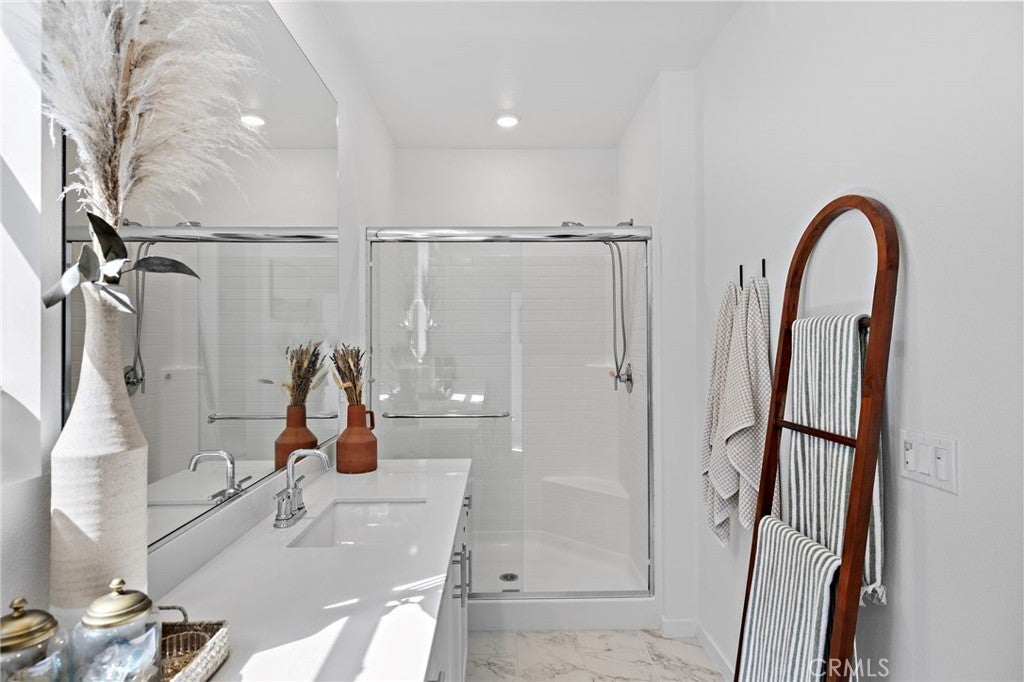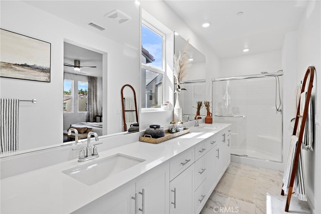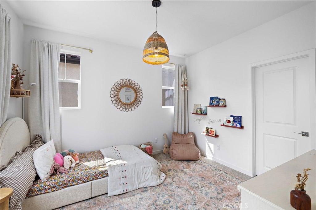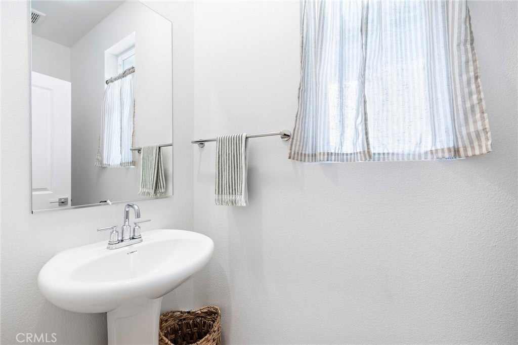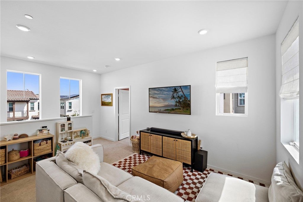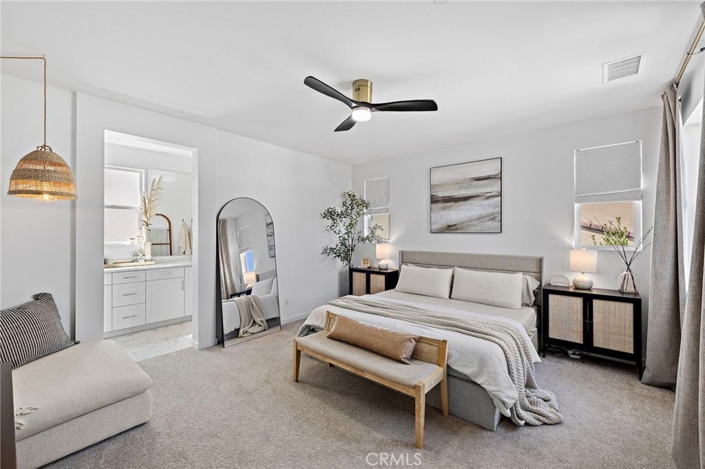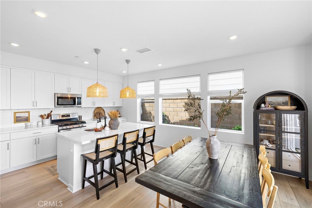 This stunning detached home with solar panels is located in the gated Bedford community offering 3 bedrooms plus a versatile loft. Designed with an open-concept layout, the home features luxury vinyl plank flooring, modern white cabinetry, and quartz countertops throughout. The spacious living room is filled with natural light from surrounding windows and flows seamlessly into the kitchen, which offers ample storage, stainless steel appliances, and a large Quartz island with sink and seating that opens to the dining area and overlooks the backyard. Upstairs, a centrally located loft sits between all bedrooms—perfect for a family room, game room, or study. The expansive primary suite features a comfortable seating area, walk-in closet, and an en-suite bathroom with tile flooring, dual vanity, and a large glass-enclosed shower. A convenient upstairs laundry room completes the second level. The thoughtfully designed backyard offers a balanced blend of hardscape and green space, creating a functional and inviting outdoor setting. This turnkey home showcases Mediterranean-inspired architecture paired with modern finishes and energy efficiency. Residents enjoy resort-style community amenities including a pool, spa, fitness center, clubhouse, dog park, scenic walking trails, and playgrounds. Ideally located near shopping, schools, and the 15 freeway, and backing to Eagle Glen Golf Course, this home offers both comfort and convenience.