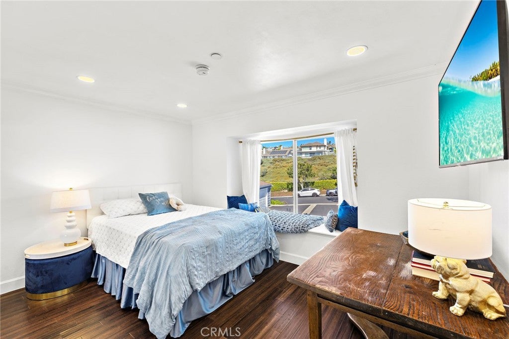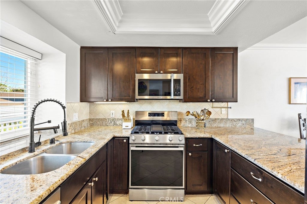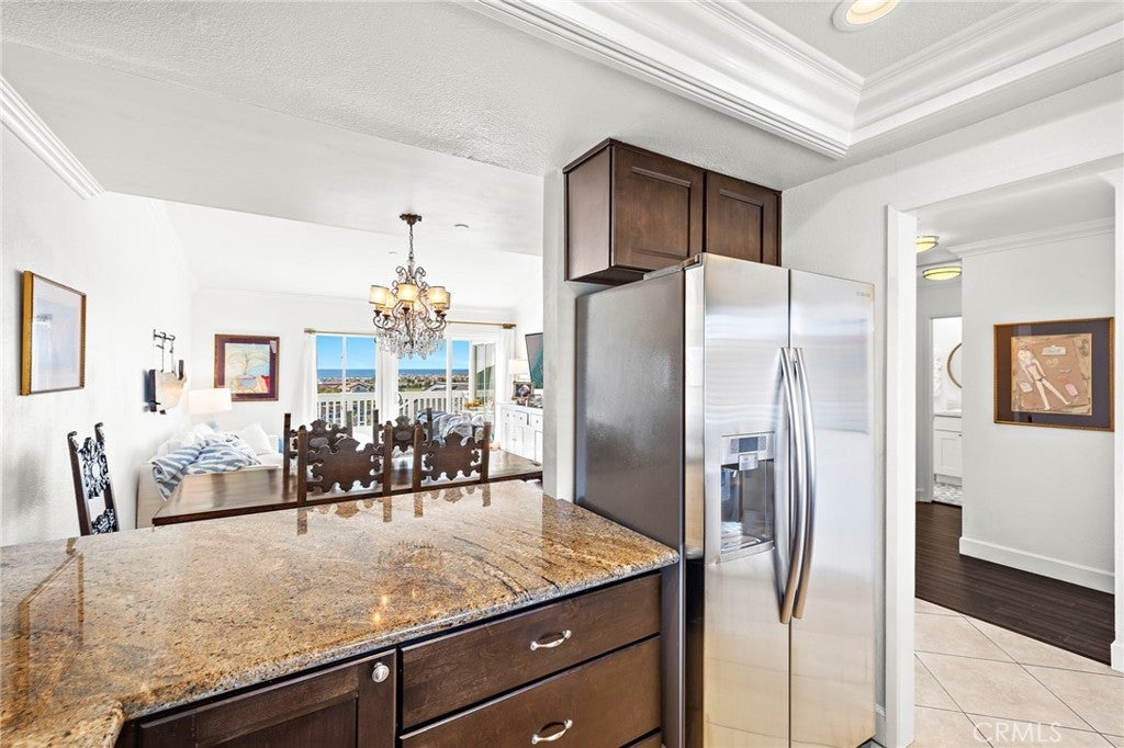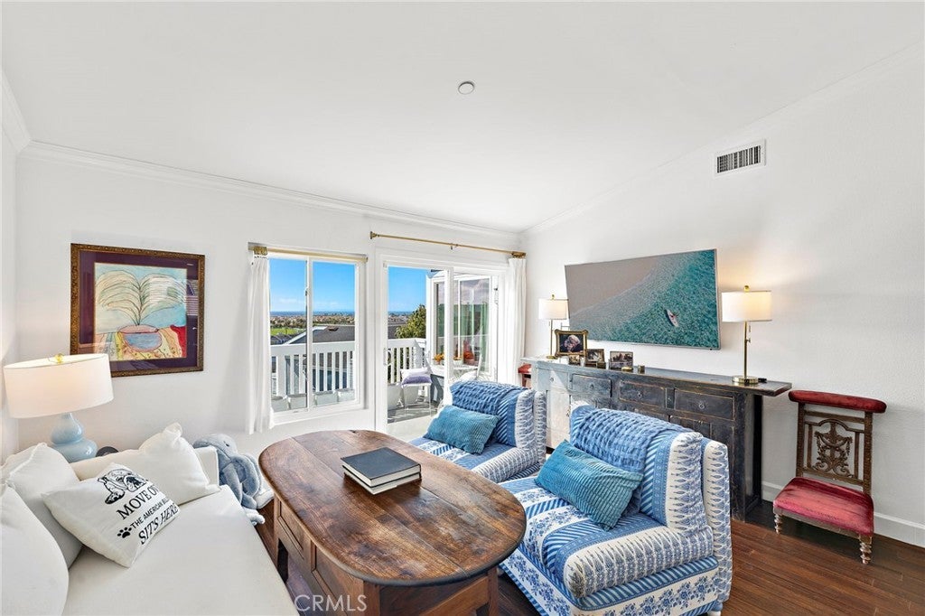 Set high in Faire Harbour within the Marblehead community, 2127 Avenida Espada is a top-floor, single-level residence with rare sit-down ocean views stretching to Catalina Island and settling into sweeping sunsets. From this elevated position, the Pacific becomes part of your everyday backdrop, shifting in color and mood from morning light to golden hour. Inside, vaulted ceilings and rich hardwood floors create a warm, airy atmosphere that feels refined yet relaxed. The living, dining, and kitchen spaces flow naturally together, oriented toward the patio and the coastline beyond. Ocean views are enjoyed throughout, from the main living areas to the kitchen and into the primary bedroom, creating a true horizon experience rather than a distant glimpse. The kitchen features clean-lined cabinetry, stone countertops, a coordinating backsplash, stainless steel appliances, recessed lighting, under-cabinet illumination, and a breakfast bar that keeps the space open and inviting. Gas cooking and air conditioning add everyday comfort, while dual-pane Anlin windows, crown moulding, and thoughtful detailing bring a finished, cohesive feel. Both bathrooms are well-appointed with a consistent, elevated aesthetic that complements the home’s contemporary coastal style. The tiled patio extends the living space outdoors, offering an easy place to begin the day with ocean air or settle in as the sun drops into the Pacific. A private two-car garage, a rare offering within Faire Harbour, adds a level of convenience and storage not often found in this community. Faire Harbour’s location in Marblehead offers a peaceful, elevated setting close to beaches, coastal trails, Avenida Del Mar, local dining, and the Outlets at San Clemente, with convenient access to the 5 freeway and Pacific Coast Highway. This is a home that blends view, comfort, and location into one cohesive experience, elevated above the coastline and grounded in the rhythm of a vibrant beach town.